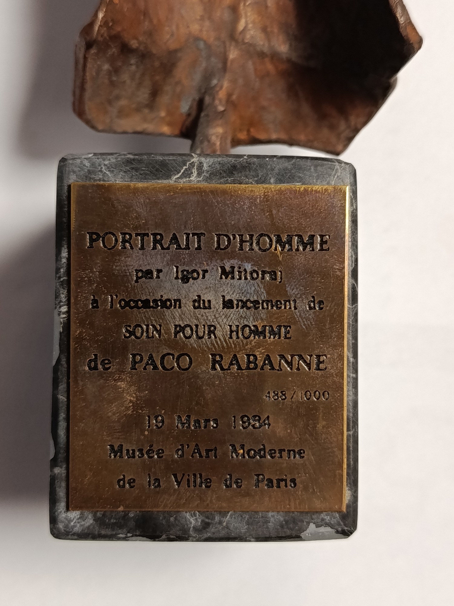 z tyłu tabliczka z napisem: PORTRAIT D’HOMME/par Igor Mitoraj/a` l’occasion du lancement de/SOIN POUR HOMME/de PACO RABANNE