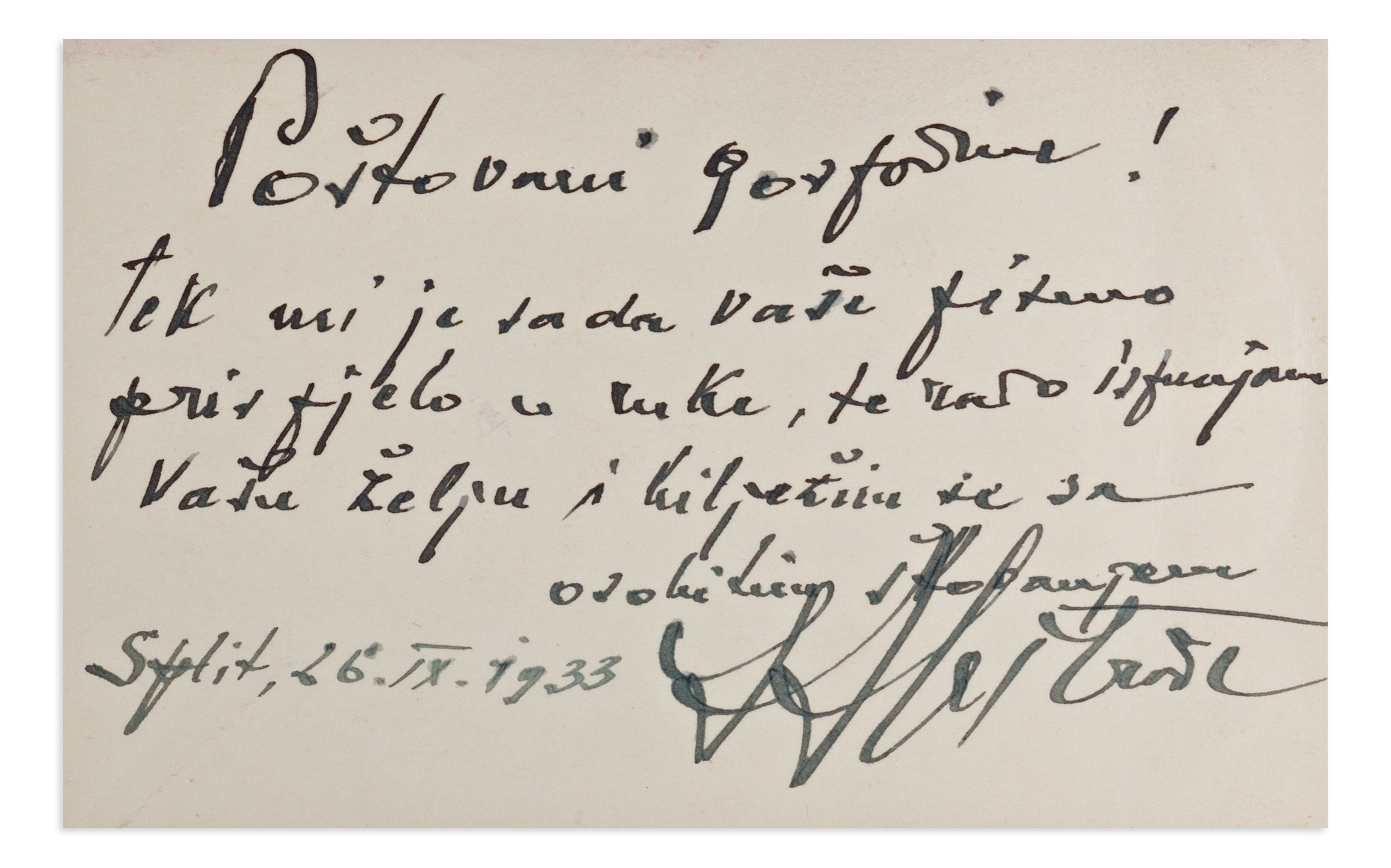 Handwritten letter by the renowned Croatian sculptor Ivan Meštrović, written and signed in Split on September 26, 1933.Original text in Croatian: