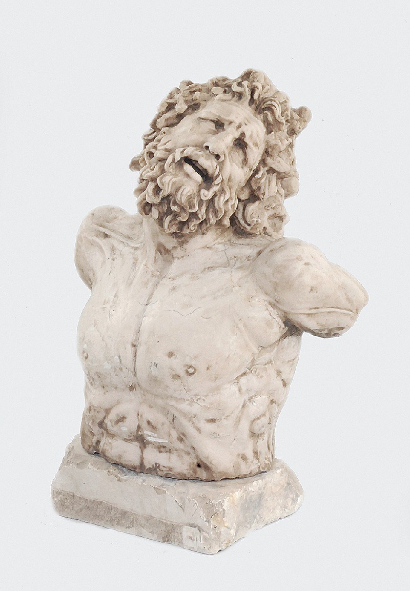 Popiersie mężczyzny o kędzierzawych, zmierzwionych włosach, brodzie i wąsach; głowa przechylona w prawo i lekko do tyłu; zmieniona cierpieniem twarz ze zmarszczonym czołem i rozchylonymi do krzyku ustami; tors nagi, z zaznaczoną muskulaturą, bez ramion. Podstawa z nieregularnej bryły marmuru.