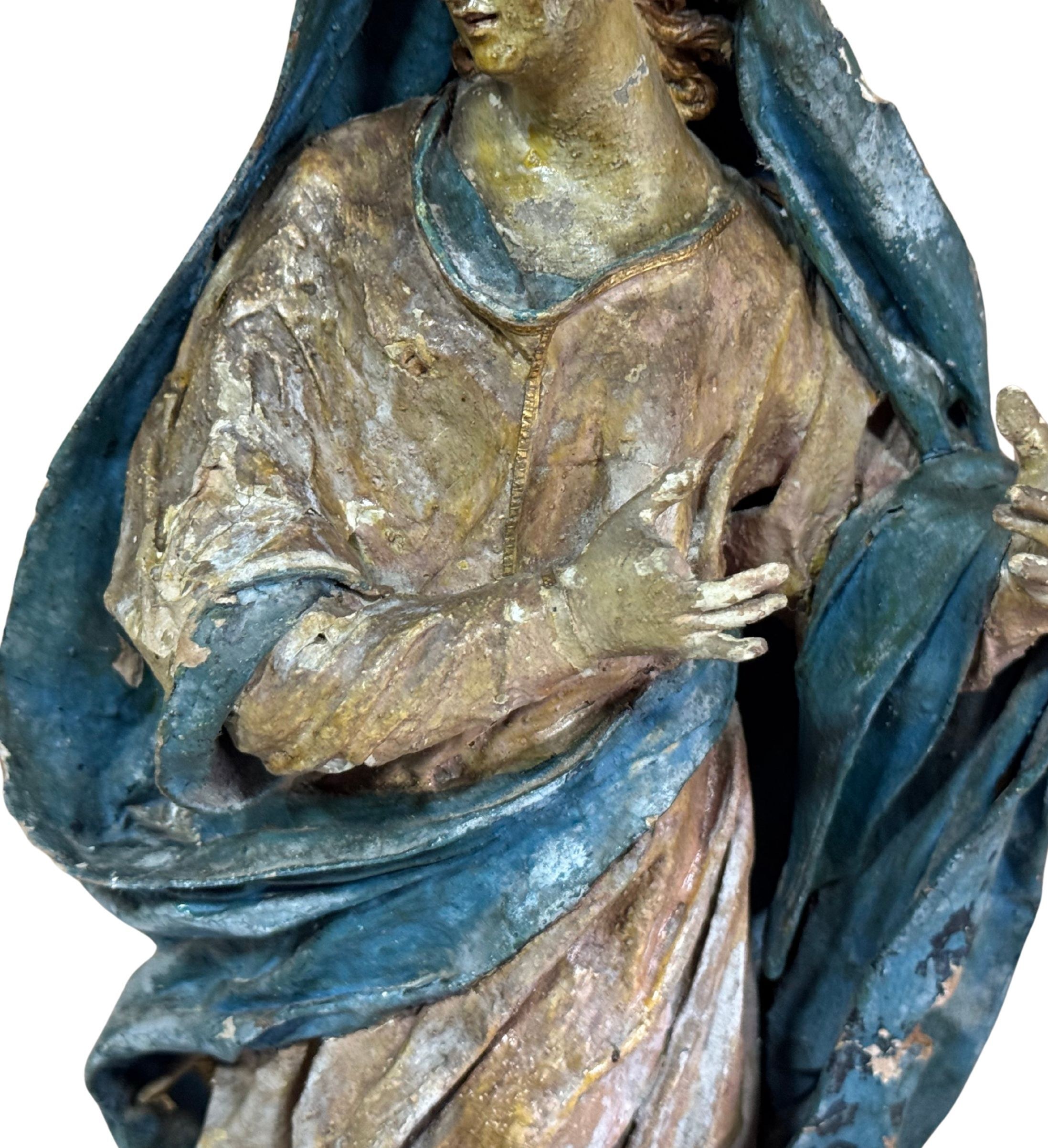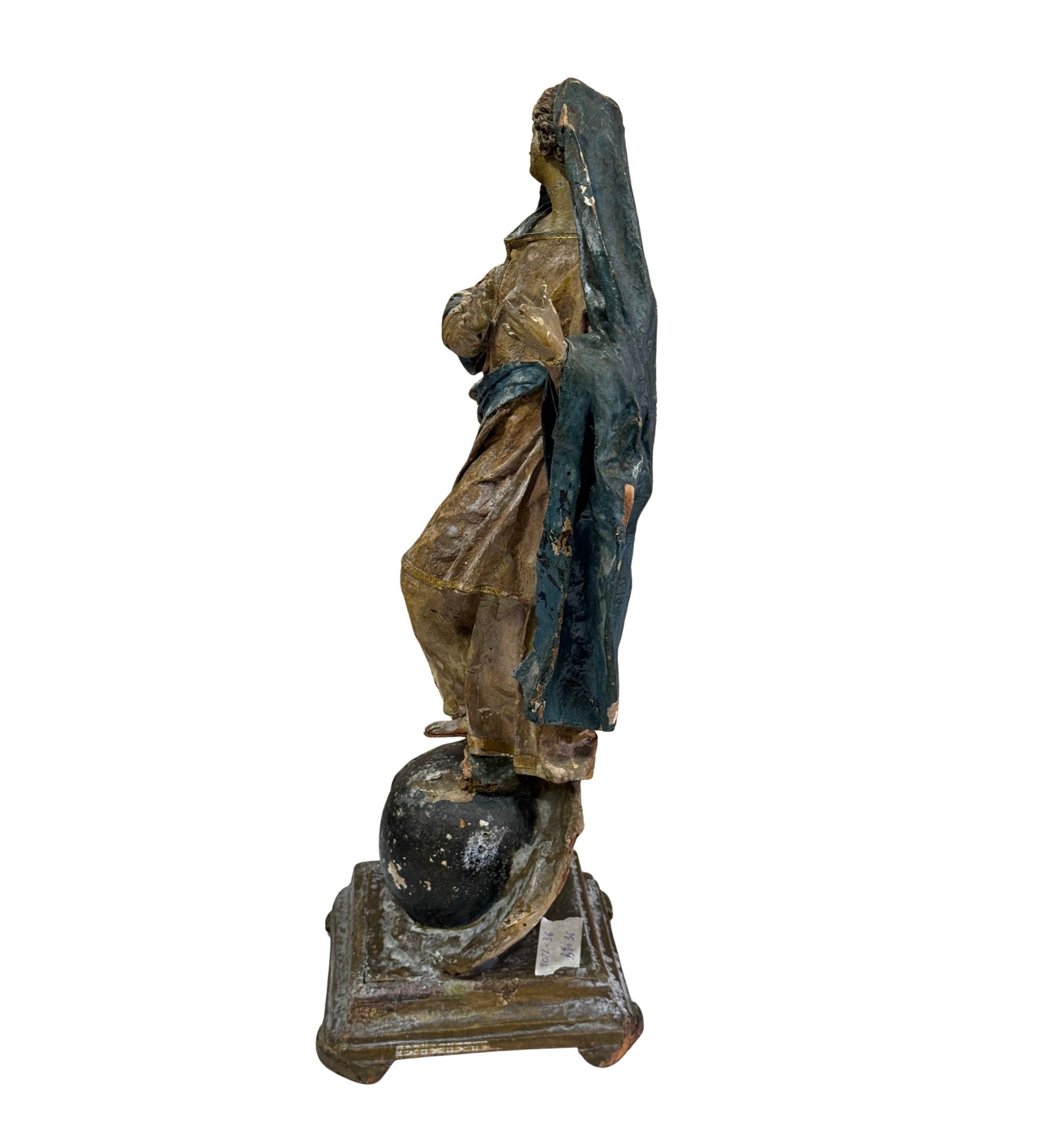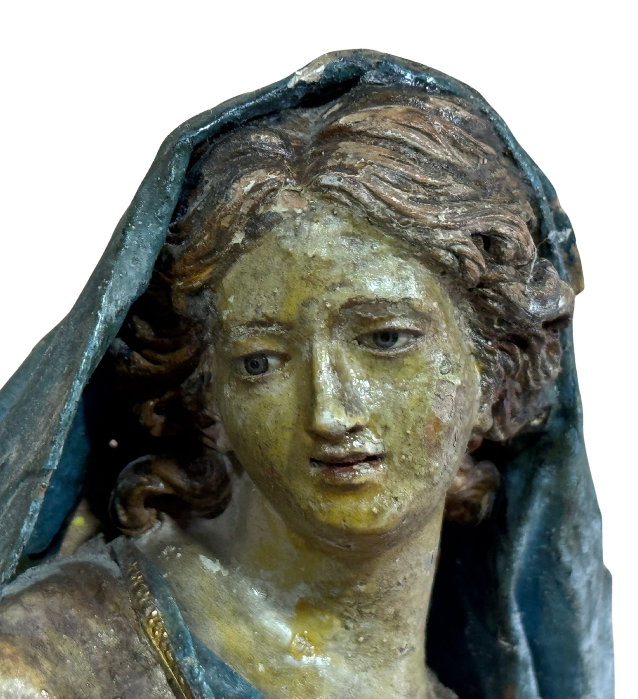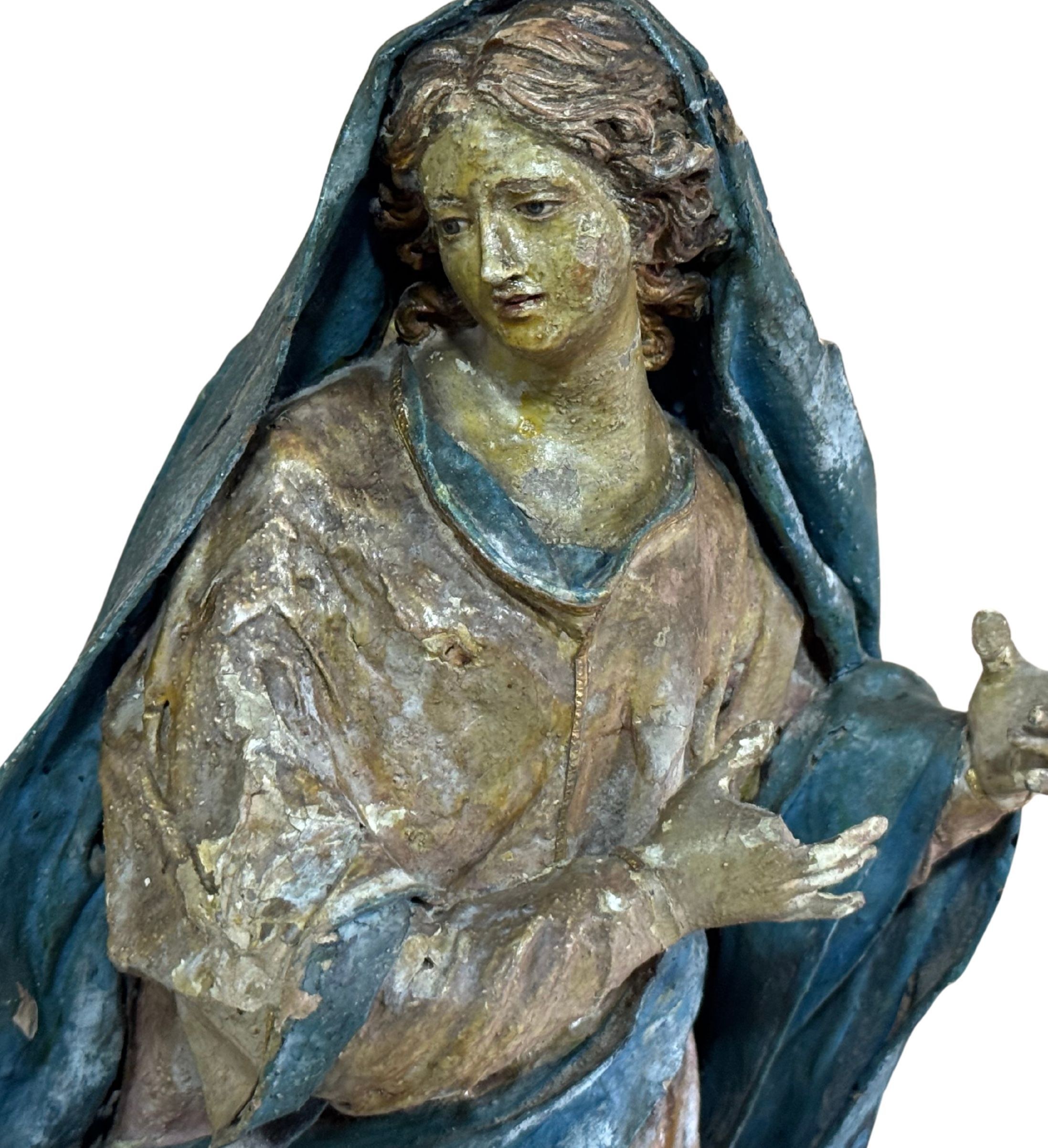Lecce papier-mâché sculpture, with head, hands, and feet in wood, glass eyes, and Lecce papier-mâché clothing. 19th century, depicting the Virgin. Dimensions: H55x19x19 cm. In fair condition with missing parts as shown in the attached photos.
