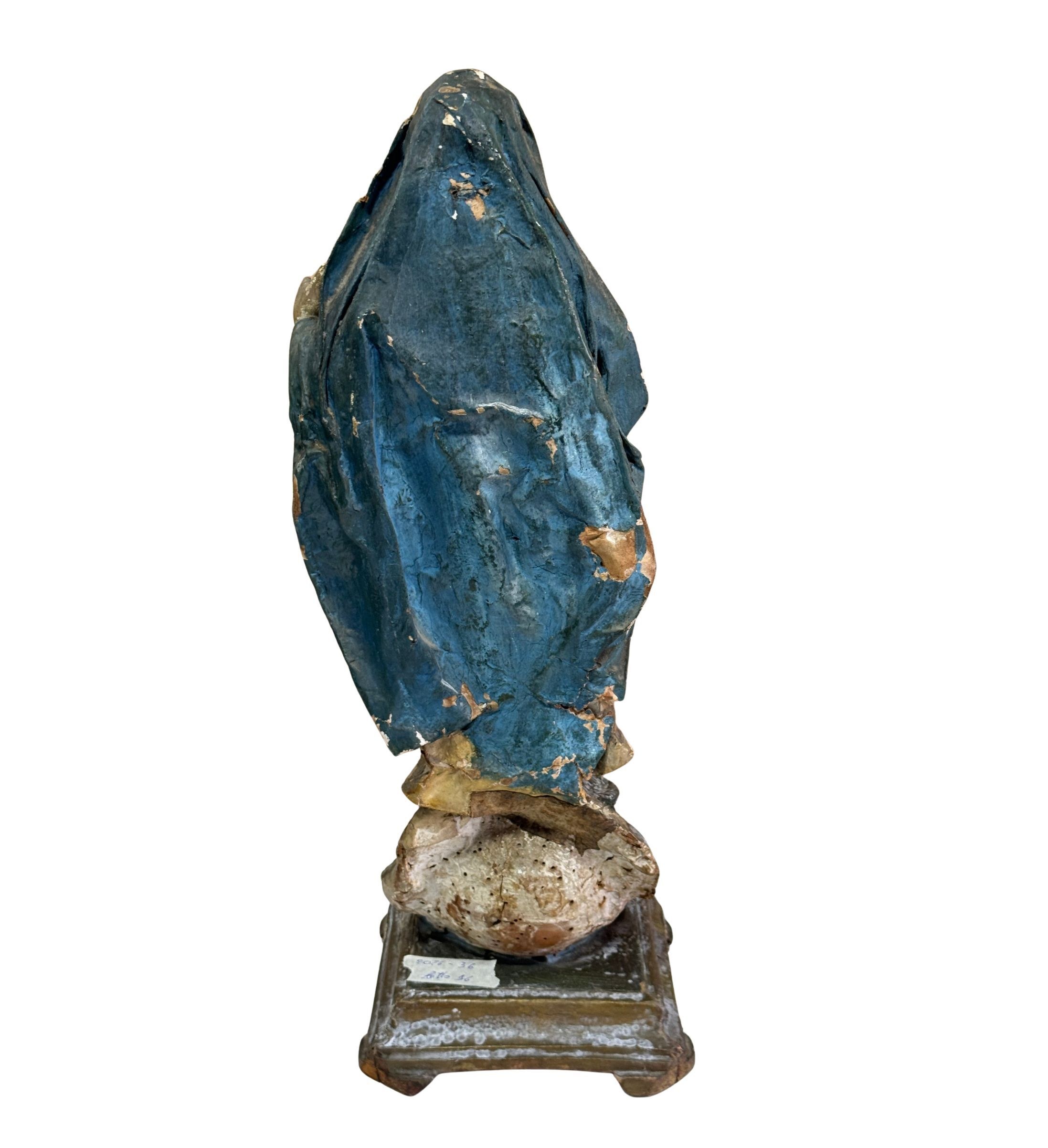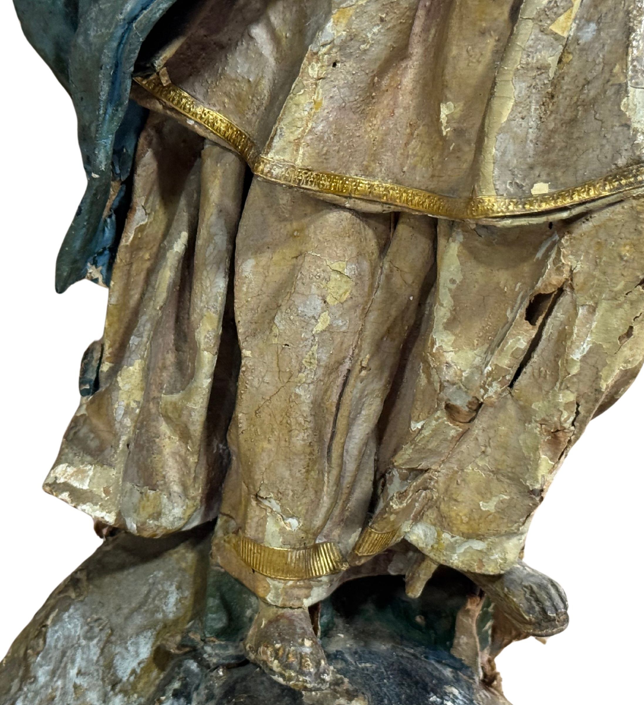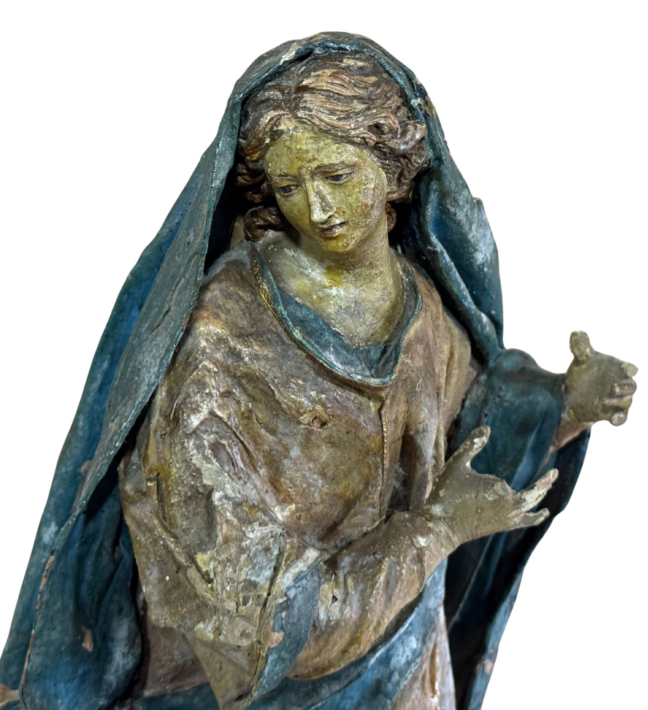 Lecce papier-mâché sculpture, with head, hands, and feet in wood, glass eyes, and Lecce papier-mâché clothing. 19th century, depicting the Virgin. Dimensions: H55x19x19 cm. In fair condition with missing parts as shown in the attached photos.