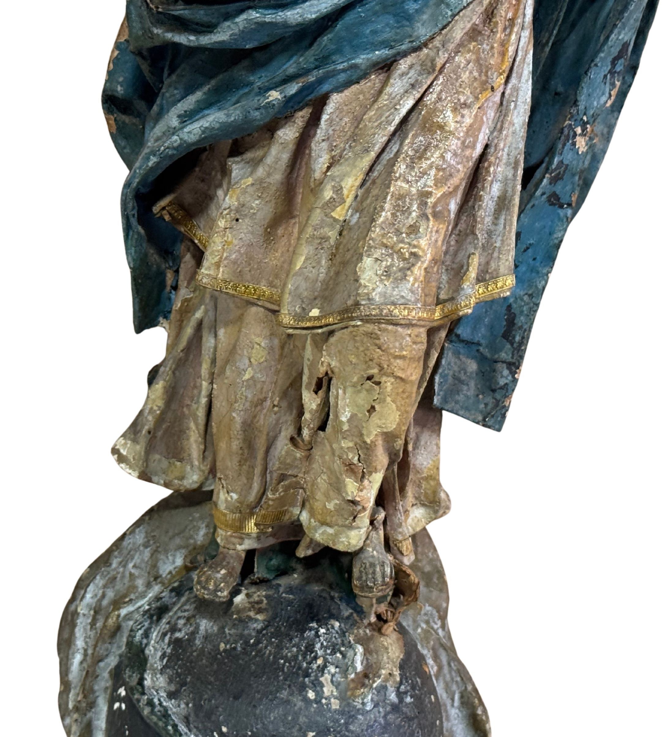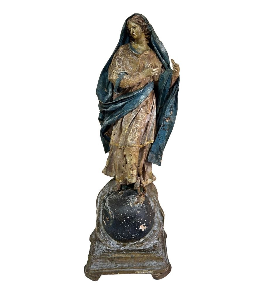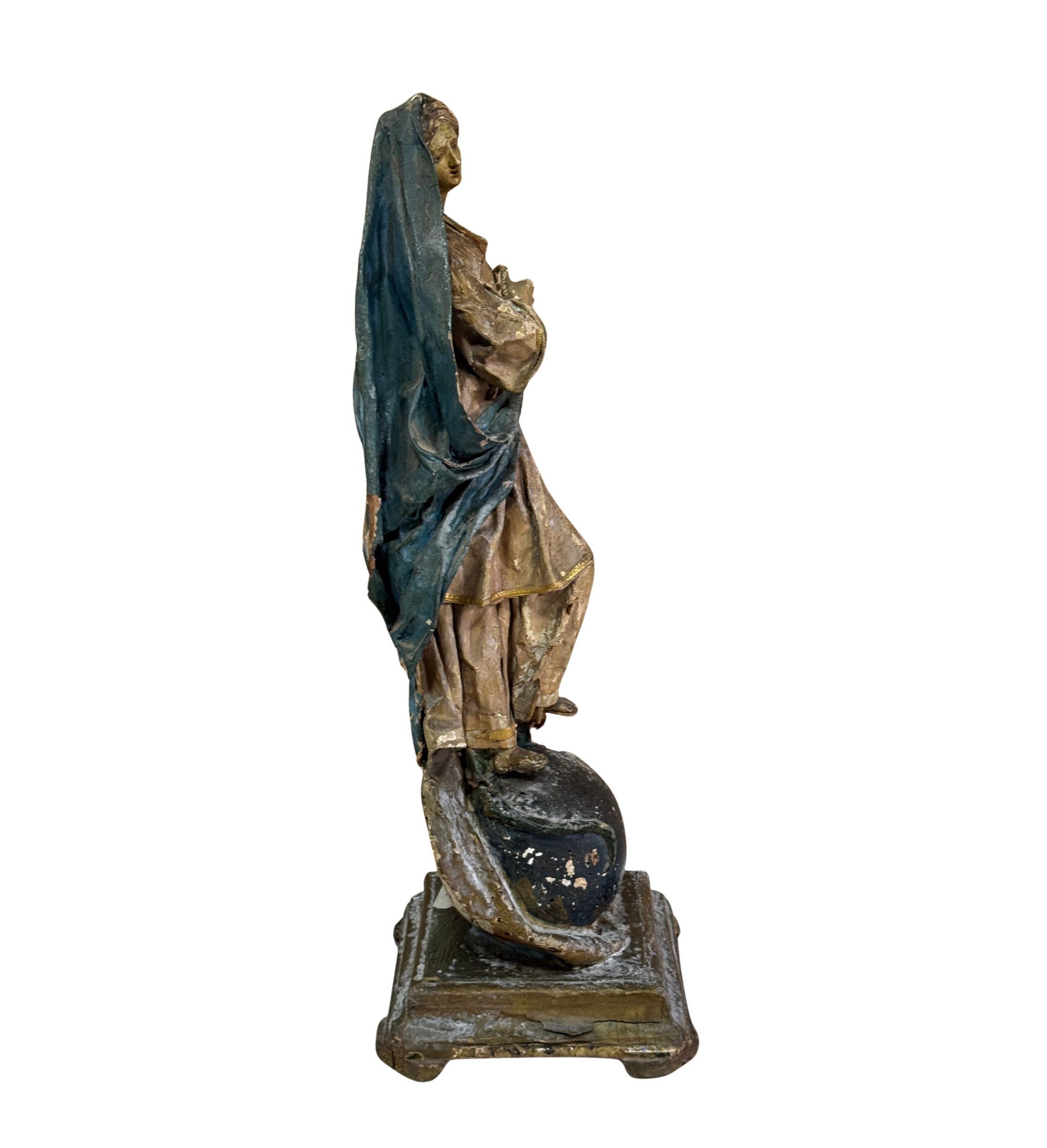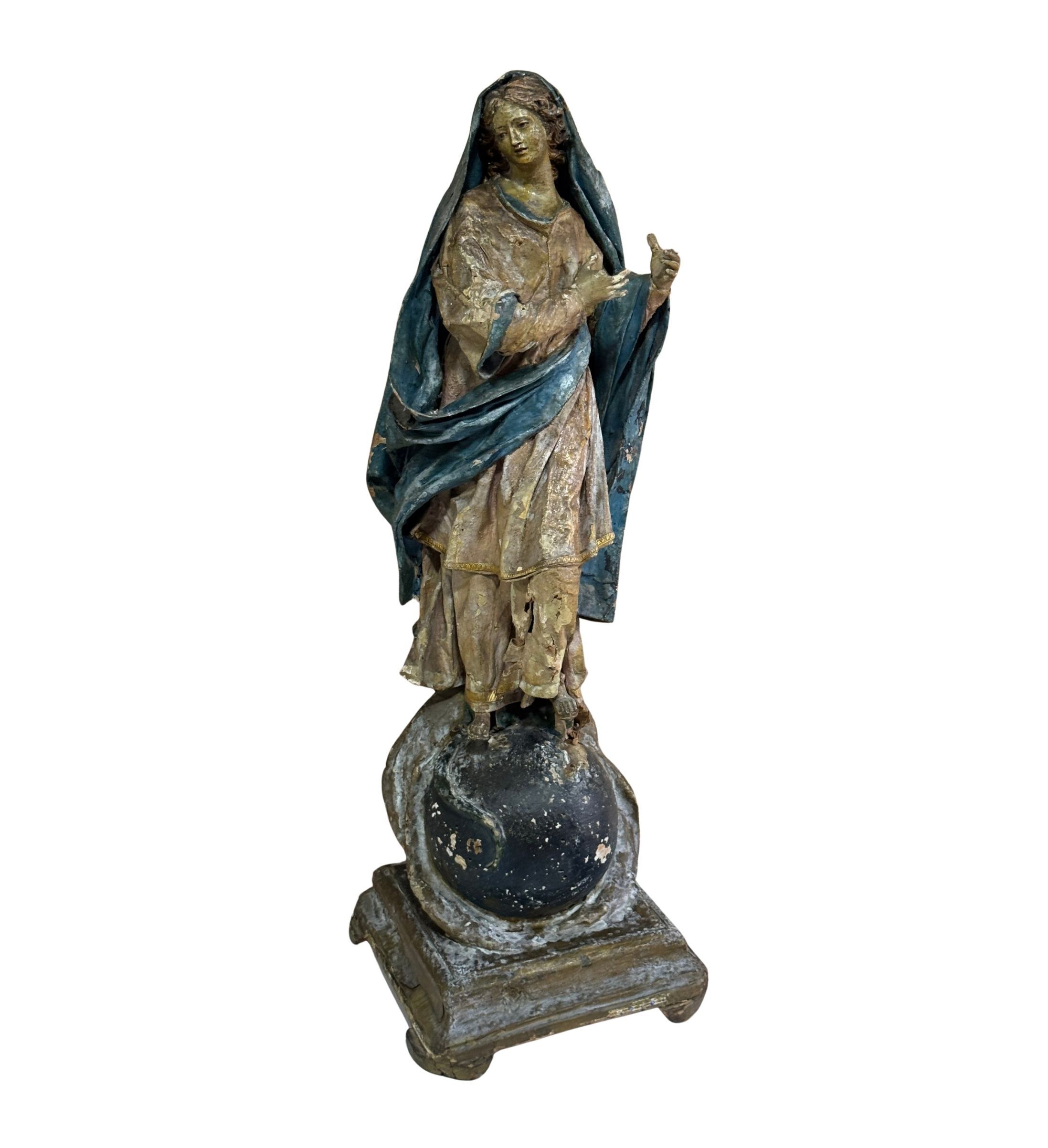Lecce papier-mâché sculpture, with head, hands, and feet in wood, glass eyes, and Lecce papier-mâché clothing. 19th century, depicting the Virgin. Dimensions: H55x19x19 cm. In fair condition with missing parts as shown in the attached photos.