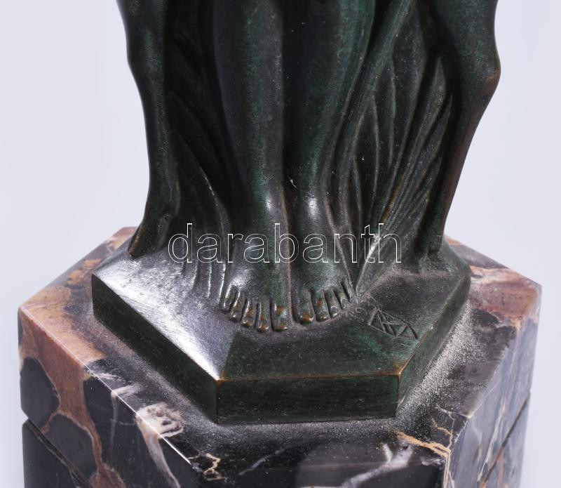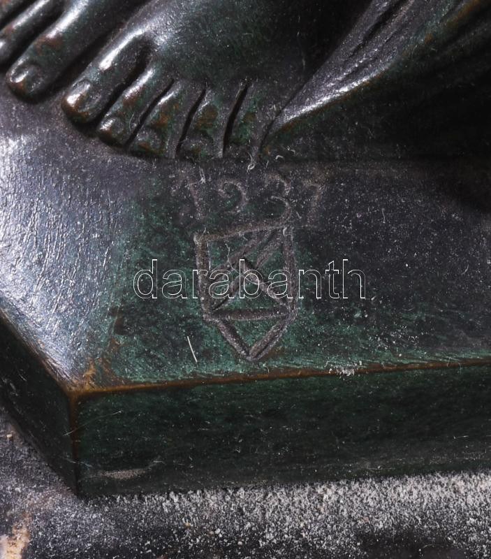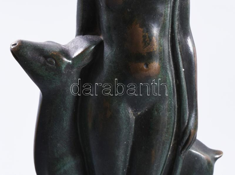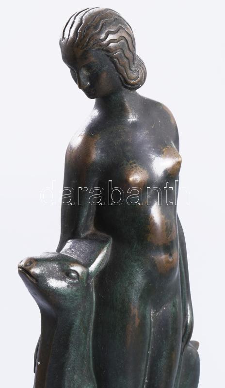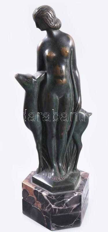 Liszkay Kováts Zoltán (1898-1967): Akt őzikével. Art deco patinázott bronz szobor, márvány talapzaton, cca 1930/40...