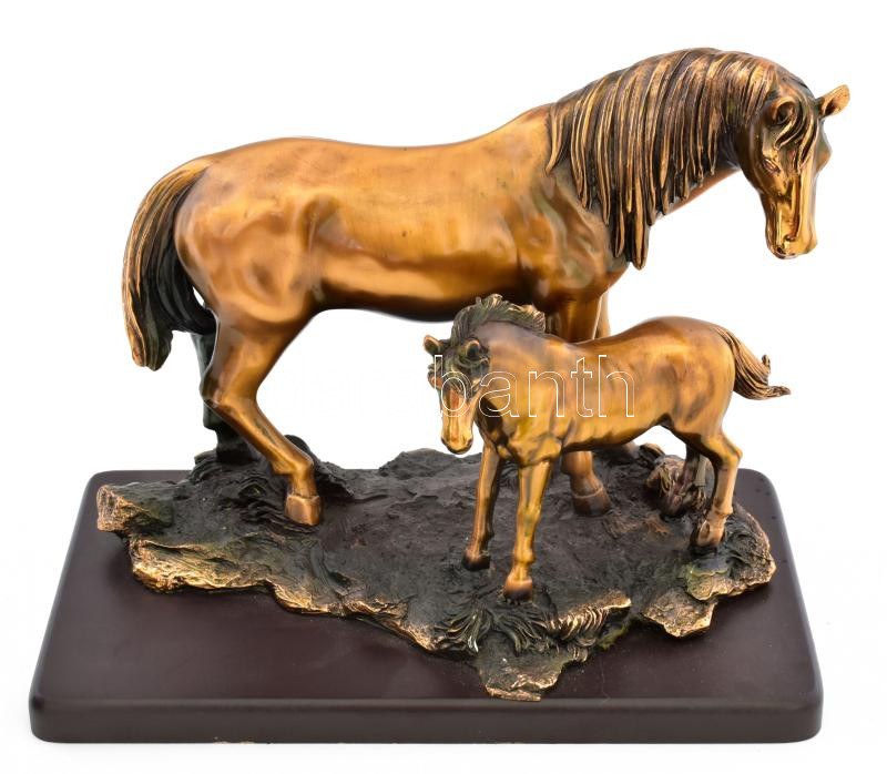 Ló csikójával. Műgyanta szobor préselt fa talpazaton, jelzés nélkül, kis kopással, 28x23x15 cm