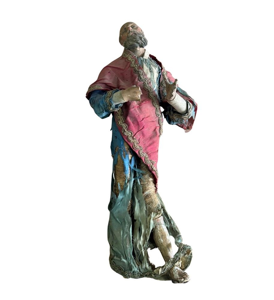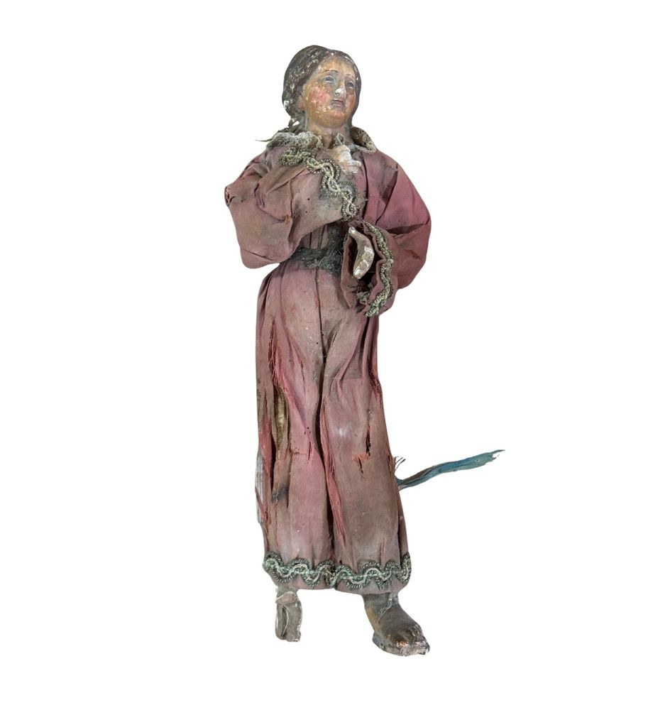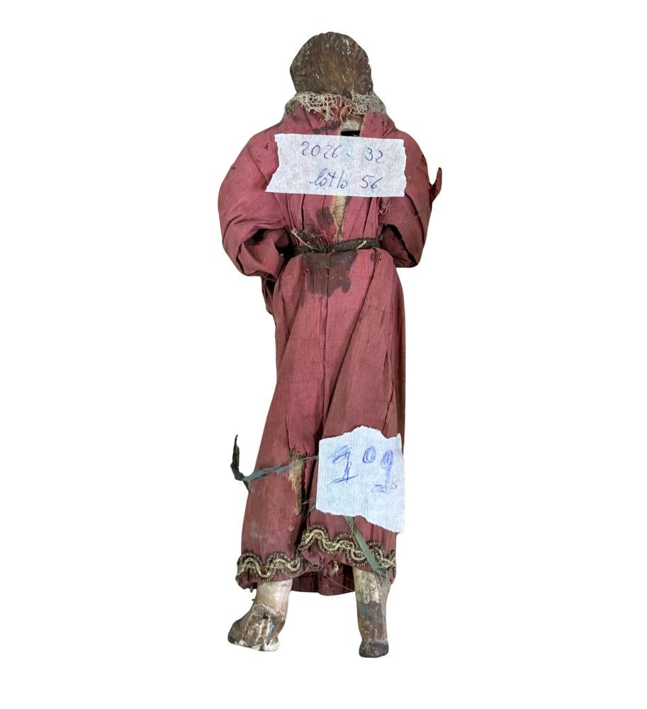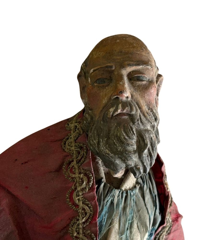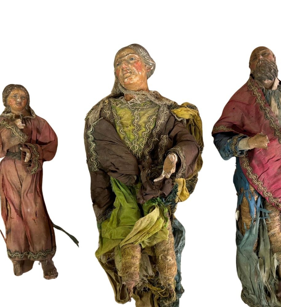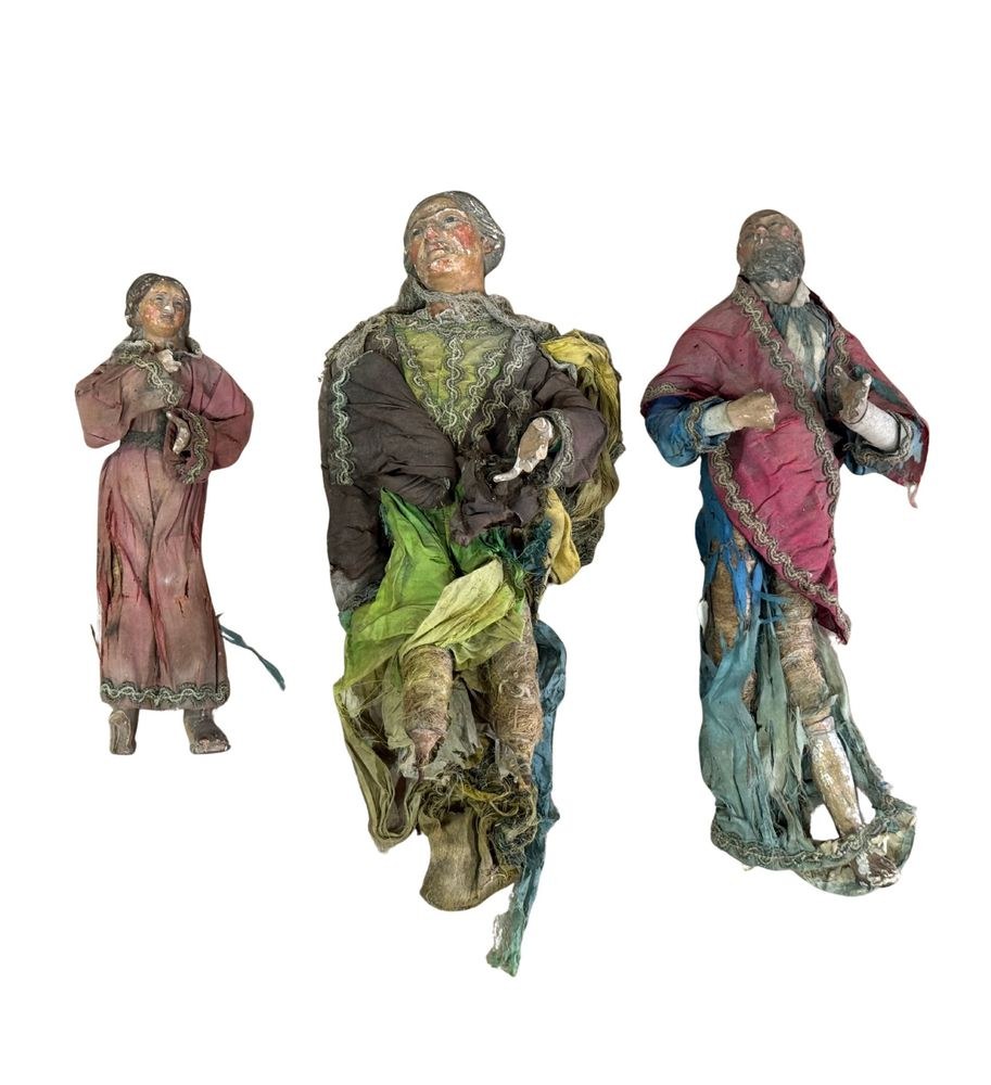 Lot of three Neapolitan nativity sculptures, 19th century period. Dimensions of two pieces: H38 cm. Dimensions of one piece: H27 cm. Requires restoration. Defects and missing parts present.