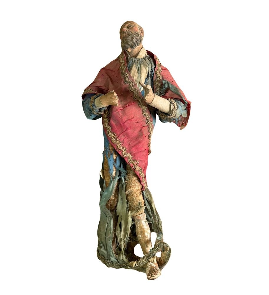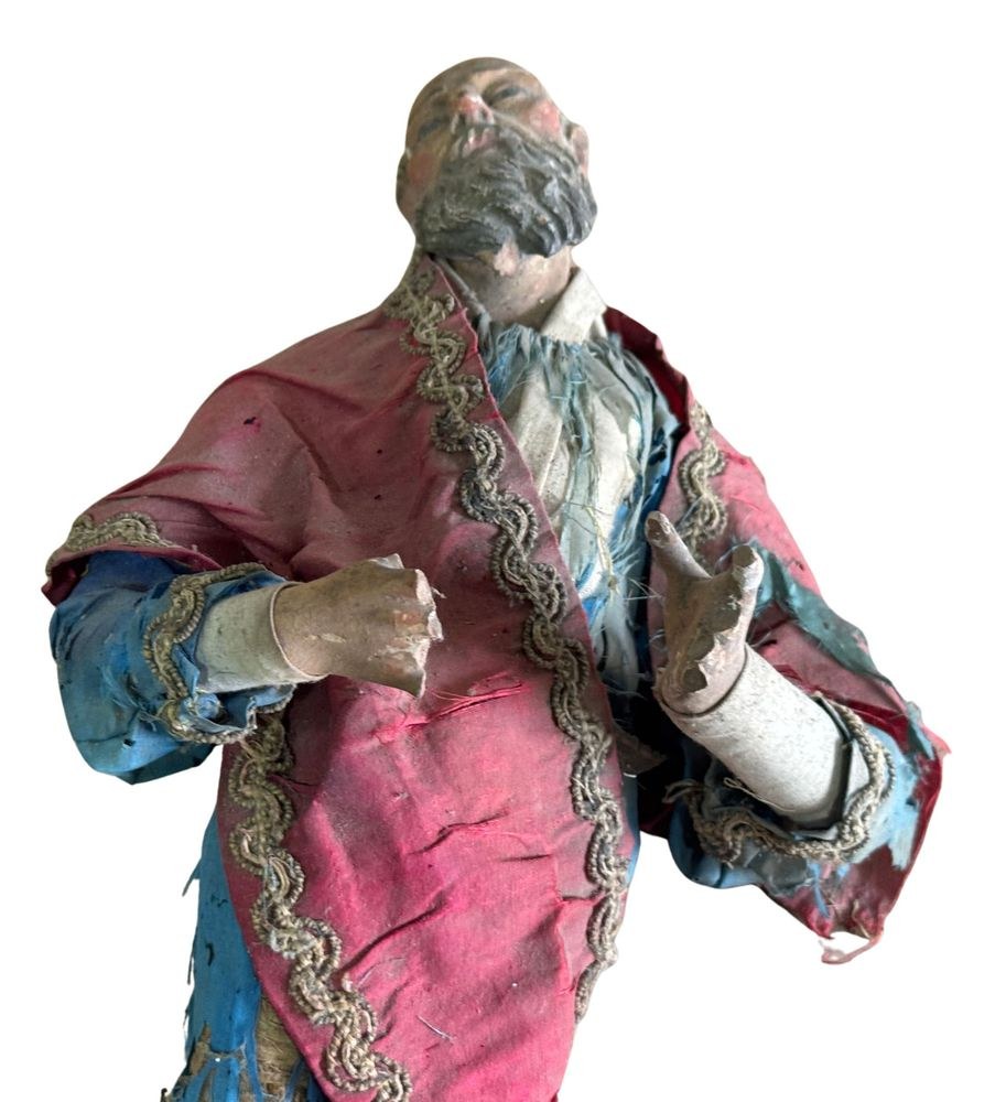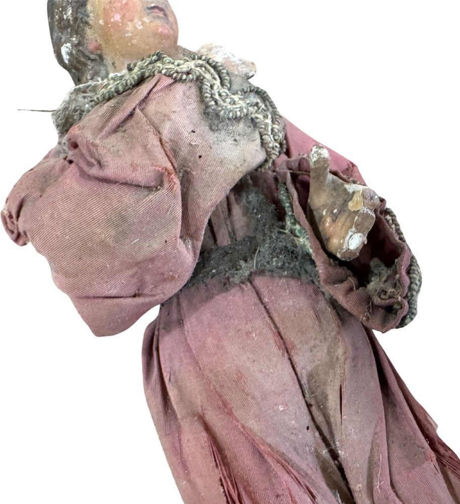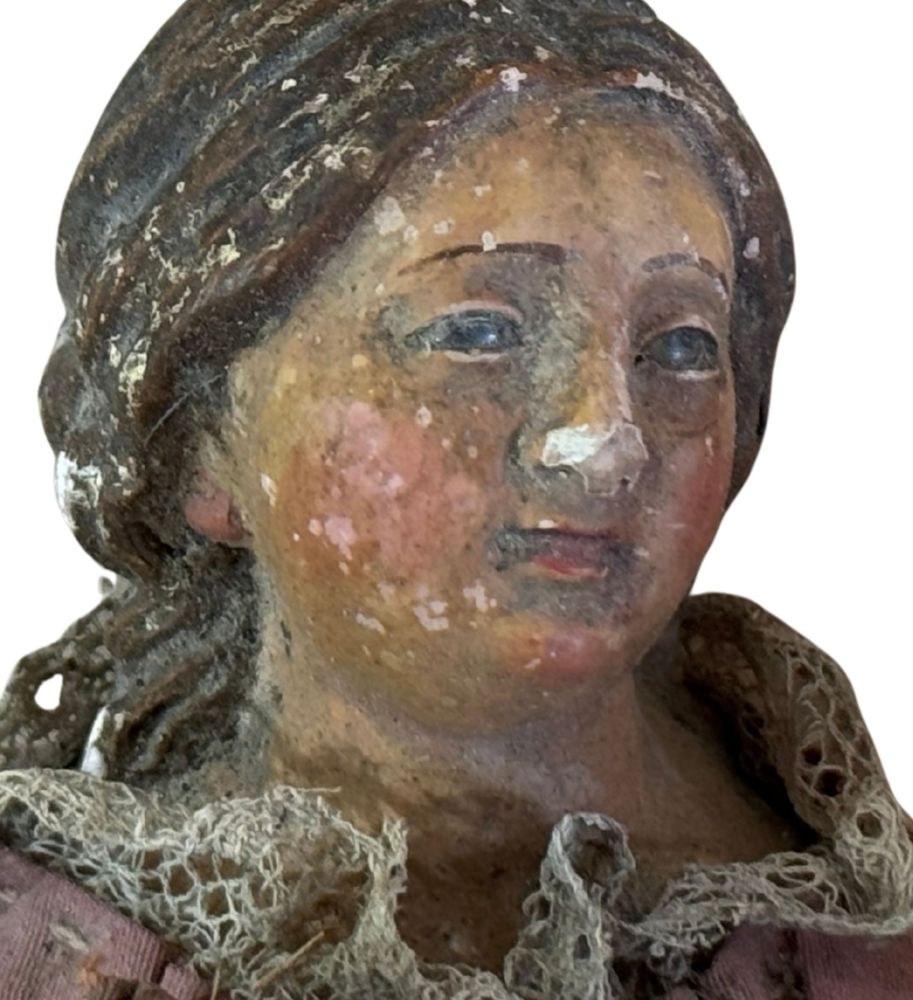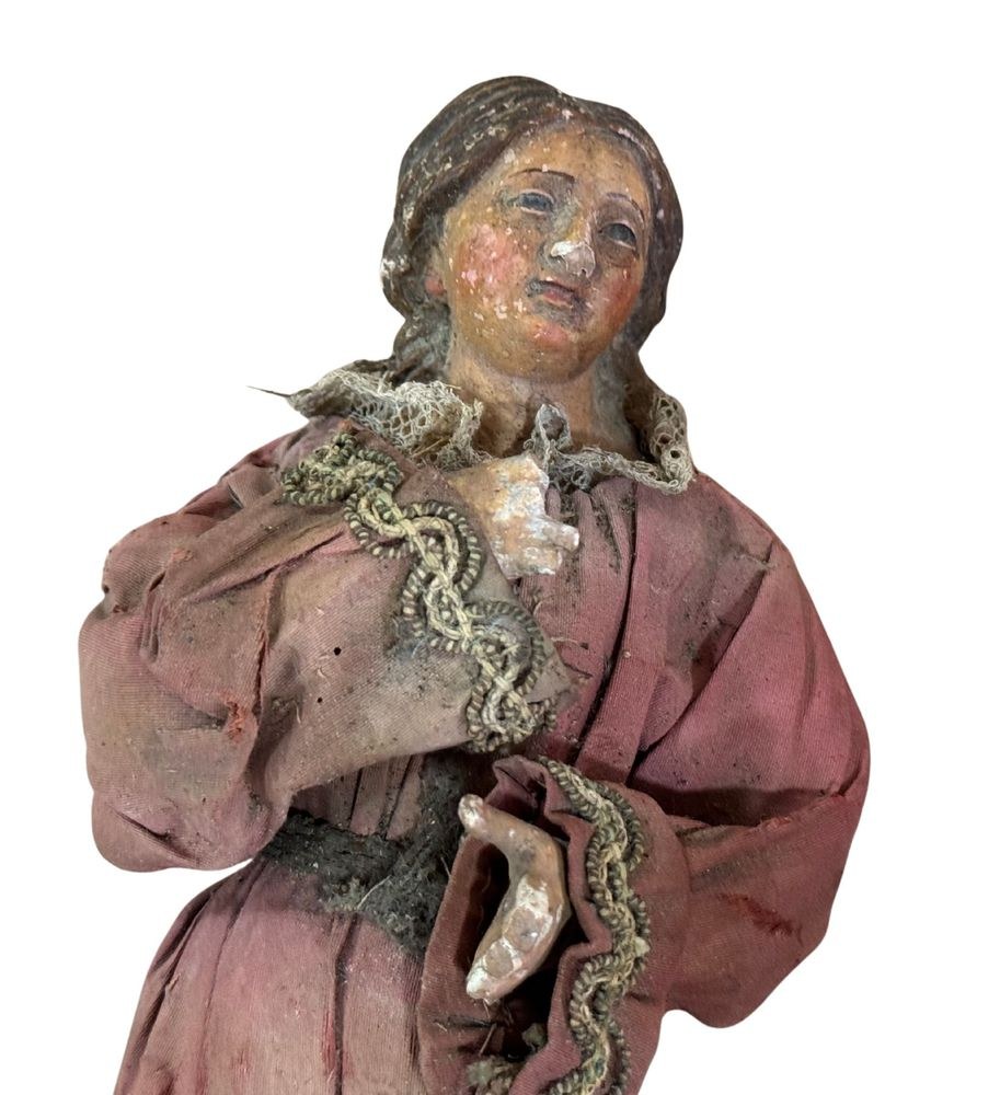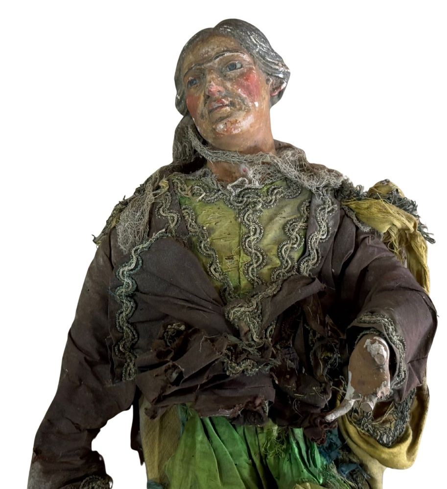 Lot of three Neapolitan nativity sculptures, 19th century period. Dimensions of two pieces: H38 cm. Dimensions of one piece: H27 cm. Requires restoration. Defects and missing parts present.