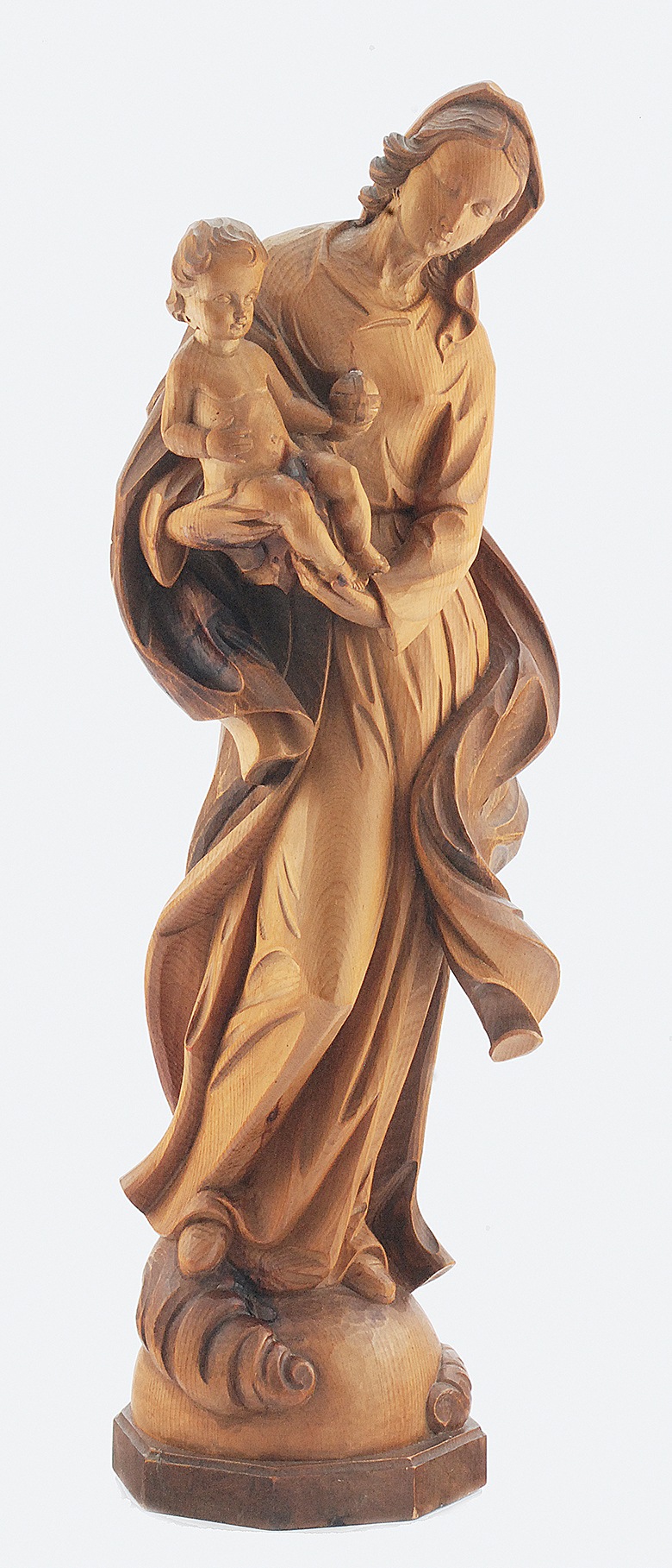 Figura stojąca na półkuli otoczonej obłokami, w lekkim kontrapoście, odziana w długą szatę i chustę na włosach; wokół korpusu wijący się, drapowany szal, podtrzymuje oburącz Dziecię dzierżące w lewej rączce jabłko królewskie. Na plecach rzeźby wyryty monogram wiązany: „WR”. Podstawa 8-boczna.