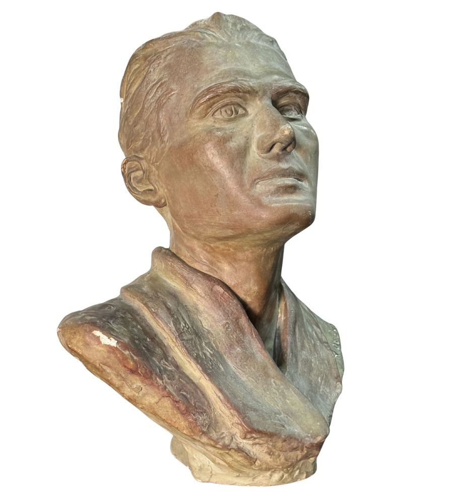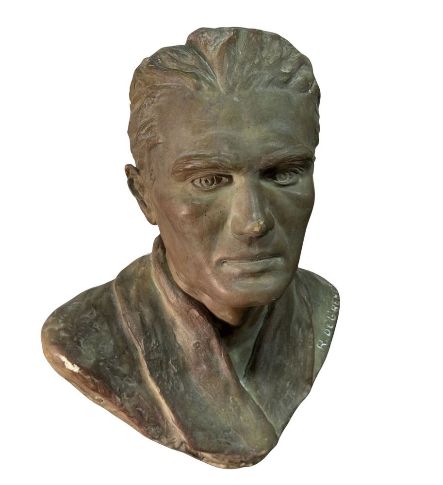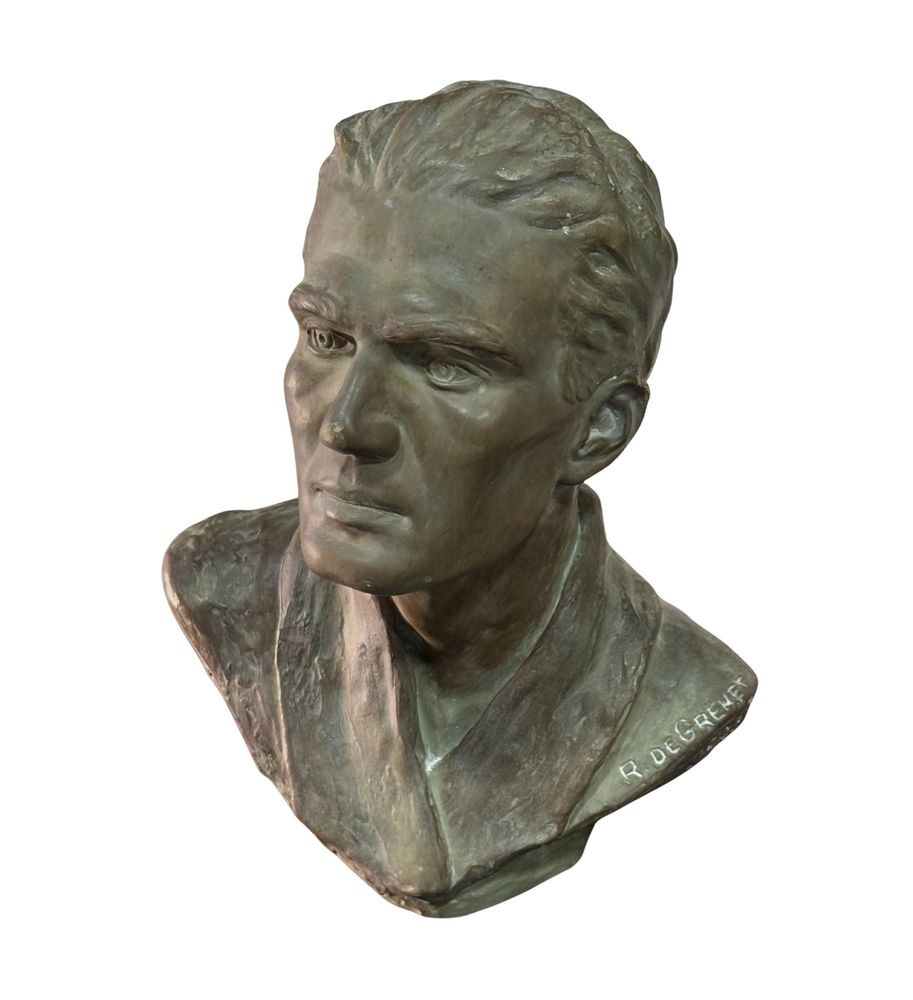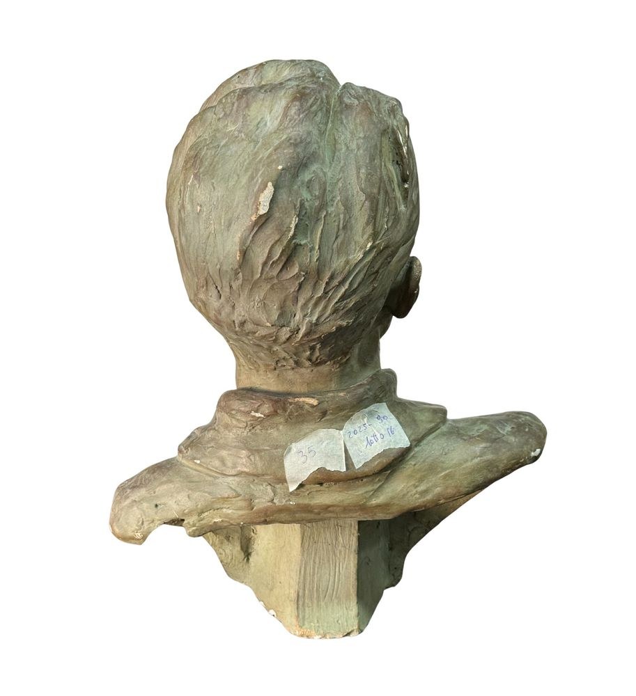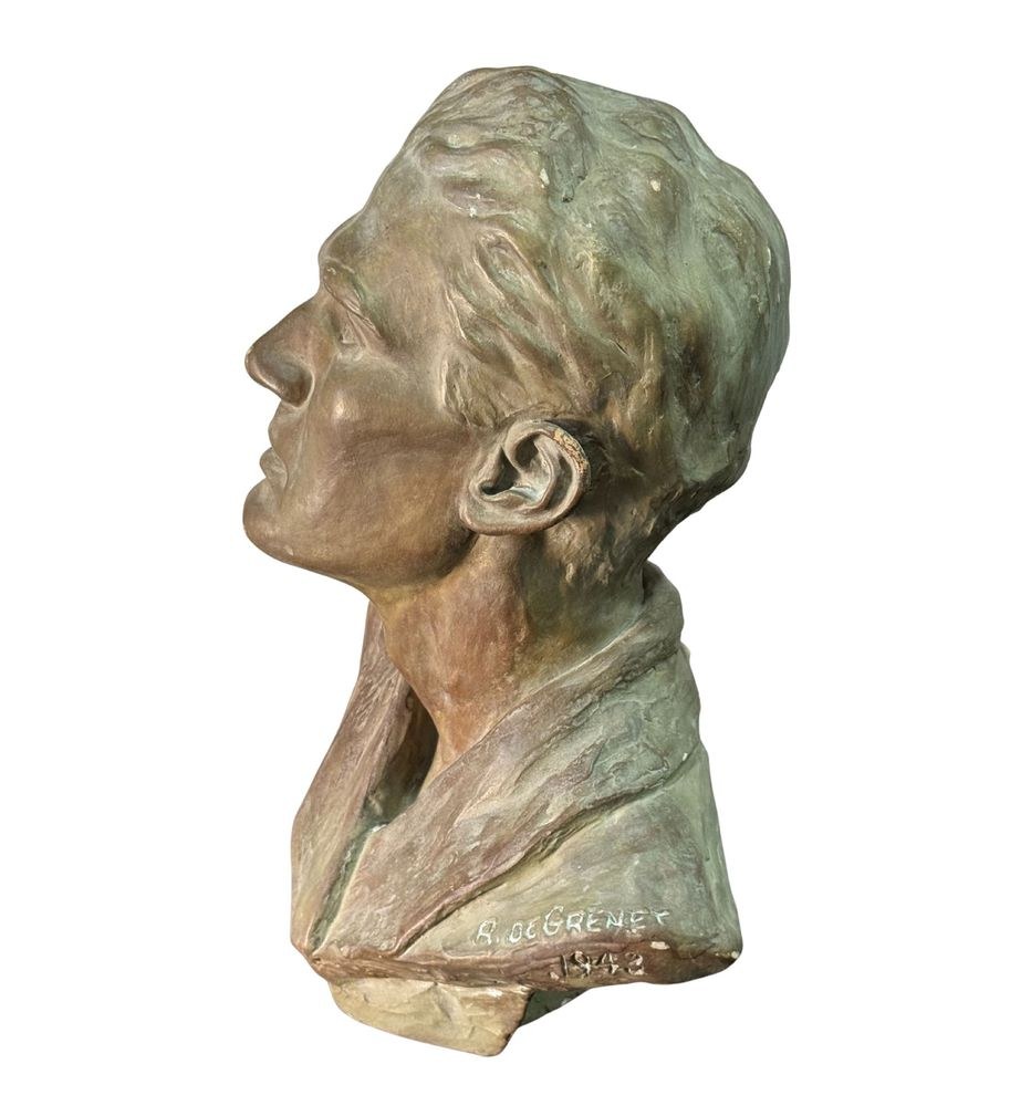 Plaster cast sculpture, 20th century, depicting a male bust. Signed on the right side: R. De Grenet 1943. Dimensions: h50 x 40 x 25 cm. The piece is in good condition with slight signs of aging, as shown in the attached photos.