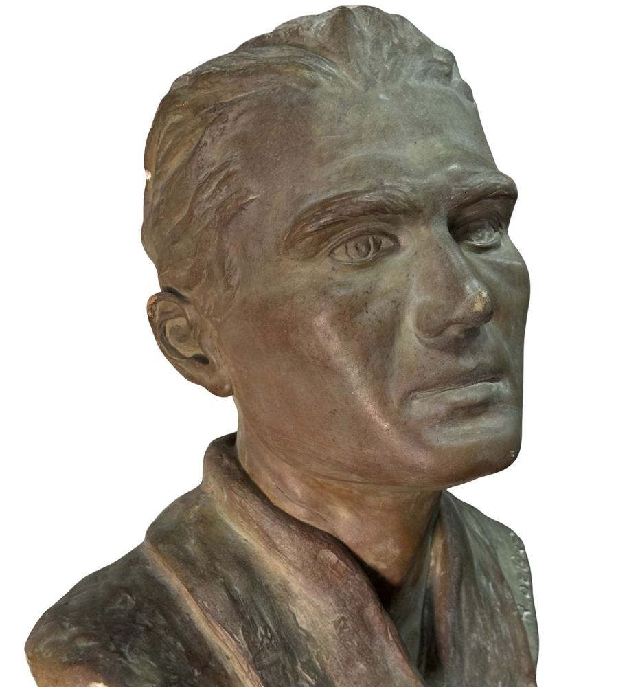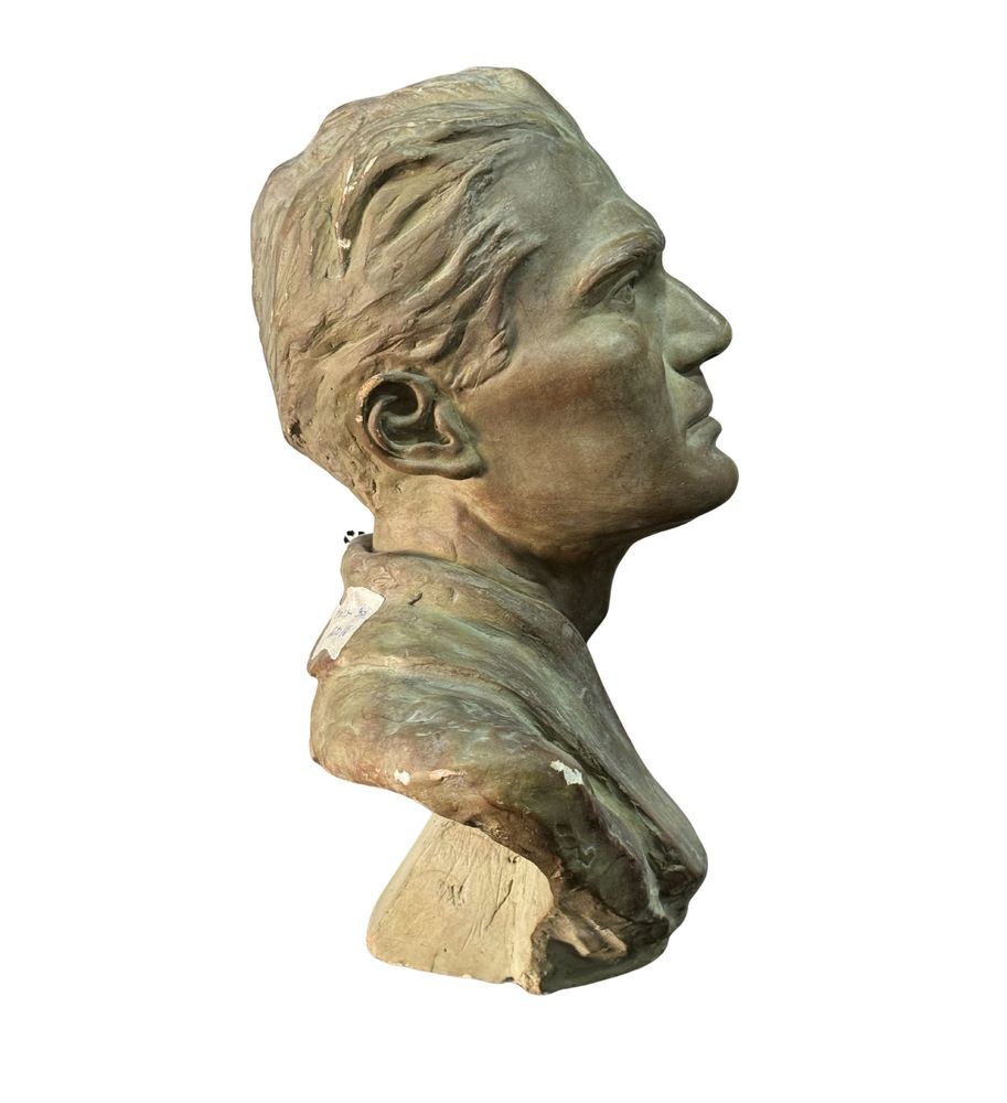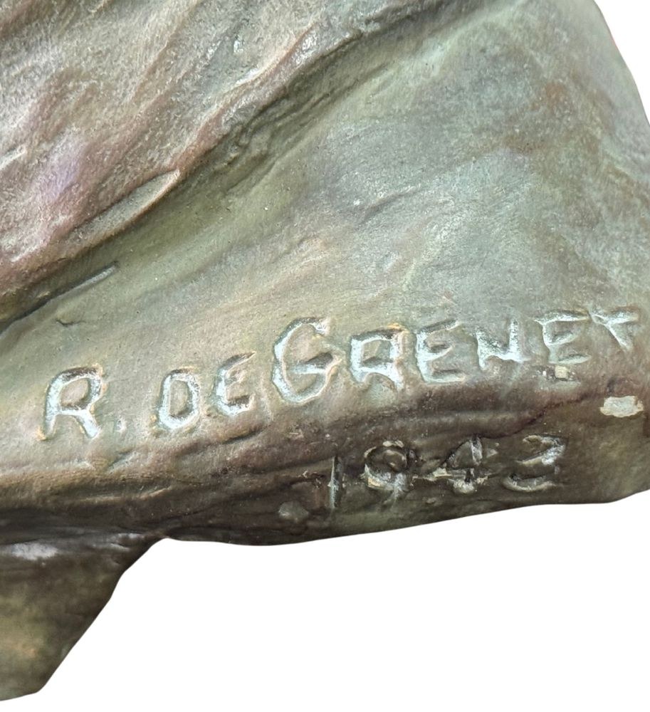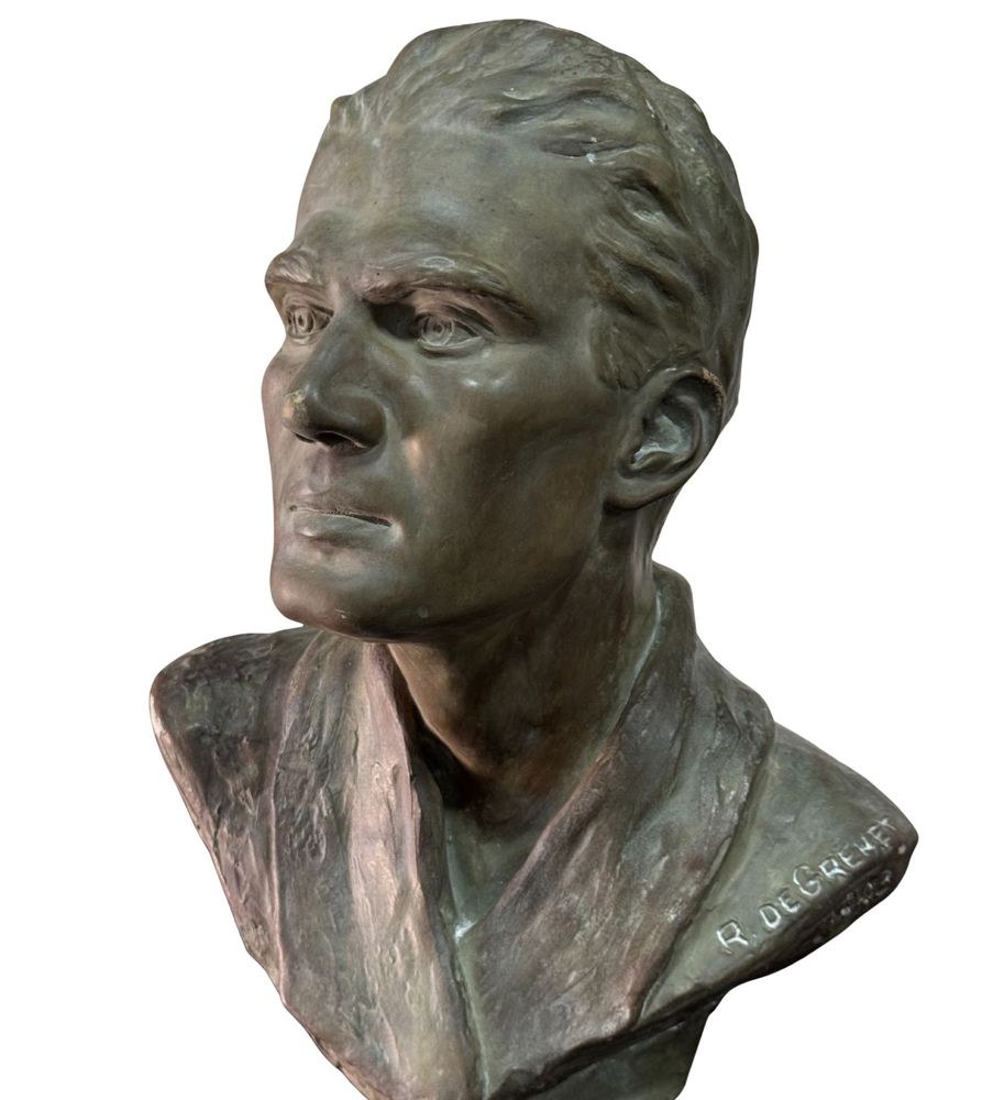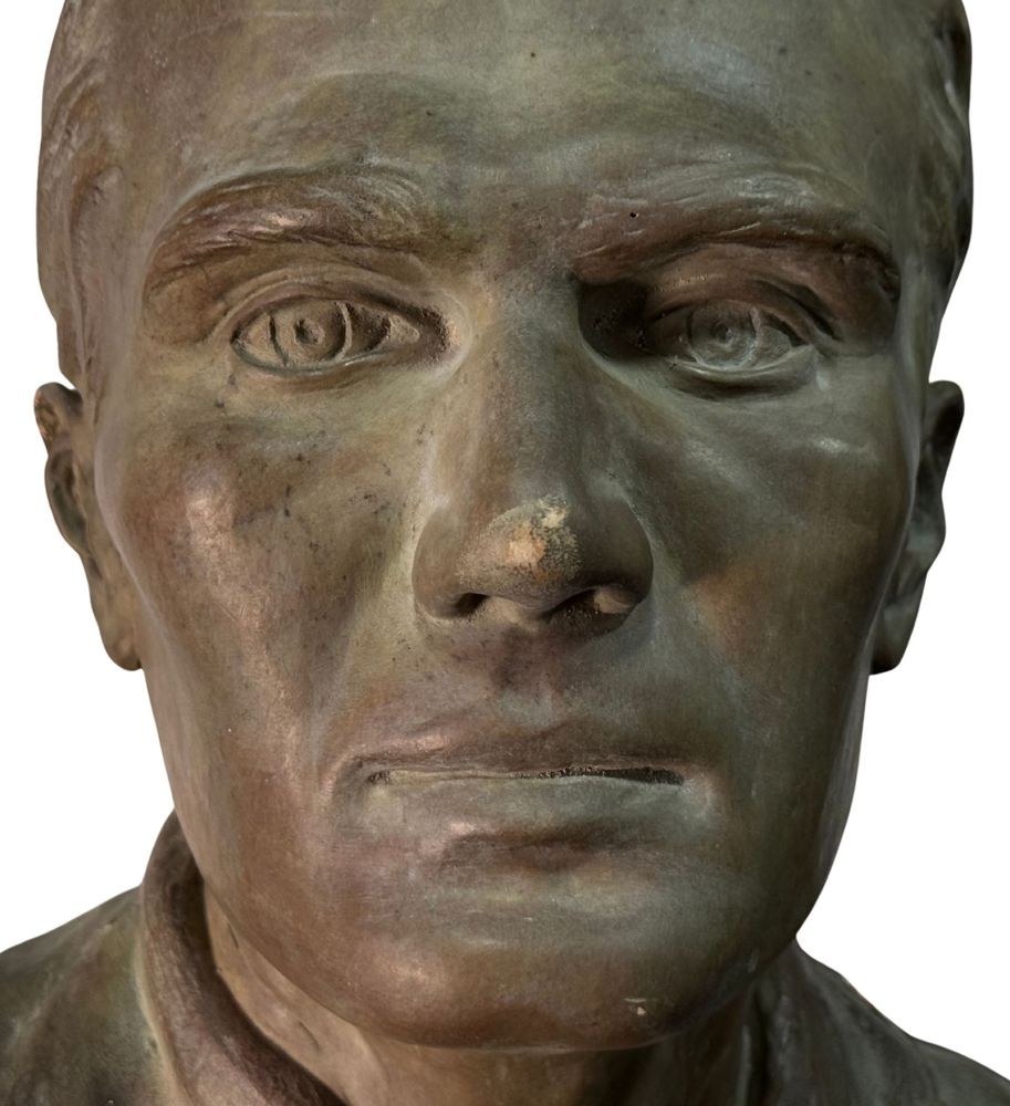 Plaster cast sculpture, 20th century, depicting a male bust. Signed on the right side: R. De Grenet 1943. Dimensions: h50 x 40 x 25 cm. The piece is in good condition with slight signs of aging, as shown in the attached photos.