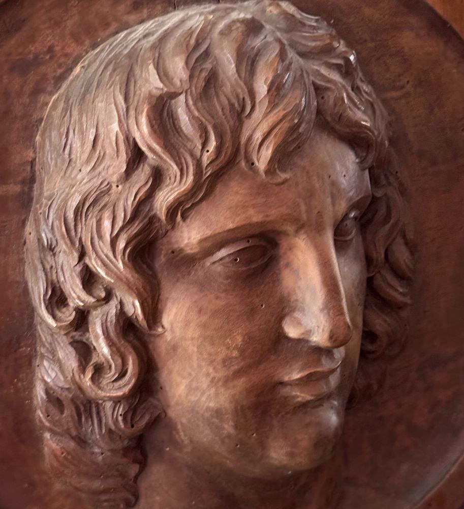Low-relief wooden sculpture depicting a male face, 19th century. Round in shape, dimensions: d46 x p14 cm. By an anonymous artist. The piece is in good condition with slight signs of aging, as shown in the attached photos.