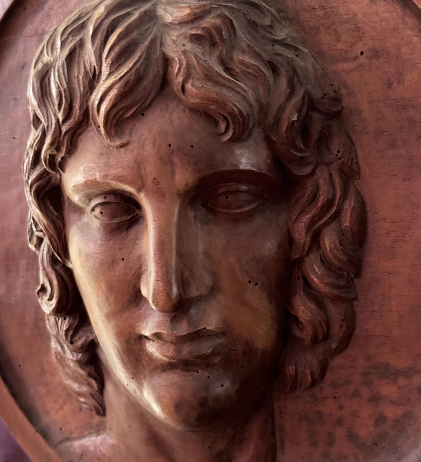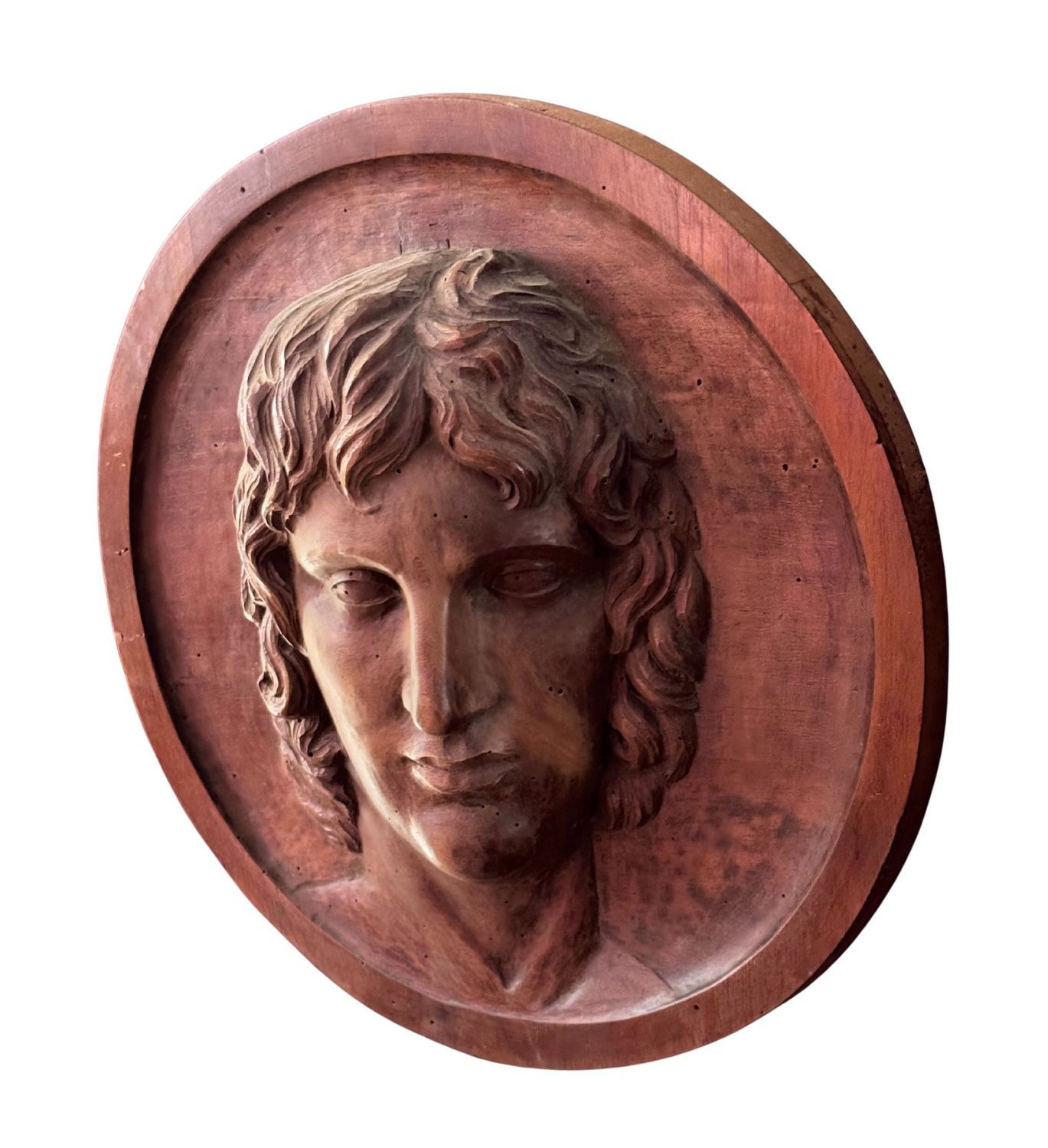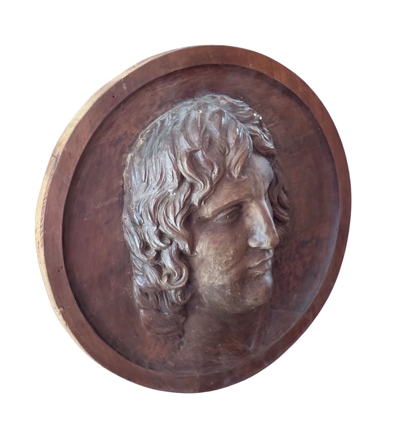 Low-relief wooden sculpture depicting a male face, 19th century. Round in shape, dimensions: d46 x p14 cm. By an anonymous artist. The piece is in good condition with slight signs of aging, as shown in the attached photos.