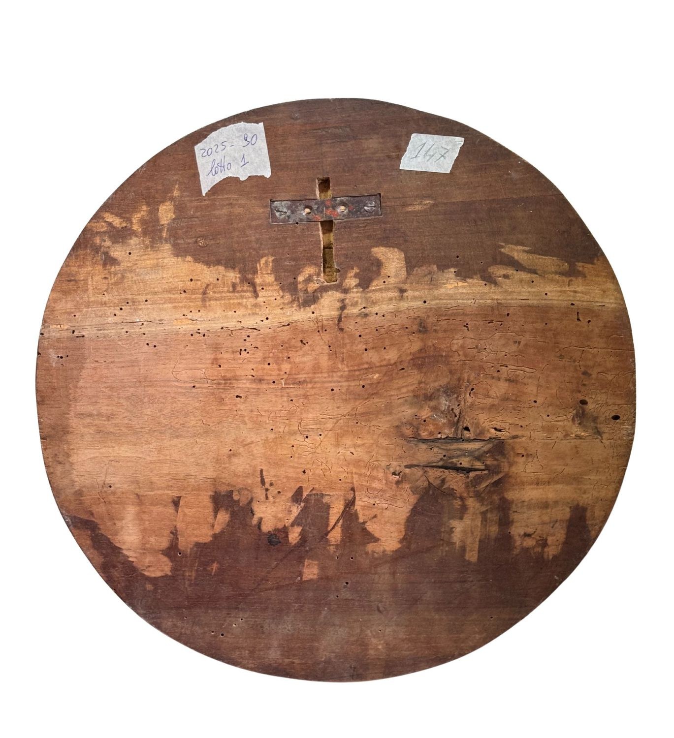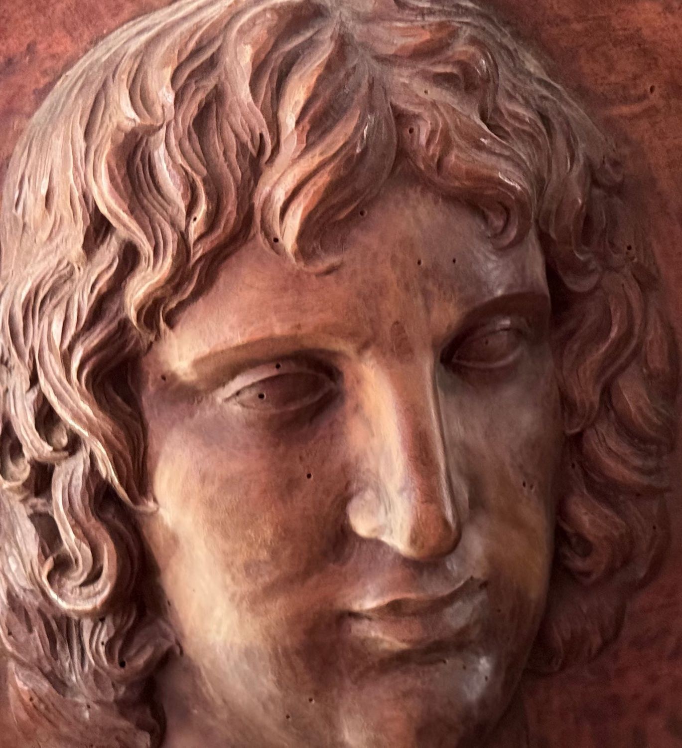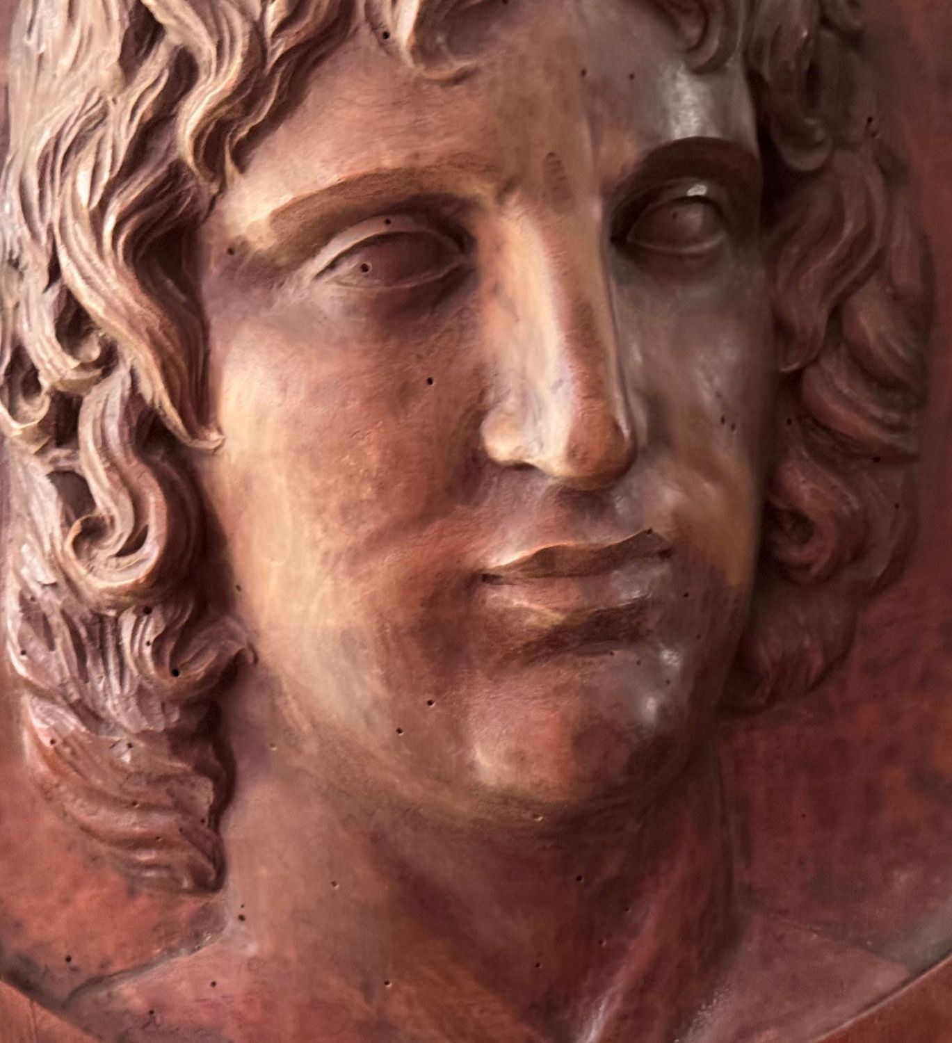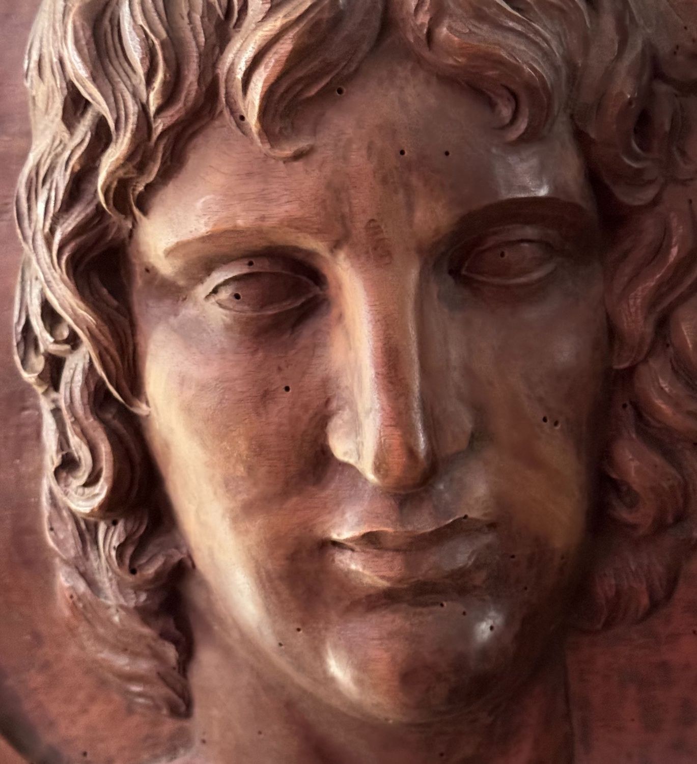 Low-relief wooden sculpture depicting a male face, 19th century. Round in shape, dimensions: d46 x p14 cm. By an anonymous artist. The piece is in good condition with slight signs of aging, as shown in the attached photos.