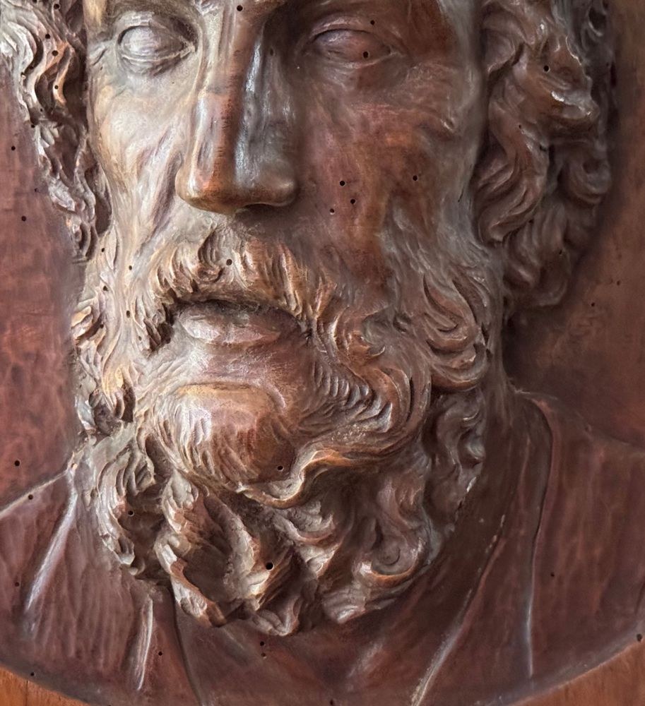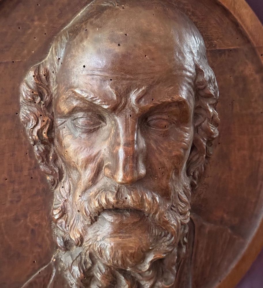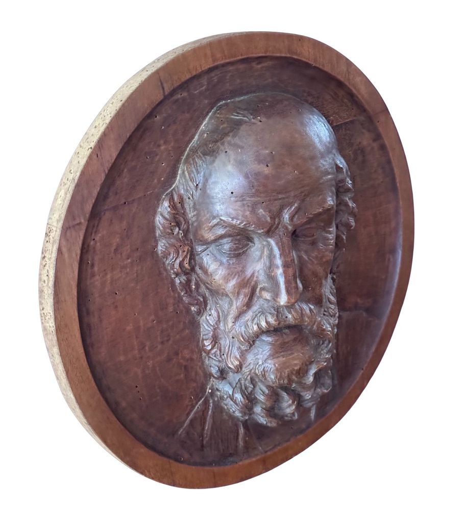 Low-relief wooden sculpture, 19th century, depicting a male figure. Dimensions: d46 x 15 cm. By an anonymous artist. The piece is in good condition with slight signs of aging, as shown in the attached photos.