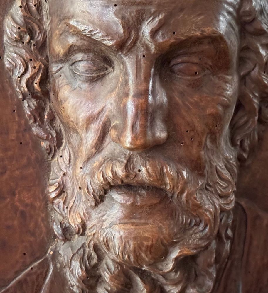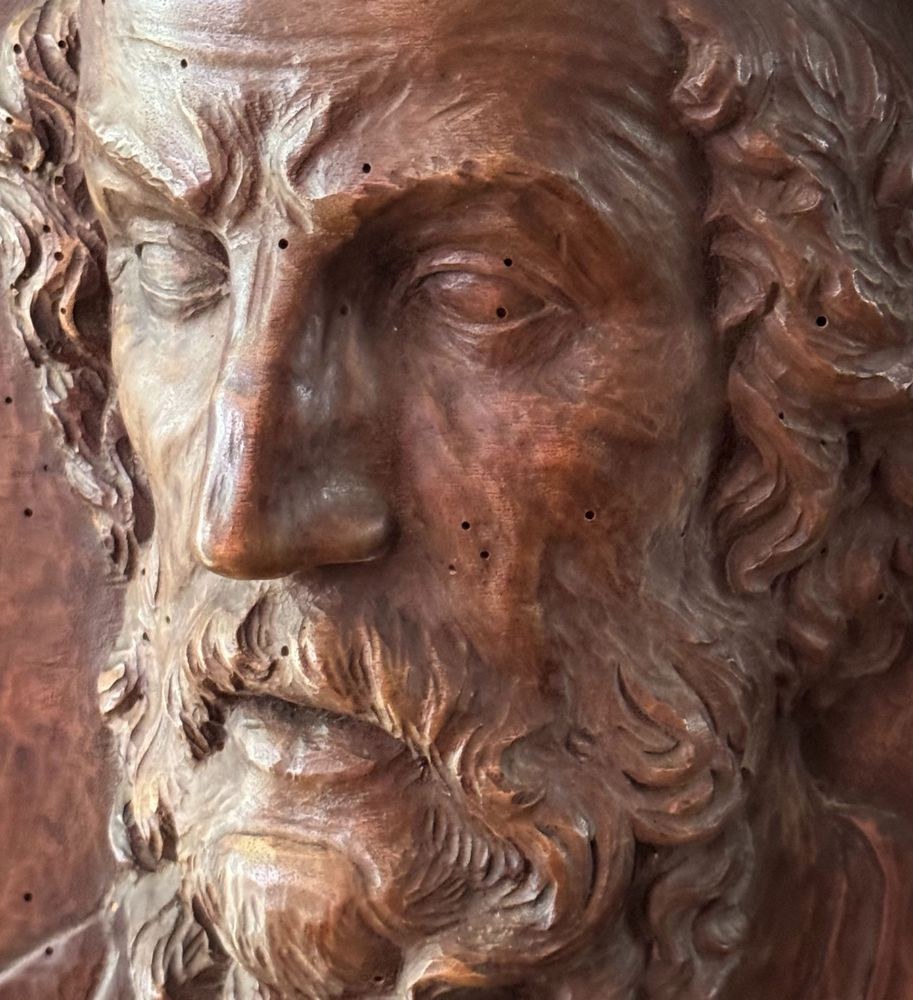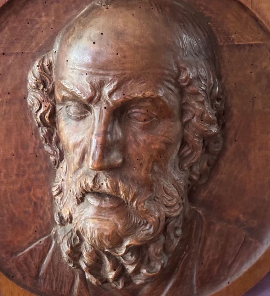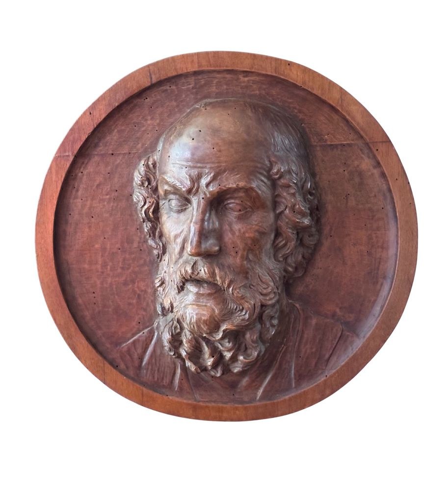 Low-relief wooden sculpture, 19th century, depicting a male figure. Dimensions: d46 x 15 cm. By an anonymous artist. The piece is in good condition with slight signs of aging, as shown in the attached photos.