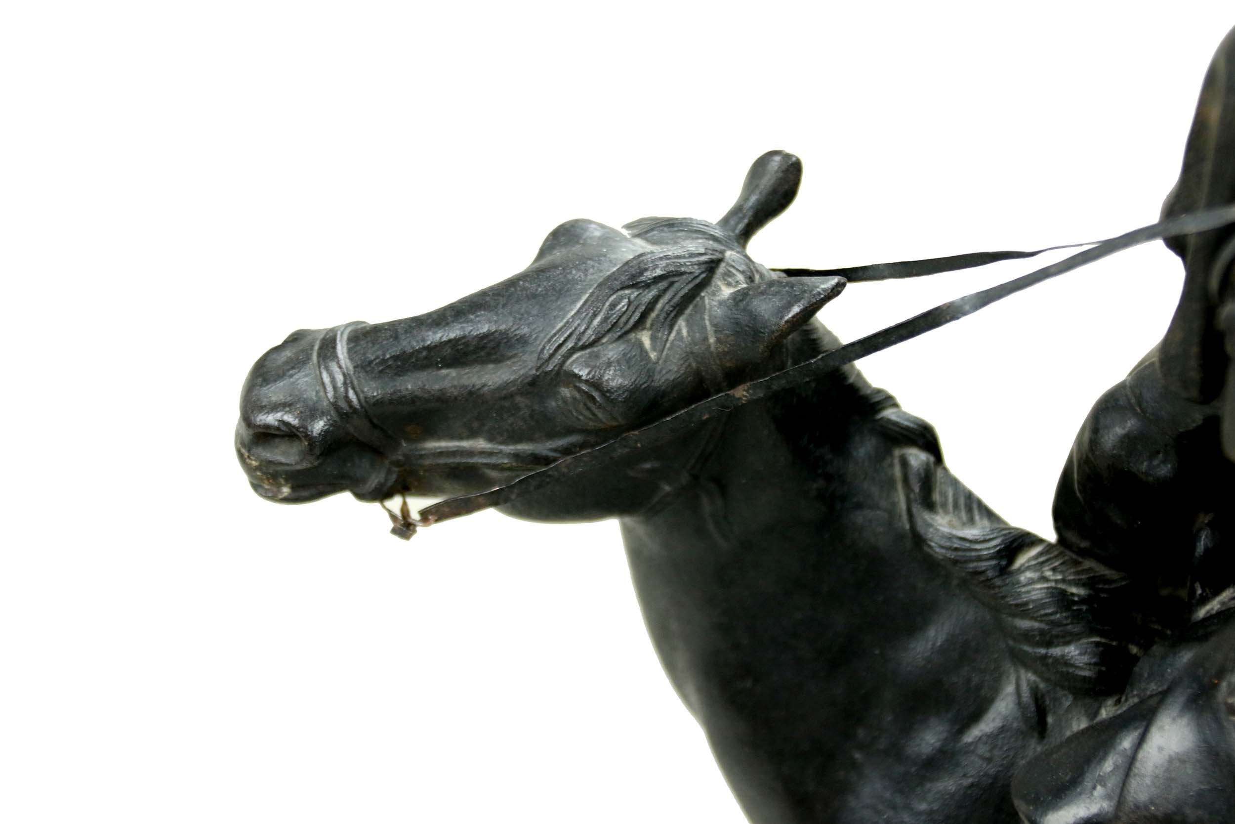 Dosiadający konia Kozak w wysokiej czapie, wąsaty - przytula dziewczynę, która wspięła się do niego na siodło. Na wydłużonej owalnie podstawie.