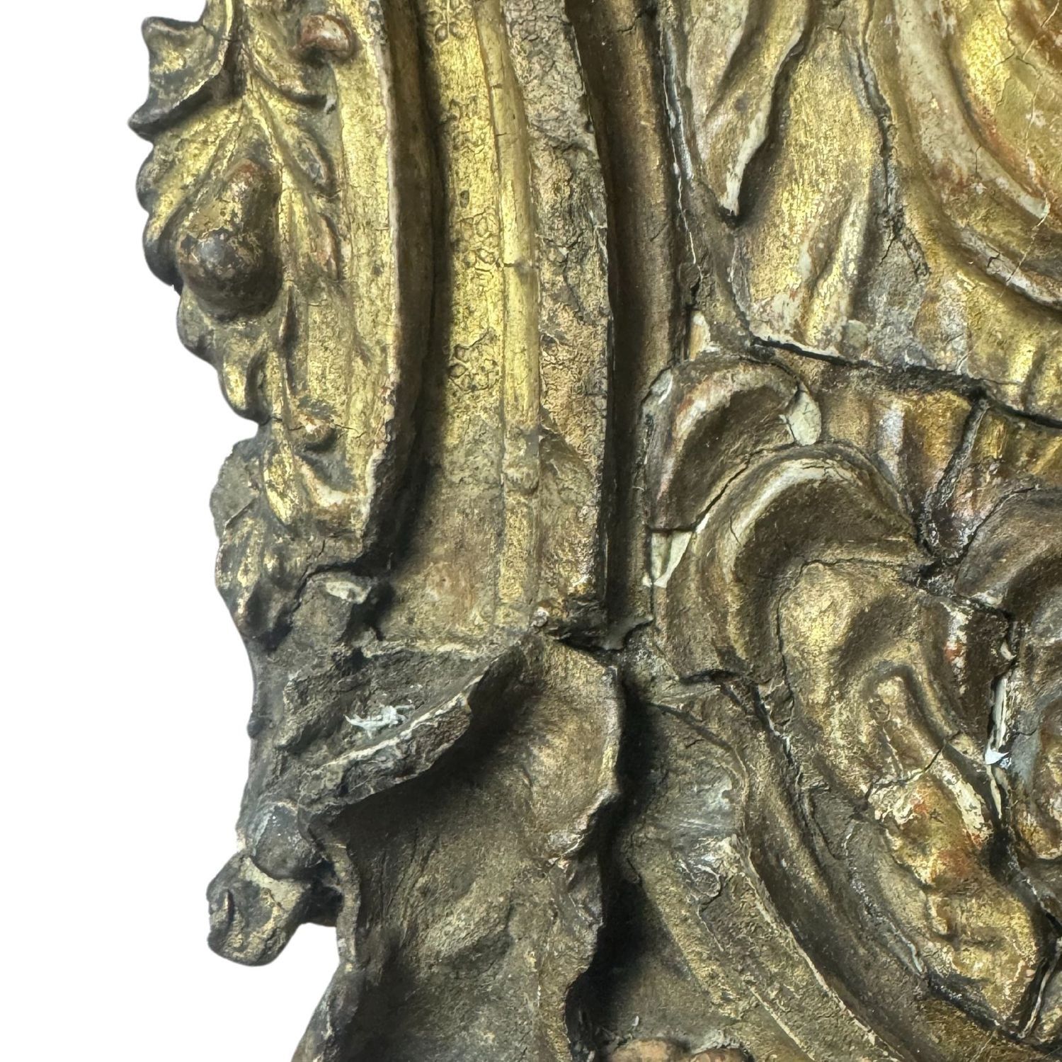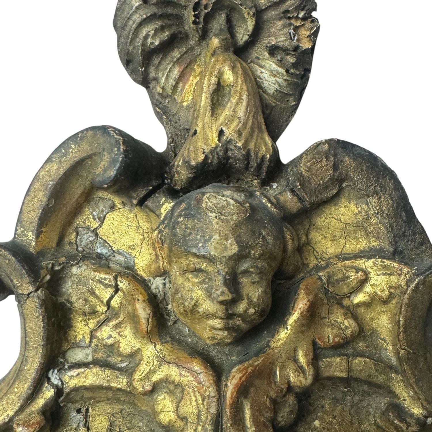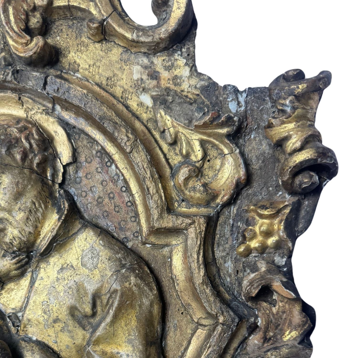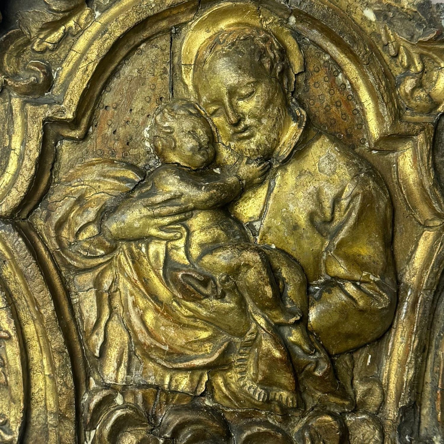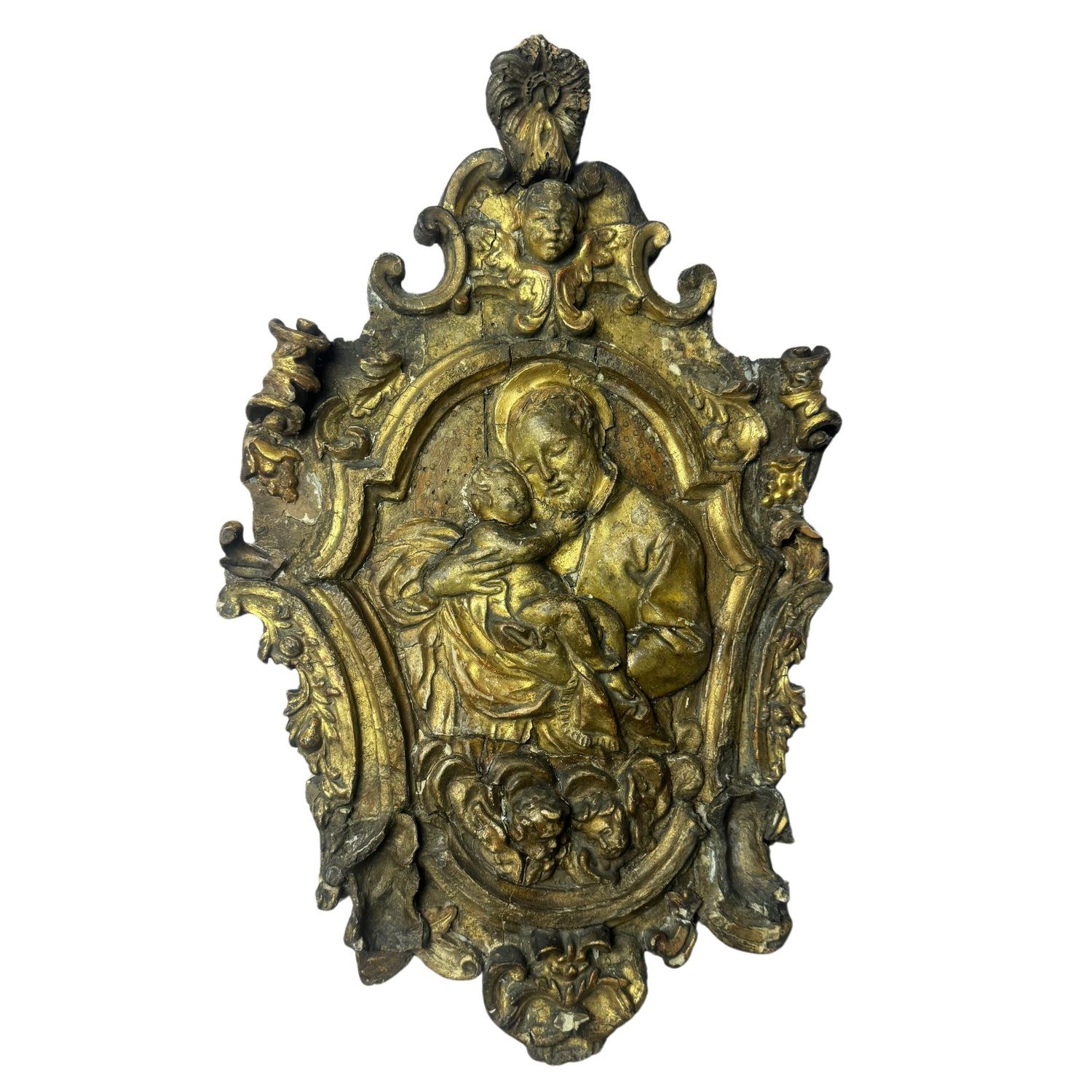 Gilded wooden sculpture and saint in scagliola, depicting Saint Joseph with child and cherubs. 18th-century period.