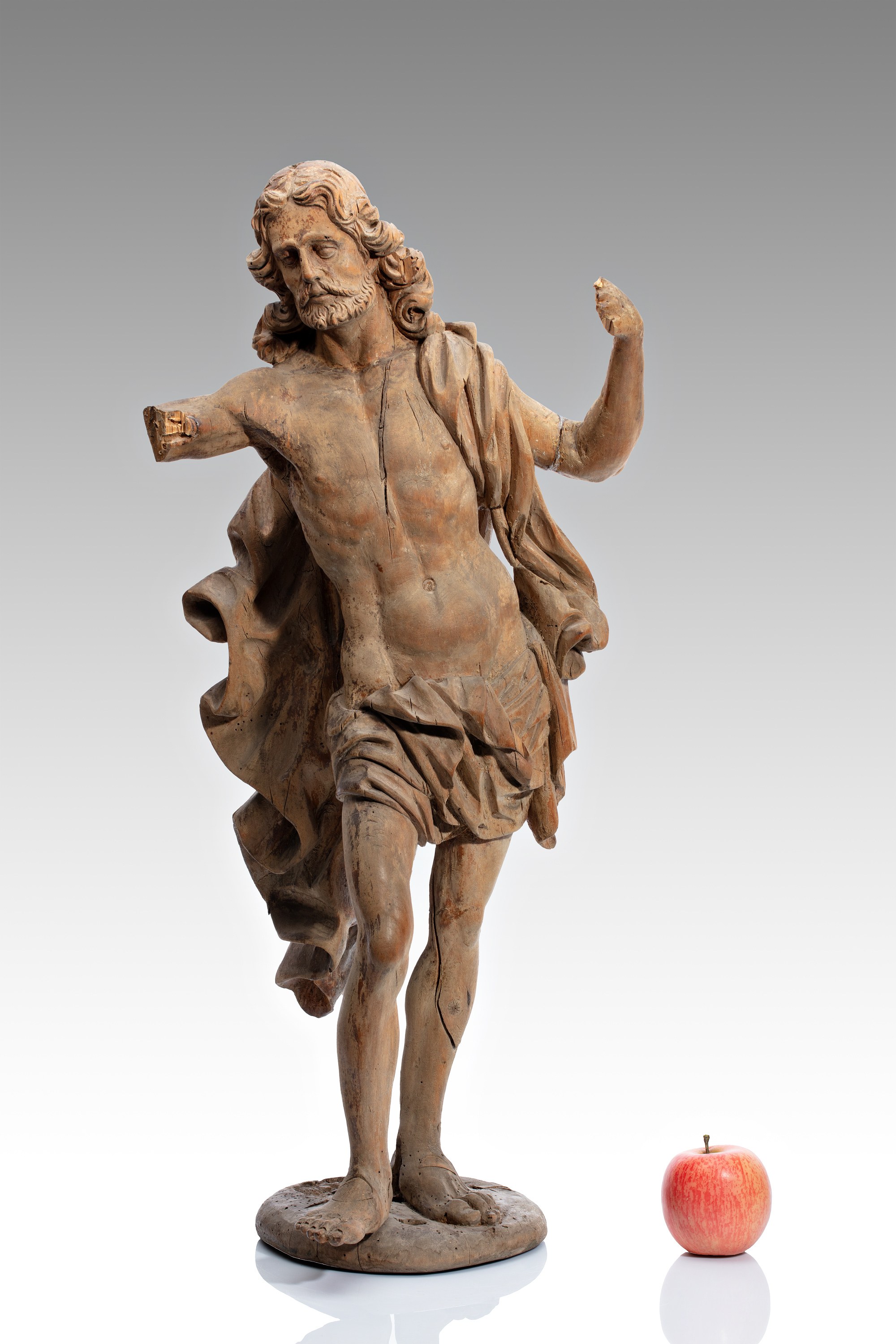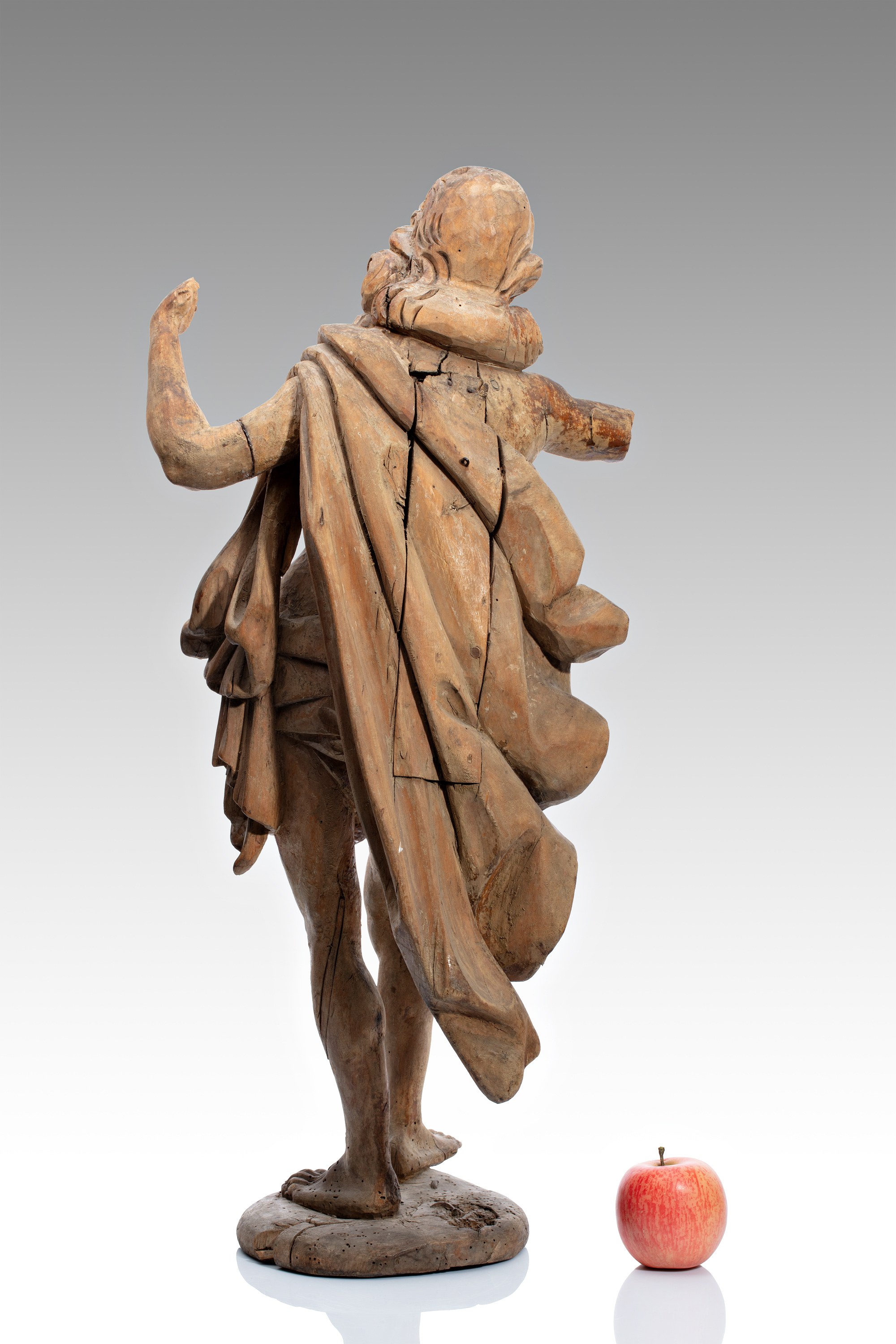 A 17th-century wooden statue of John the Baptist depicts the saint in dynamic motion, with distinctive features including wavy hair, a beard and loose clothing covering part of the body. The figure stands on a circular plinth with an indicated step forward, which gives the composition a distinct expressiveness.The rendering corresponds to the baroque sculptural concept with an emphasis on the dramatic modeling of the drapery and the natural anatomical treatment of the body. Iconographic attributes that would help determine more precisely the original location of the statue have not survived, but it was probably part of a larger altarpiece or a separate sacral composition.