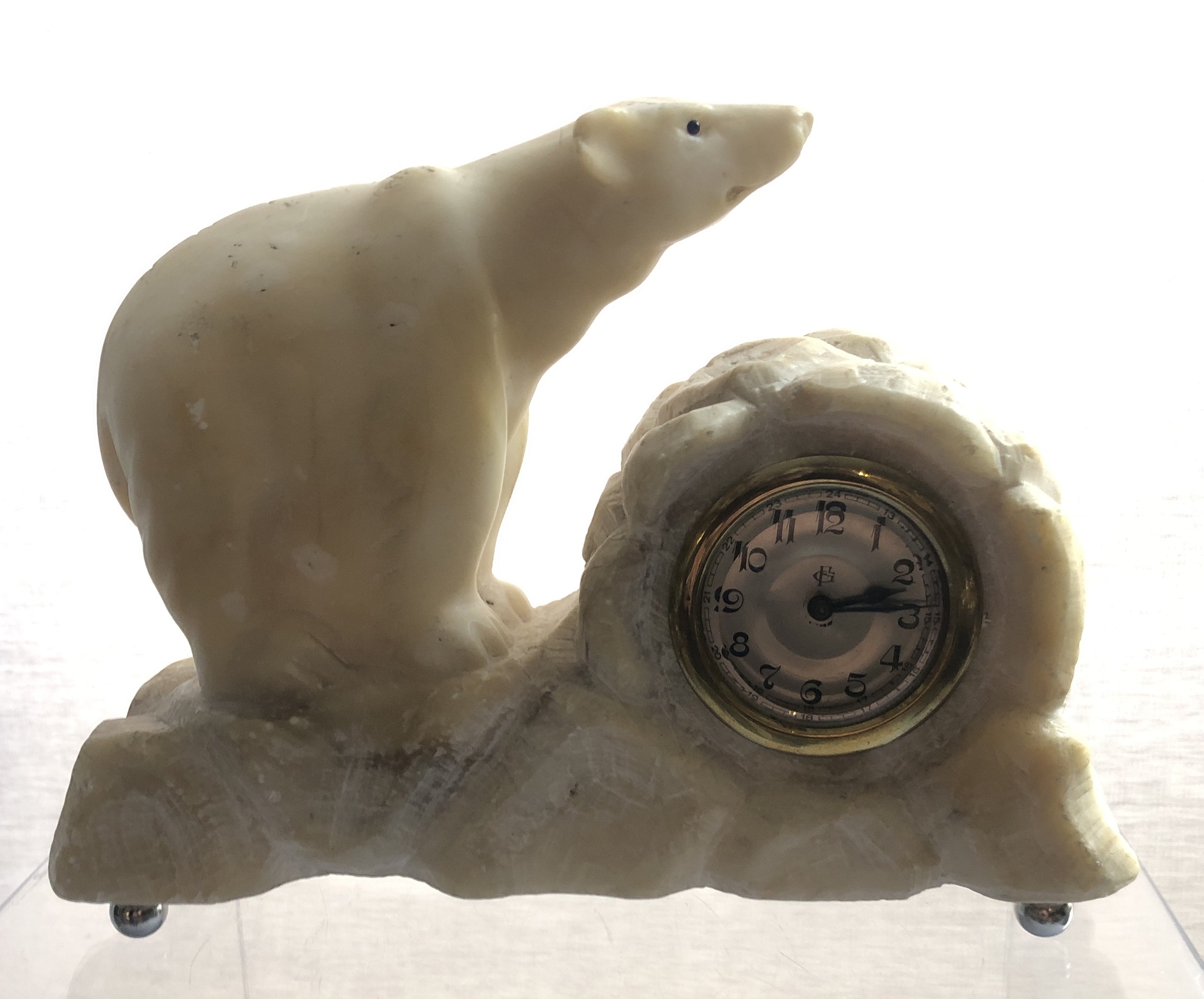 Niewielki zegar gabinetowy w obudowie alabastrowej na czterech srebrnych kulistych nóżkach, figura pełnoplastyczna stojącego na skale niedźwiedzia, prosty mechanizm zegarowy - chodzika, tarcza metalowa, malowany cyferblat, mosiężna obudowa, wymiary 18x24x8 cm.