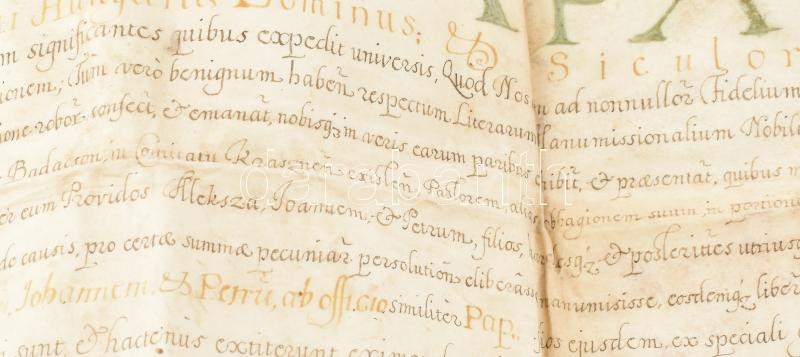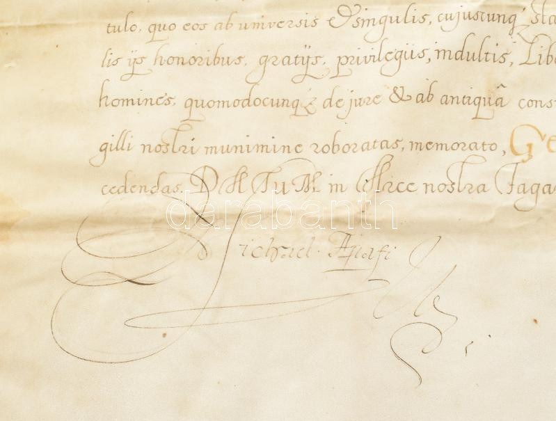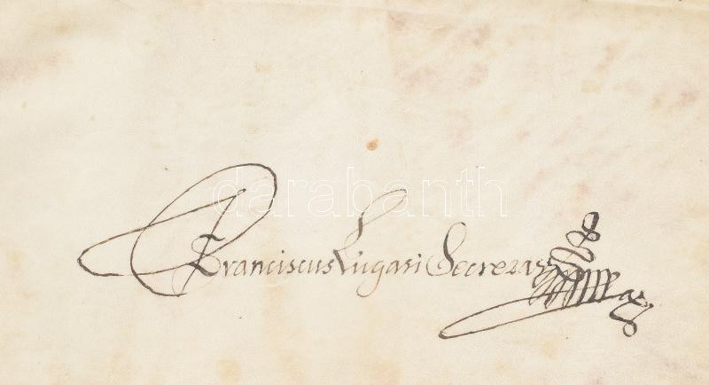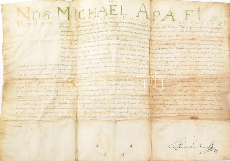 VÉDETT / NO EXPORT! 1684 Apafi Mihály (1632-1690) erdélyi fejedelem címereslevele (Armalis), a kraszna vármegye-beli Badacson birtok pásztorának, az ezidiáig "vlach hitvallású" Pap Györgynek, akit nemesi címre emel és akinek Bihar vármegye Kis-Barod birtokát adományozza. A címer leírásával, de rajza nélkül, ami valószínűleg azért nem került rá, mert a friss nemesnek nem volt pénze azt megrajzoltatni. Pergamen. Kiállítva Fogarason, Apafi fejedelem autográf aláírásával és Lugosi Ferenc kancelláriai titkár aláírásával. Somlyói kihirdetési záradékkal. / 1684 Coat of arms letter (Armalis) of Mihály Apafi (1632-1690), ruler of Transylvania, to the shepherd of the Badacson estate in Kraszna County, György Pap, who until now was of "Vlach faith" Romanian originated person, to whom he donates the estate of Kis-Barod in Bihar County. With a description of the coat of arms but without a drawing, which was probably not included because the new nobleman did not have the money to draw it. Parchment. With the autograph signature of ruler Apafi issued in Fagaras. 78x50 cm