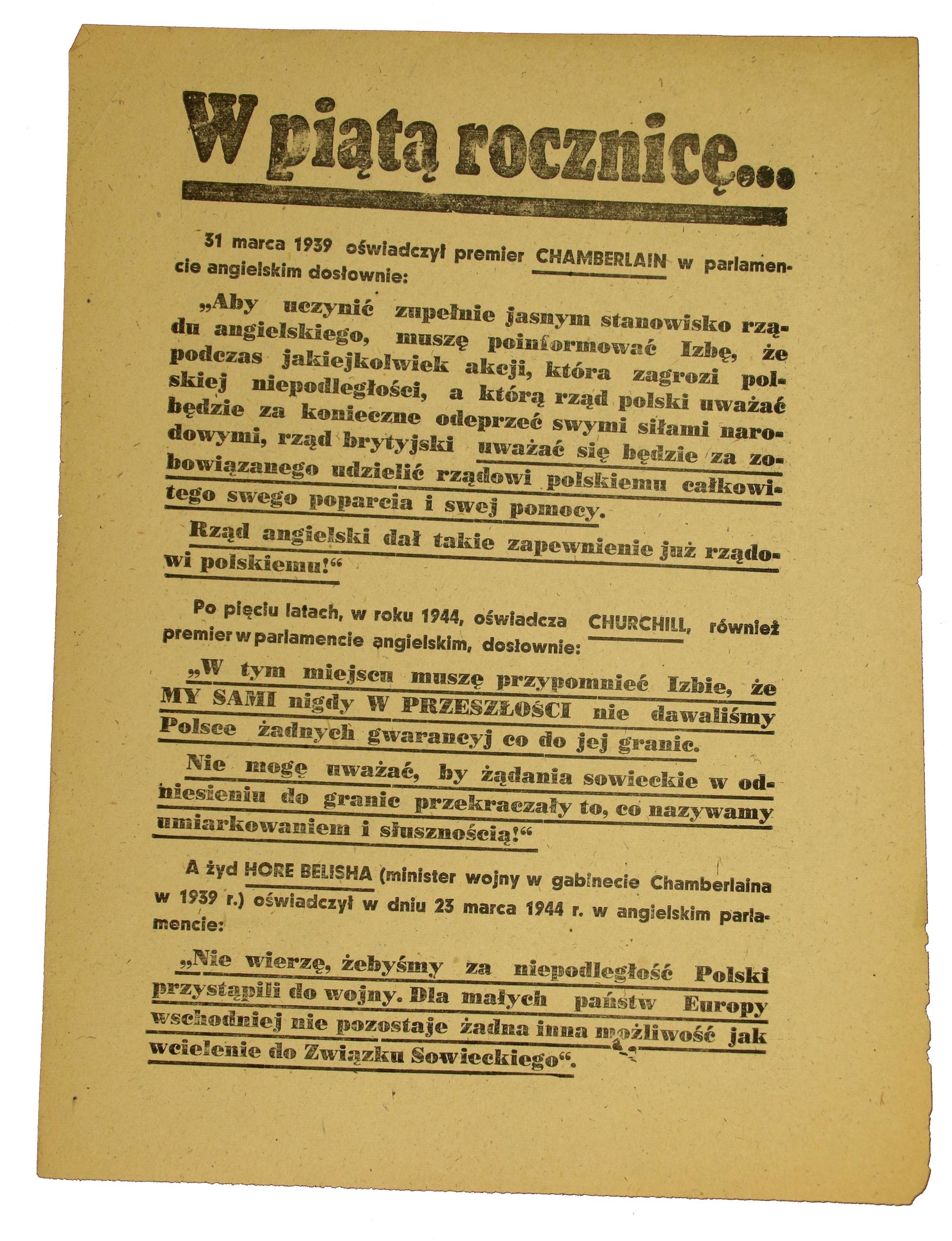 Ulotka sowiecka propagandowa na temat relacji polsko-brytyjskich, 1944, W piątą rocznicę, wym. 20 x 26 cm