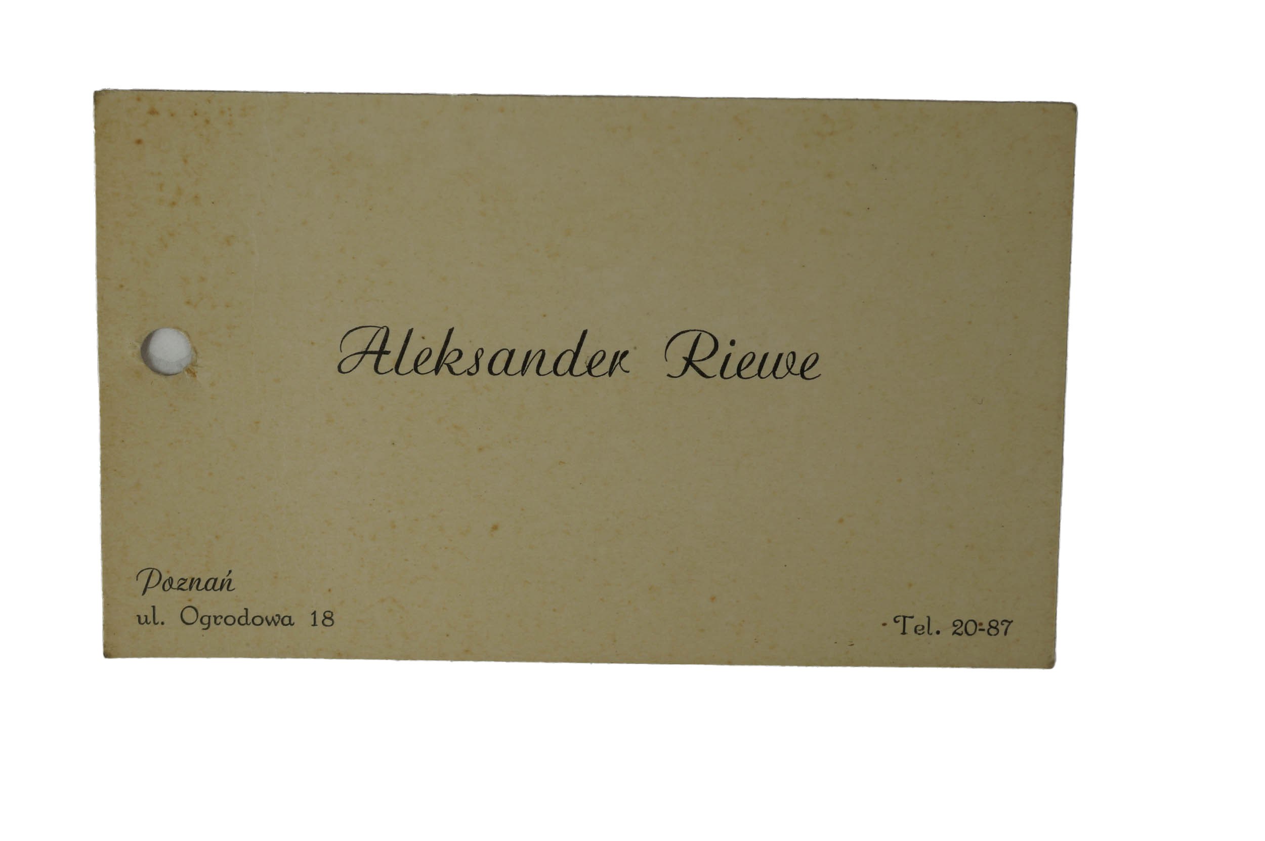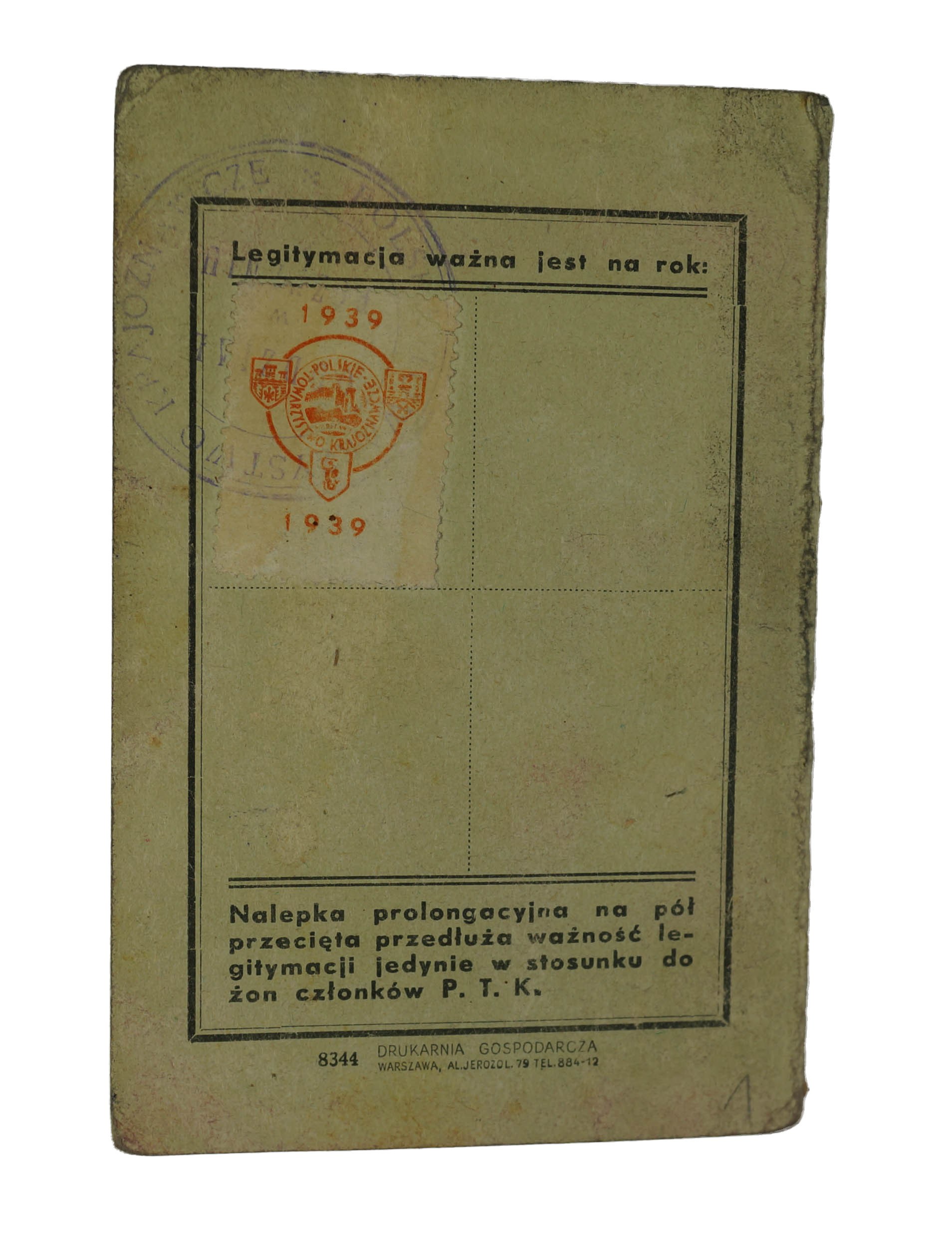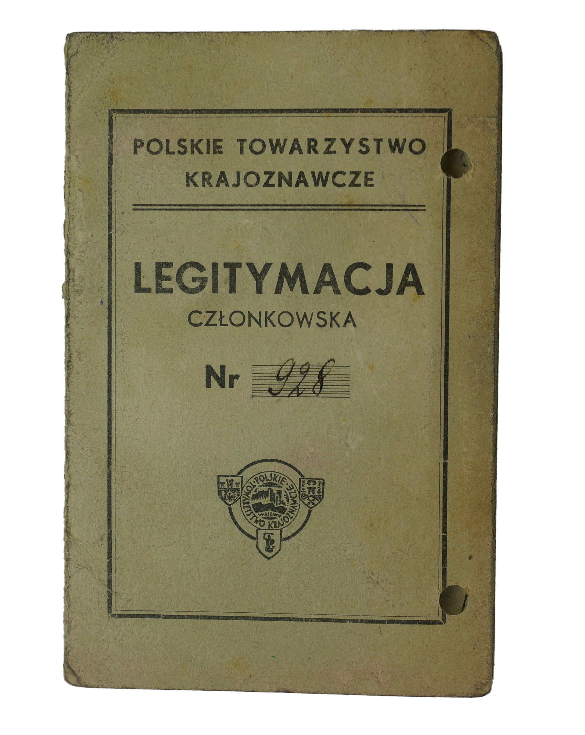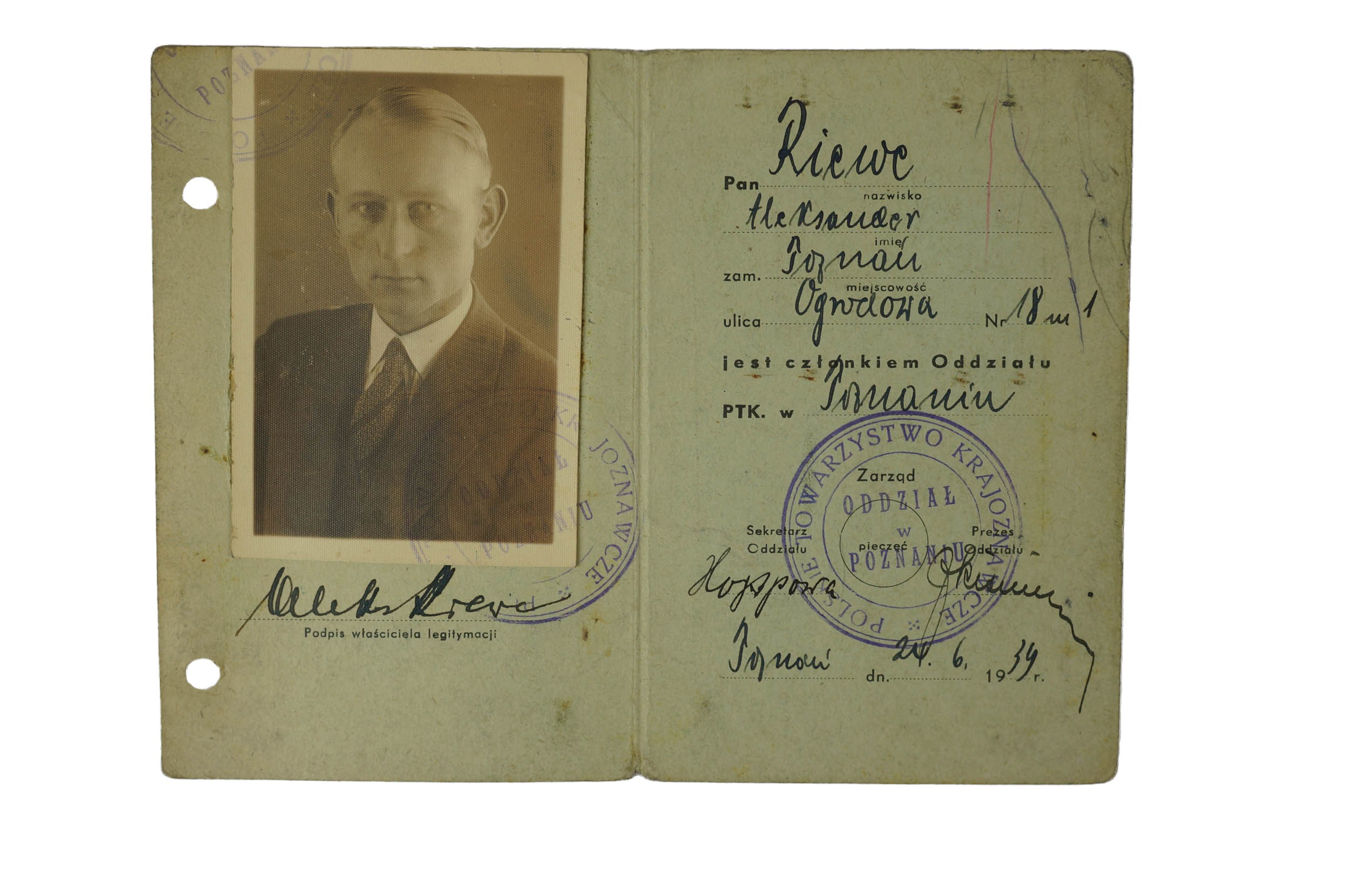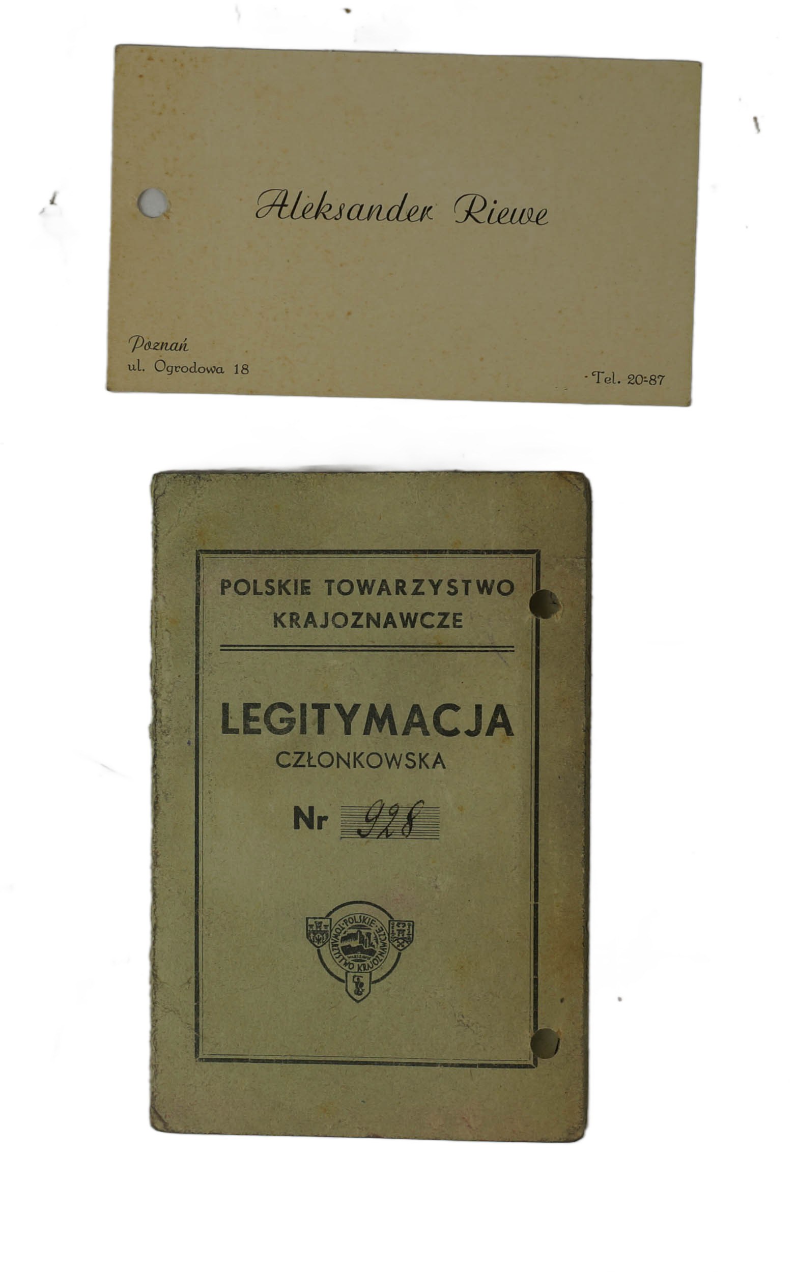 Wizytówka i legitymacja Polskiego Towarzystwa Krajoznawczego oddział w Poznaniu wystawiona na nazwisko Aleksander Riewe, legitymacja nr 928, wystawiona 24.6.1939r. ze znaczkiem opłaty składki za rok 1939, legitymacja ze zdjęciem, f. 8x12,3cm [legitymacja], 10,8x6,4cm [wizytówka]