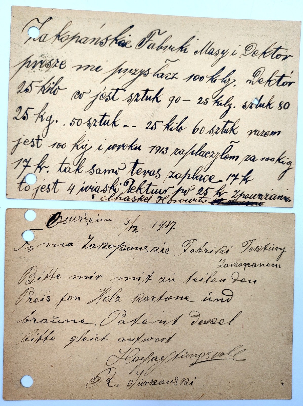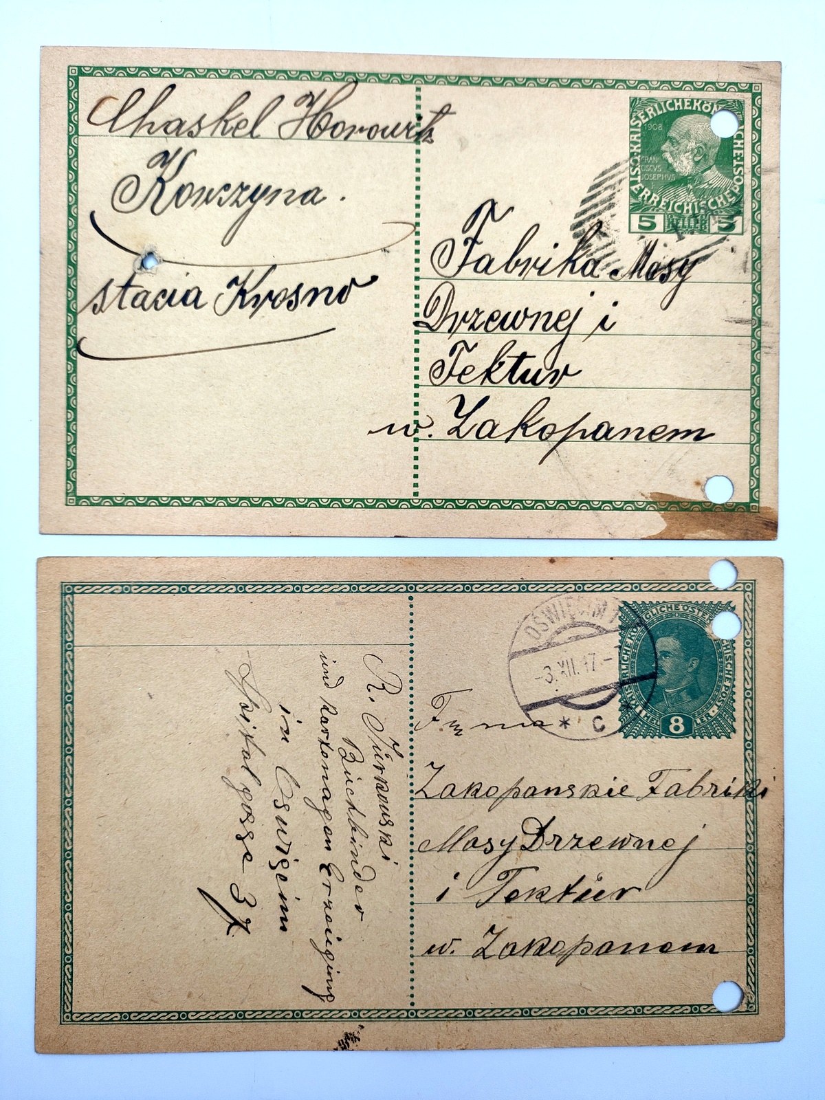 Para kart pocztowych wysłanych z zamówieniem do Fabryki masy drzewnej i tektur w Zakopanym