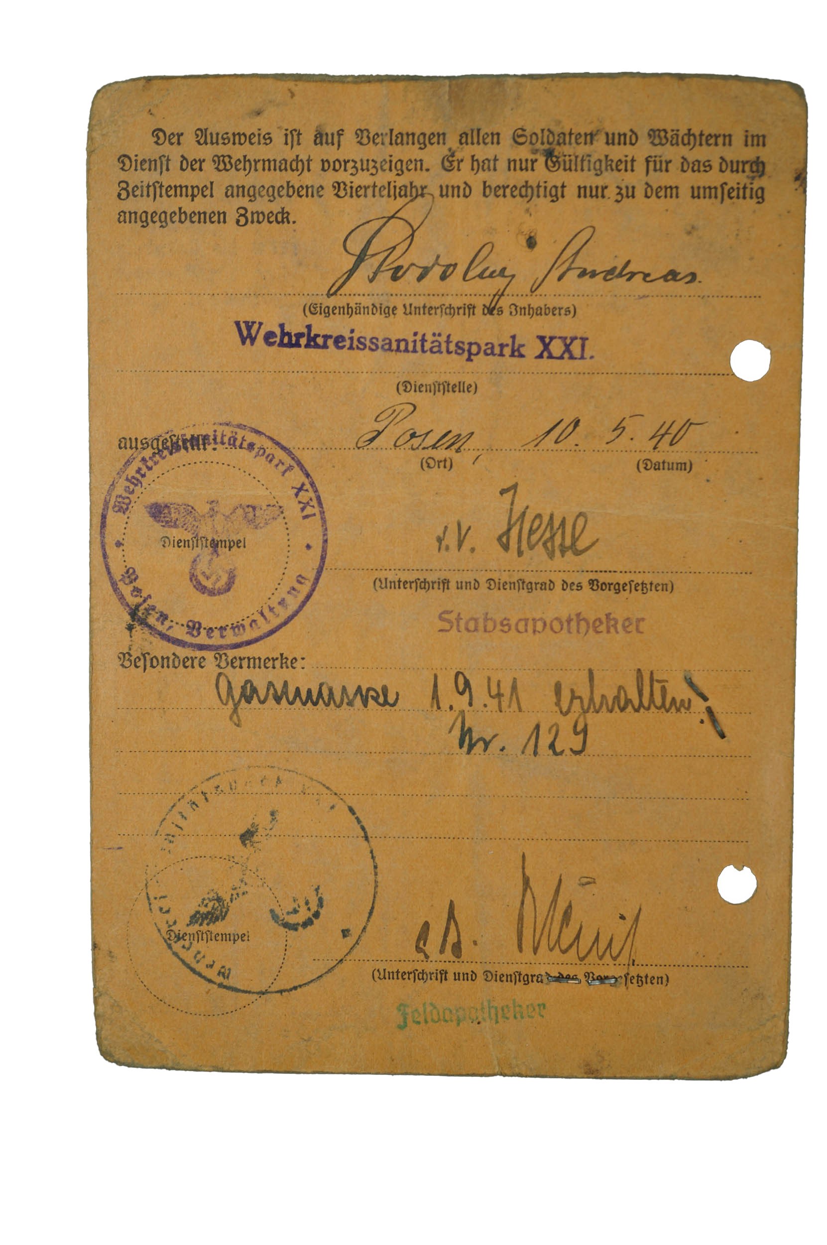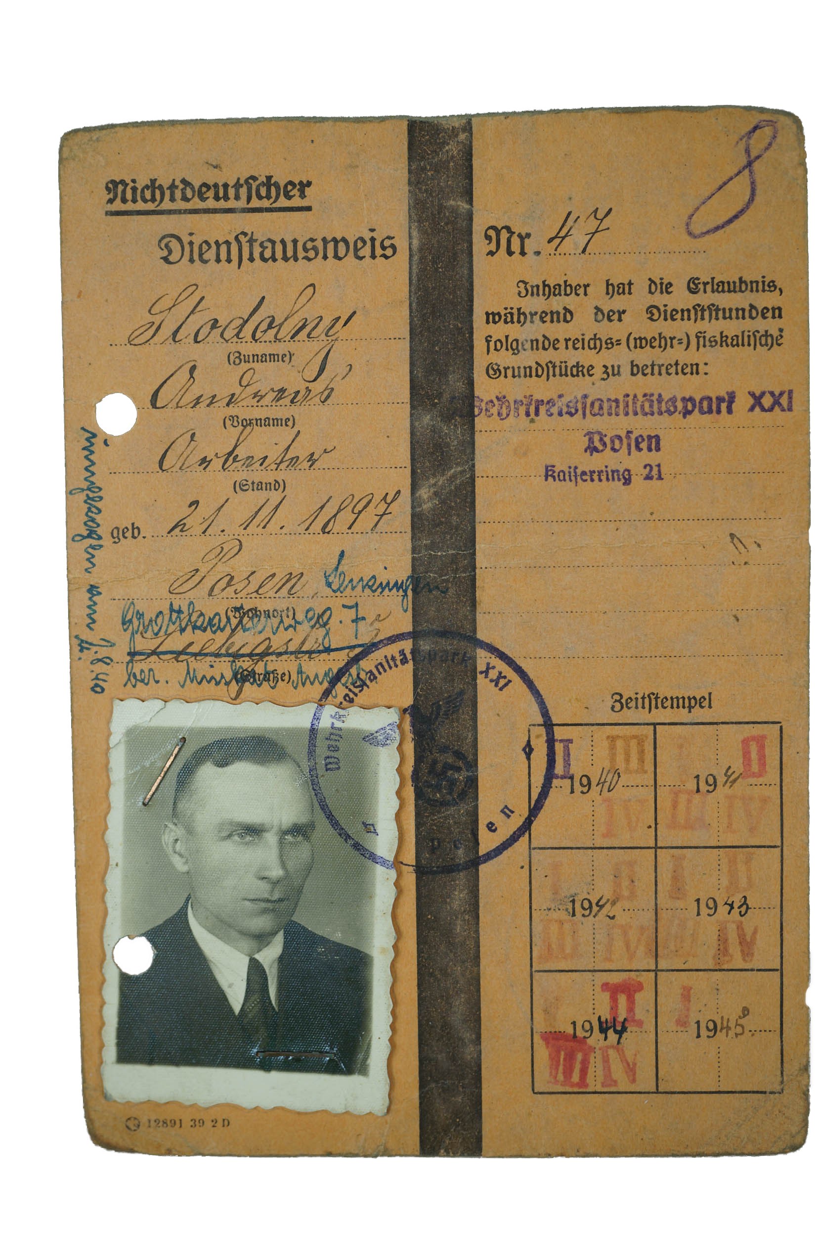 DIENSTAUSWEIS nr 47 / Legitymacja służbowa uprawniająca do wejścia na teren Parku Medycznego Okręgu Wojskowego nr XXI w Poznaniu, wystawiona 10.V.1940r., dokument ze zdjęciem, dla mężczyzny [rocznik 1897], ze stemplami kontrolnymi za lata 1940-45, informacja o otrzymaniu maski gazowej nr 129 w dniu 1.IX.1941r., f. 10,5 x 14,5cm