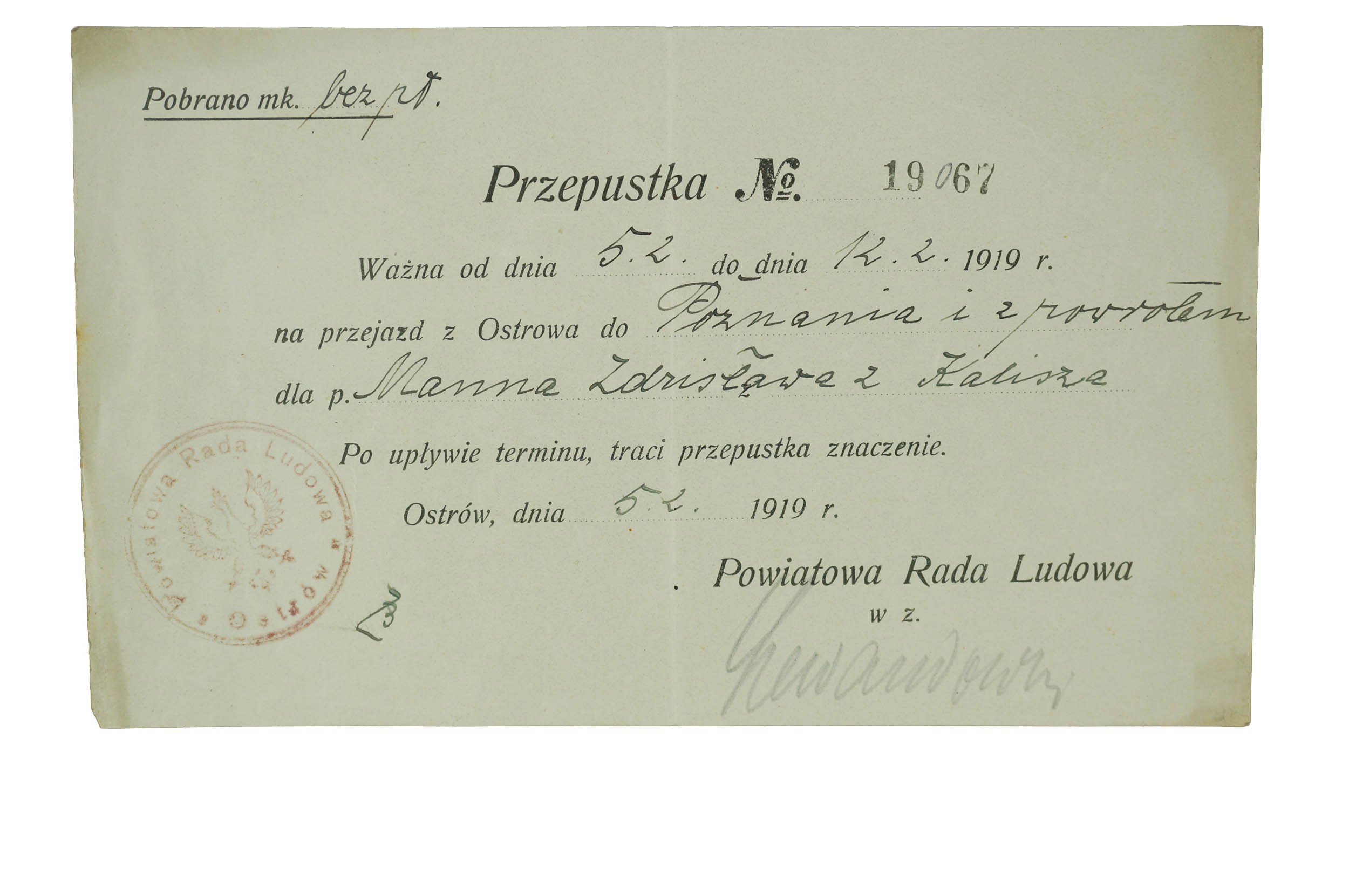 [POWSTANIE WIELKOPOLSKIE] PRZEPUSTKA nr 19067 ważna od dnia 5.2 do dnia 12.2.1919r. na przejazd z Ostrowa do Poznania i z powrotem dla p. Manna Zdzisława z Kalisza, stempel z polskim orłem w koronie: Powiatowa Rada Ludowa Ostrów 5.2.1919r., f. 17 x 10cm