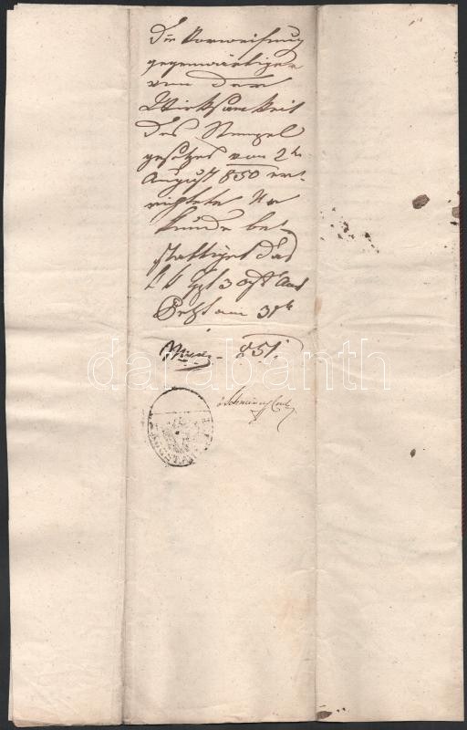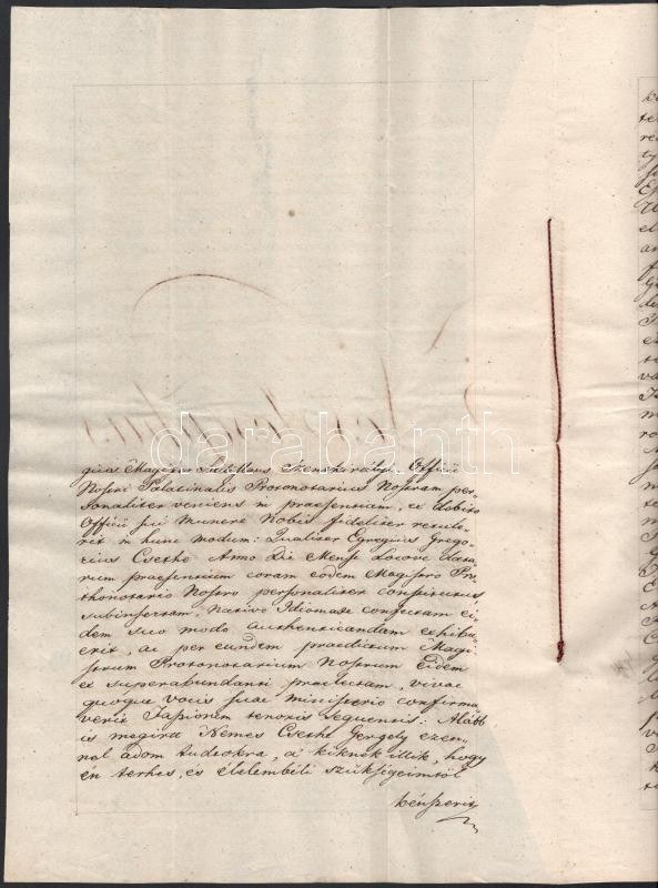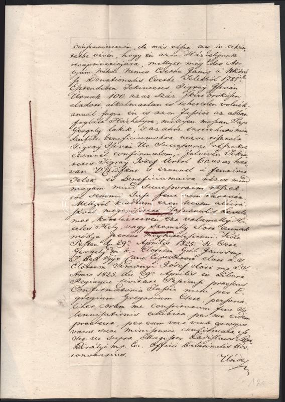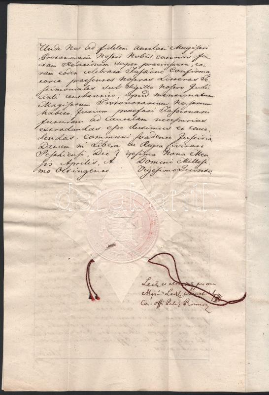 1825 Nagykőrösi házhely adás vételi szerződése Nemes Csete Gergely és Sigray István között, az utolsó oldalon későbbi 1851-es bejegyzéssel, Pesten, Szentkirályi László magiszter aláírásával, papírfelzetes viaszpecséttel, latin és magyar nyelven,3 sztl. lev.