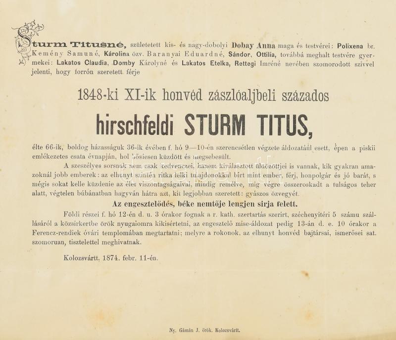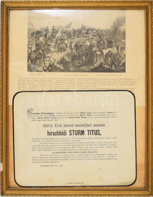 1848-as honvéd halotti értesítője hirschfeldi Sturm Titus (1808-1874) a piski csatában részt vett XI...