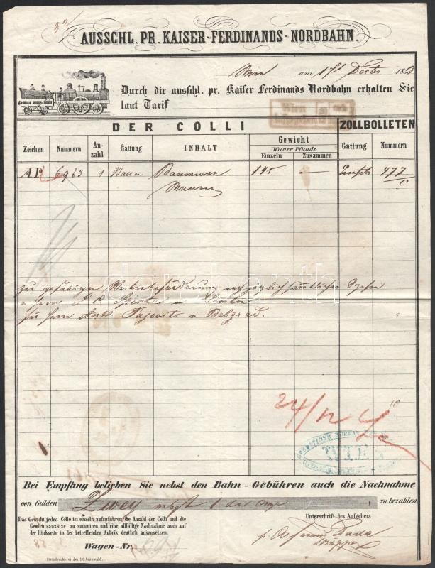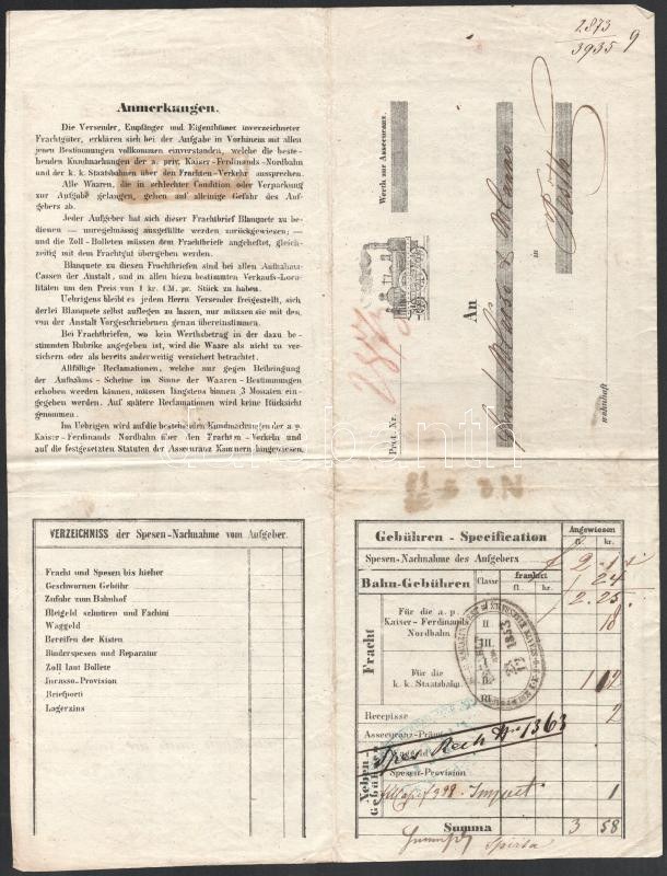 1853 Ausschl. Pr. Kaiser-Ferdinands-Nordbahn vasúti fuvarlevél