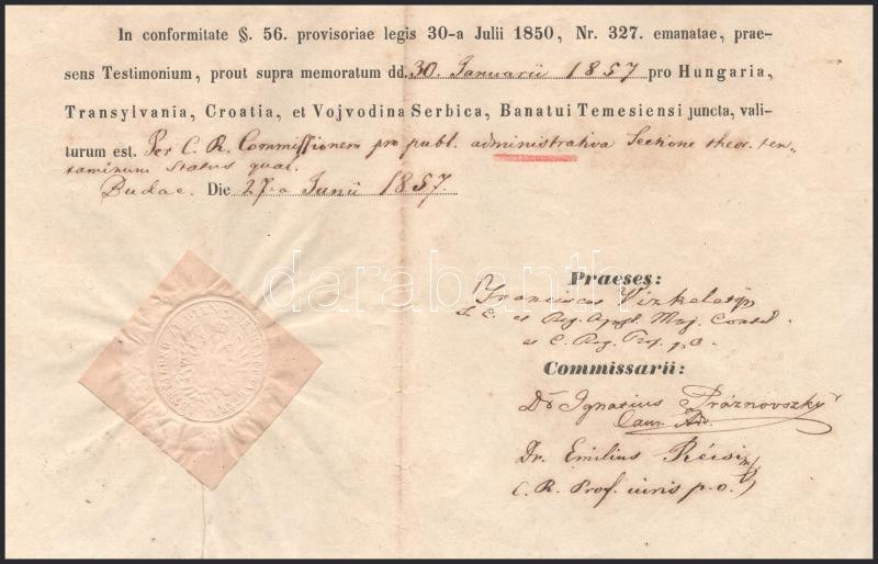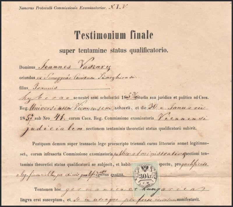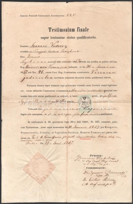 1857 Buda, Dr. Vaszary János (1833-1901) későbbi kaposvári köz- és váltó ügyvéd, érsekuradalmi tanácsos, korának egyik legtekintélyesebb polgárának záróvizsga bizonyítványa, latin nyelven, papírfelzetes viaszpecséttel, 30 kr okmánybélyeggel, hajtott, Dr, Vízkelety Ferenc (1789-1875) jogi doktor, egyetemi tanár, Dr. Praznovszky Ignác (1814-1892), és Dr. Récsi Emil (1822-1864) jogtudós, műfordító aláírásaival.