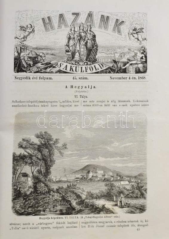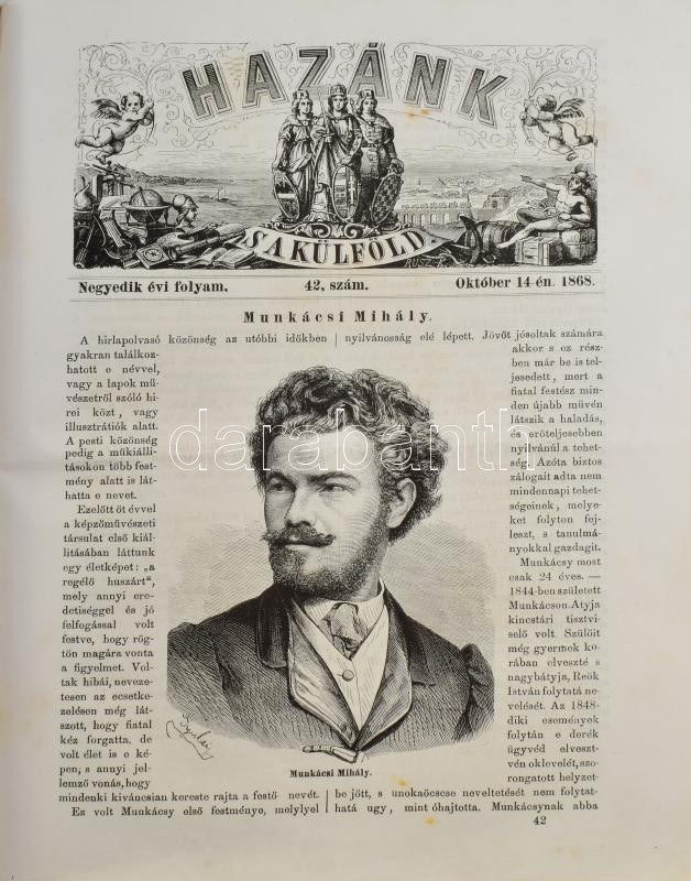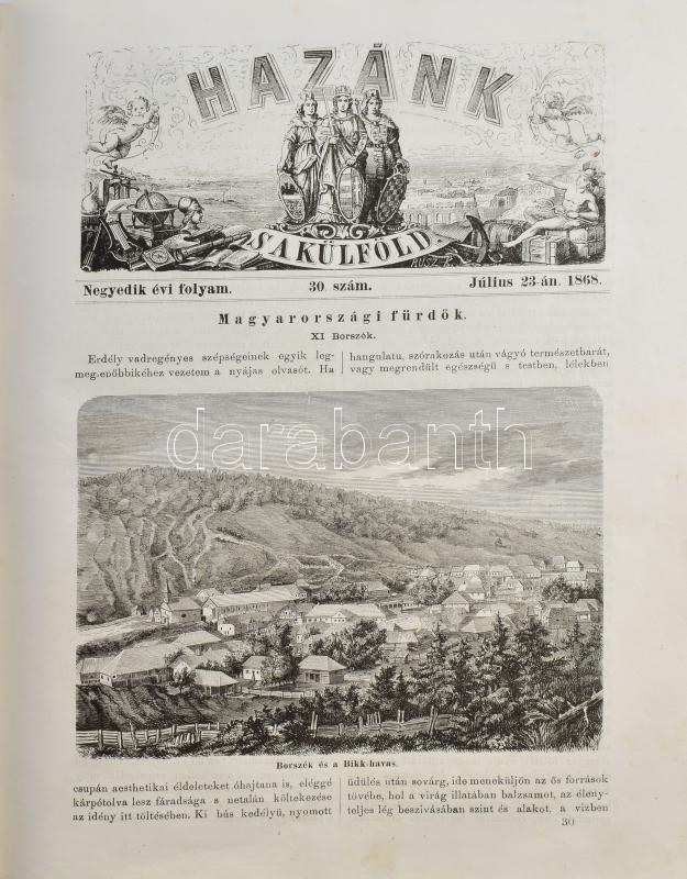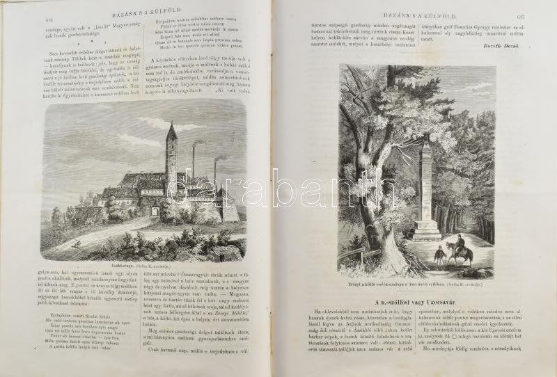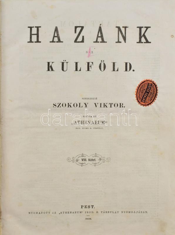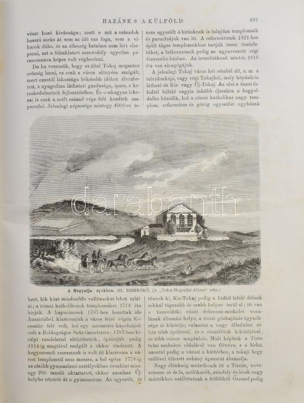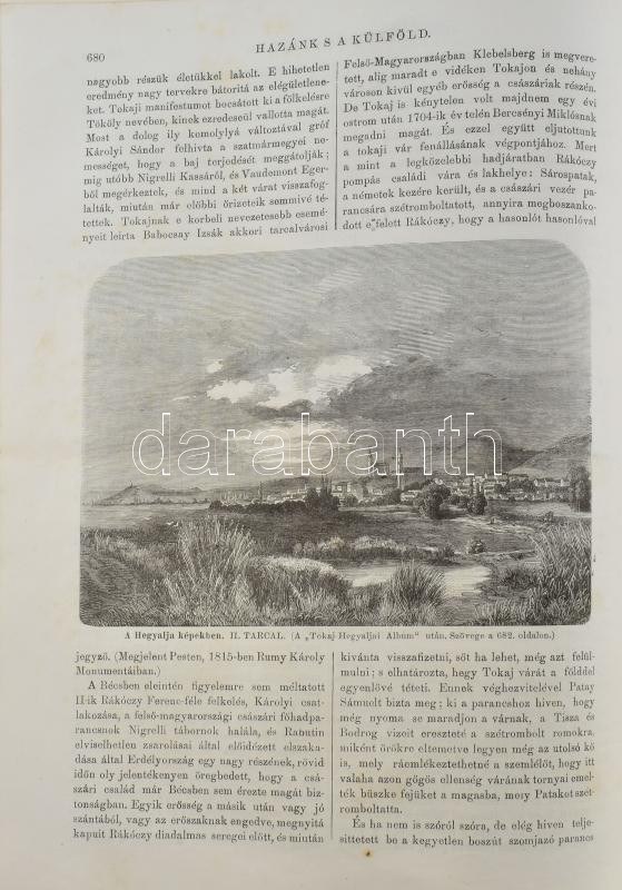 1868 Hazánk s a Külföld. VIII. kötet. IV. évf. 27-53. sz. 1868. Július 2 - december 31. Fél évfolyam. Szerkeszté Szokoly Viktor. Pest, 1868, Athenaeum, 4+417-848 p. Benne érdekes írásokkal, közte: Izlandi képek, A Balaton vidéke. Magyarországi fürdők, Erdélyi képek, Eger s eger -vidéki képek, Párisi képek, valamint: Zombory Gusztáv A Hegyalja képekben cikksorozattal, a cikk mellett tokaji helységek fametszetű illusztrációival. De benne 1848-49-hez kötődő írásokkal és képekkel is. Gazdag egészoldalas és szövegközti fametszetű képanyaggal, díszes fejlécekkel illusztrált, köztük helyszínképekkel Erdélyből, Balatonból, Tokajból, Izlandból, Párizsból...stb, valamint ismert emberek arcképével, közte Munkácsy Mihály, és József főherceg, Obrenovics Mihály szerb fejedelem...stb. Korabeli aranyozott gerincű félvászon-kötés, kopott borítóval, a gerincen kis sérüléssel, egy lap szélén ceruzás jegyzettel, egy lap alján kis hiánnyal, néhány kissé foltos lappal, de alapvetően jó állapotban.