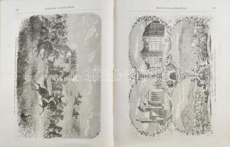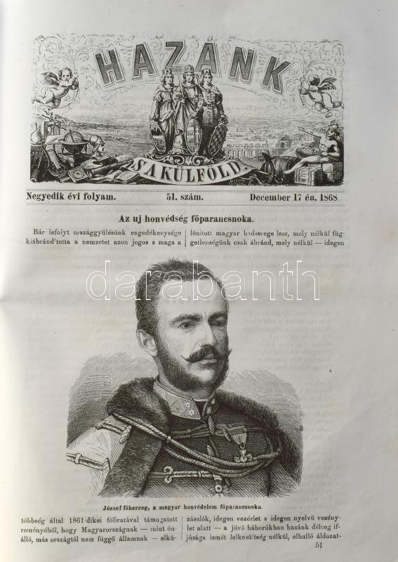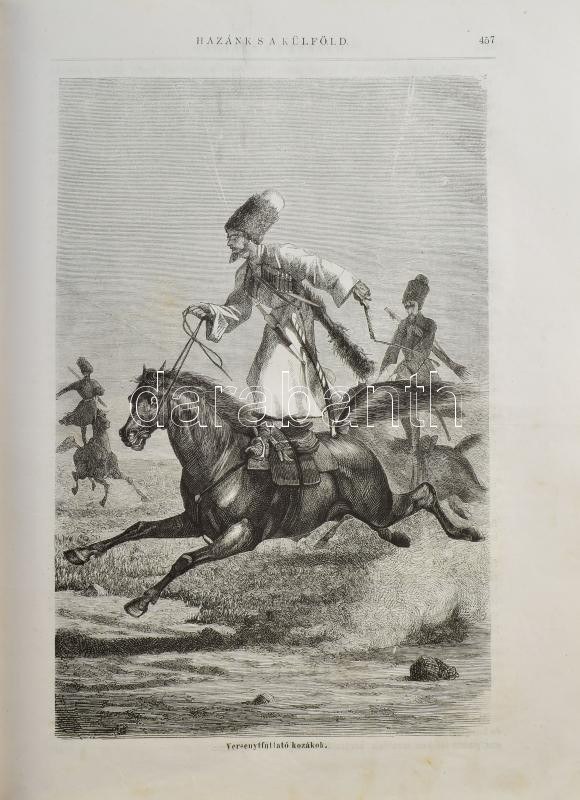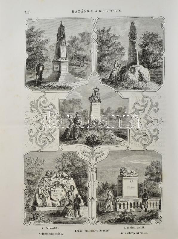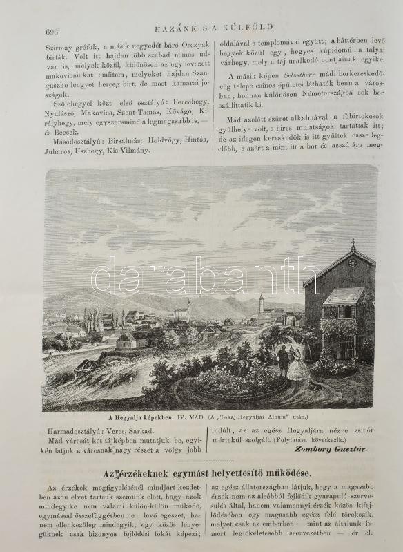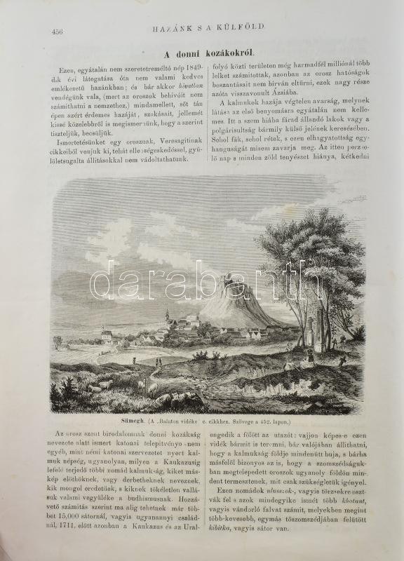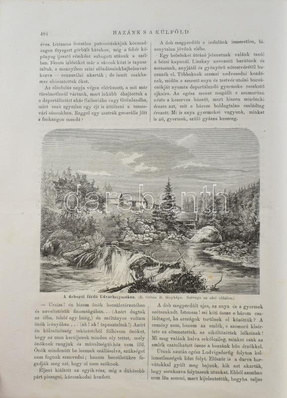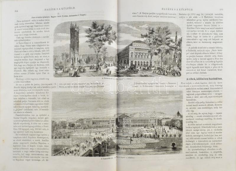 1868 Hazánk s a Külföld. VIII. kötet. IV. évf. 27-53. sz. 1868. Július 2 - december 31. Fél évfolyam. Szerkeszté Szokoly Viktor. Pest, 1868, Athenaeum, 4+417-848 p. Benne érdekes írásokkal, közte: Izlandi képek, A Balaton vidéke. Magyarországi fürdők, Erdélyi képek, Eger s eger -vidéki képek, Párisi képek, valamint: Zombory Gusztáv A Hegyalja képekben cikksorozattal, a cikk mellett tokaji helységek fametszetű illusztrációival. De benne 1848-49-hez kötődő írásokkal és képekkel is. Gazdag egészoldalas és szövegközti fametszetű képanyaggal, díszes fejlécekkel illusztrált, köztük helyszínképekkel Erdélyből, Balatonból, Tokajból, Izlandból, Párizsból...stb, valamint ismert emberek arcképével, közte Munkácsy Mihály, és József főherceg, Obrenovics Mihály szerb fejedelem...stb. Korabeli aranyozott gerincű félvászon-kötés, kopott borítóval, a gerincen kis sérüléssel, egy lap szélén ceruzás jegyzettel, egy lap alján kis hiánnyal, néhány kissé foltos lappal, de alapvetően jó állapotban.