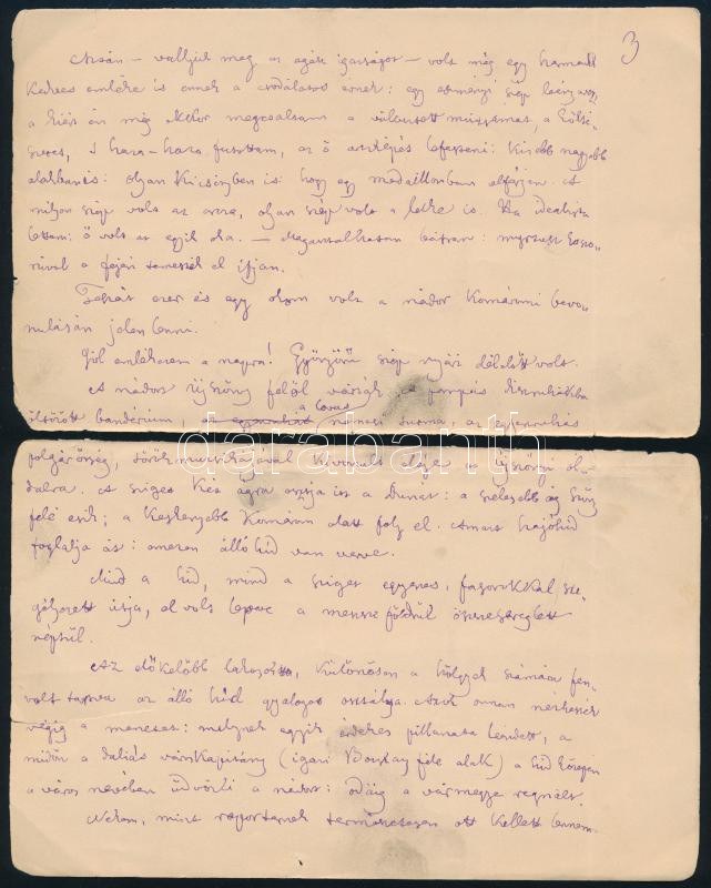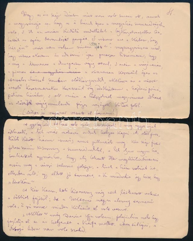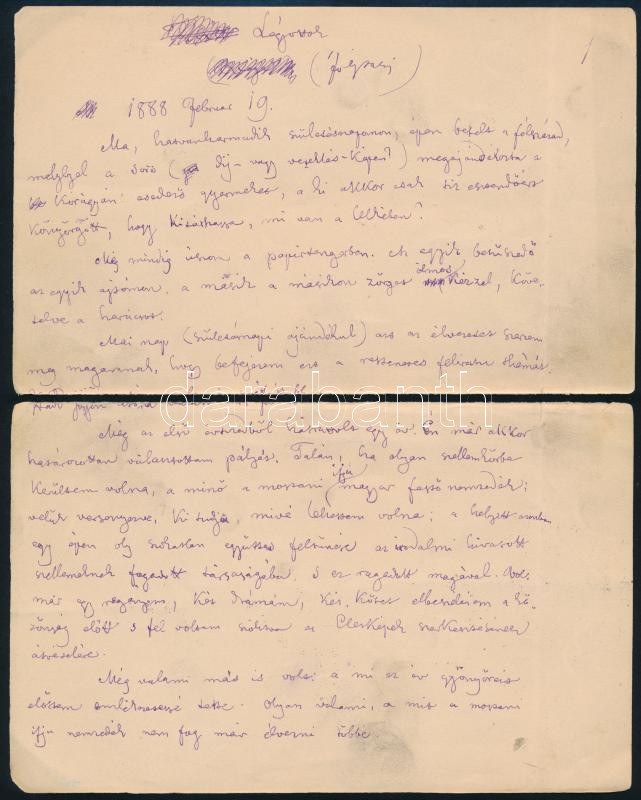 1888 Jókai Mór (1825-1904) író autográf kézirata. Légyottok címmel. Jókai a Magyar Szalon 1888-as évfolyamában hat részletben közölt egy visszaem- lékezést Légyottok a halállal címmel, amelyet a halállal való szembesülés élményei szerveznek egységgé. E szövegben Jókai felidézi például a gyermekkori be- tegségeket, a kertben játszott bogártemetéseket, az édesapa elvesztését vagy éppen a komáromi híd leszakadását.A halálnemtő három alkalommal próbálja meg magával ragadni a főhőst, az pedig mindannyiszor alkudozni próbál vele ? tíz évet kér az ötleteinek megvalósításához, míg végül ötvenet kap tőle. E konkrét szöveg a születésnapján íródott. Öt beírt lapon, a lapok a hajtásnál elszakadtak.