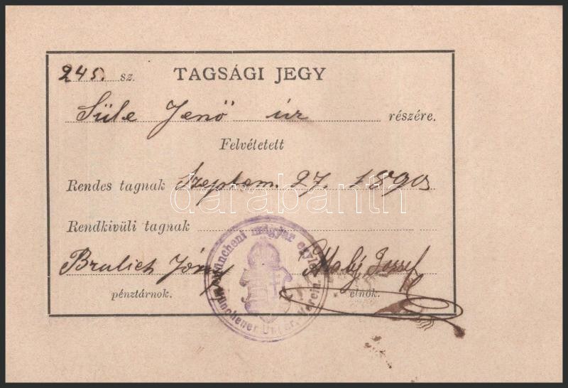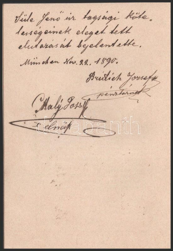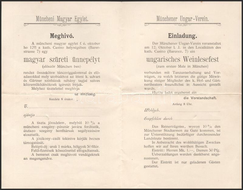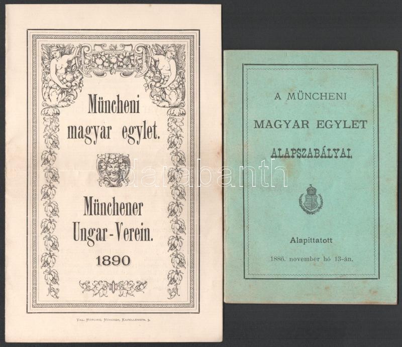1889-1890 A Müncheni Magyar Egylet alapszabályai. (Alapittatott 1886. november hó 13-án.) Pécs, 1889, Lyceumi-ny. (Feiler Mihály), 23+(9) p. Benne tagsági jegy Süle Jenő részére, illetve elutazás bejelentését igazoló bejegyzés. Kiadói tűzött papírkötés, megkímélt állapotban, kissé foltos borítóval. Ritka! + A Müncheni Magyar Egylet (Münchener Ungar-Verein) meghívója Münchenben először rendezett magyar szüreti ünnepélyre, magyar és német nyelven, 2 sztl. lev.