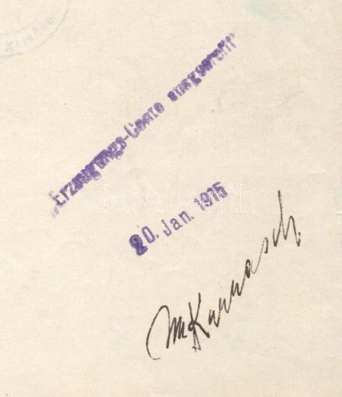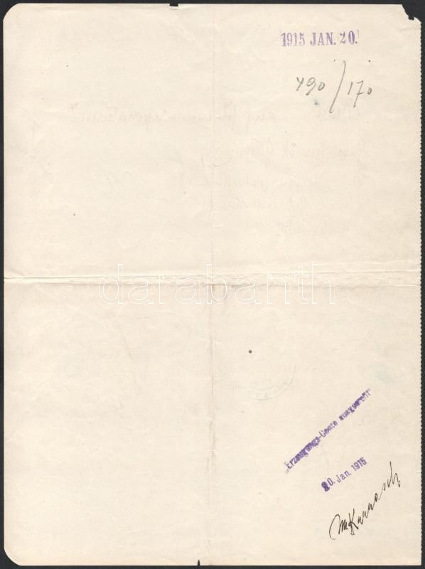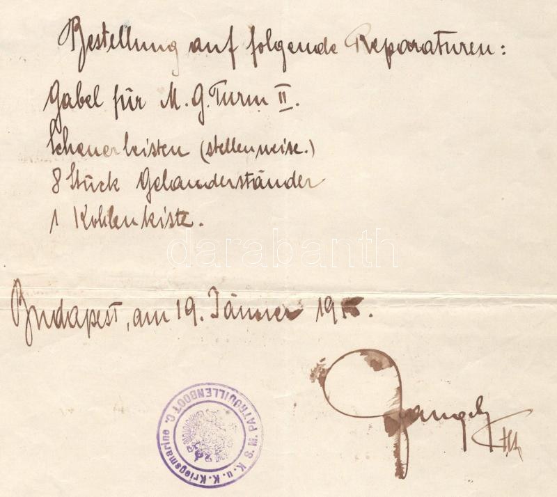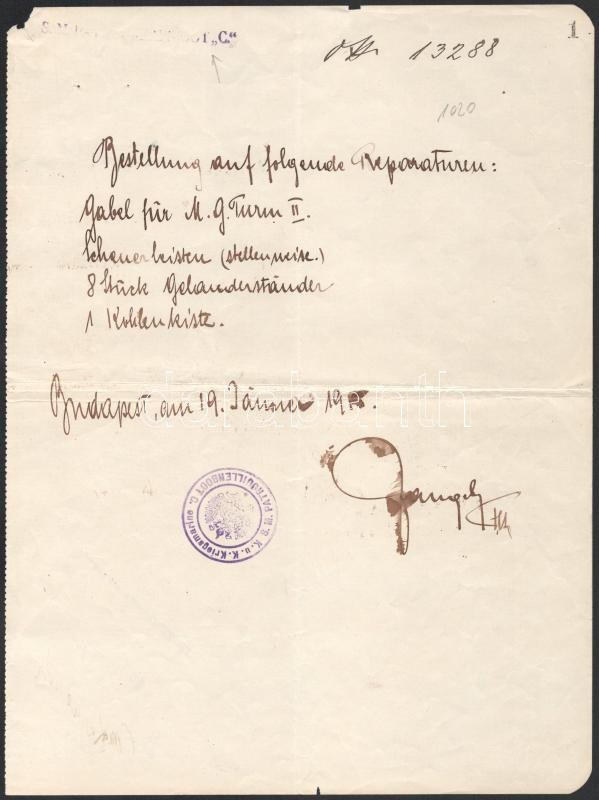 1915 Az S.M.Pb. C - Dunai Flottila hajó rendelés, nagyon ritka hajópecséttekkel, egy összesen 10 hónapot szolgált kis hajóról. Rendkívül ritka! Handwritten order for the repair of four pieces of equipment of S.M.Pb. ?c?, dated in Budapest, January 19, 2015. Probably unique item from a small patrol boat (only 14 crewmembers) that was in service for barely ten months before being destroyed in battle against Serbian shore batteries. A great piece only for grand collections! K.u.K. Kriegsmarine S.M. PATROUILLENBOOT "C" Kalis/Kohl No. 1 [type DR 2c] violet ? and S.M. PATROUILLENBOOT "C" Kalis/Kohl No. 2 [type DL 1b] violet