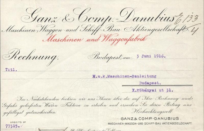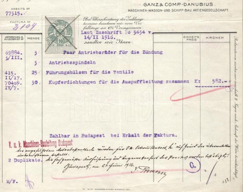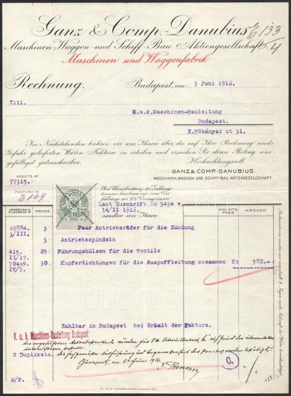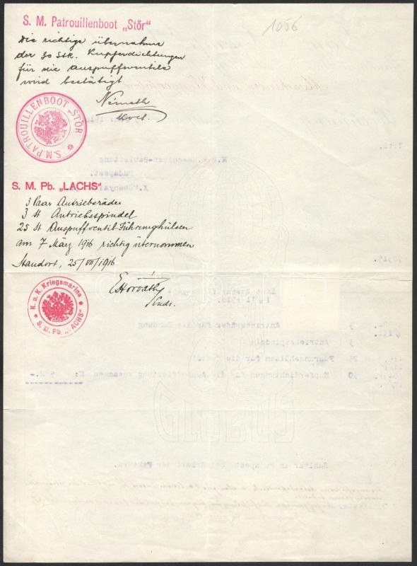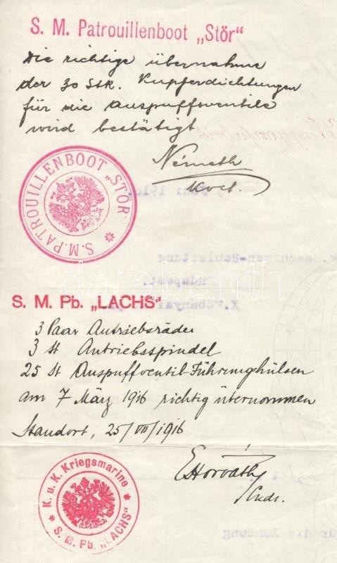 1916 Az S.M.Pb. Lachs és Stör - Dunai Flottila hajók: Számla, nagyon ritka hajópecséttekkel Invoice from Ganz & Comp.-Danubius addressed to the k.u.k. Maschinen-Bauleitung Budapest, dated June 3, 1916, listing several pieces of equipment. On the back ofthe invoice are what appear to be handwritten receipts for the parts that went to S.M.Pb. Lachs and Stör (q.v.), signed by their respective commanding officers A unique document with one seldom seen and one unlisted seal! K.u.K. Kriegsmarine * S.M.Pb. "LACHS" Kalis/Kohl No. 1 [type DR 1c] red ? and One-line seal: S.M. Pb. "LACHS" Seal type DL 1b unlisted in Kalis/Kohl, red