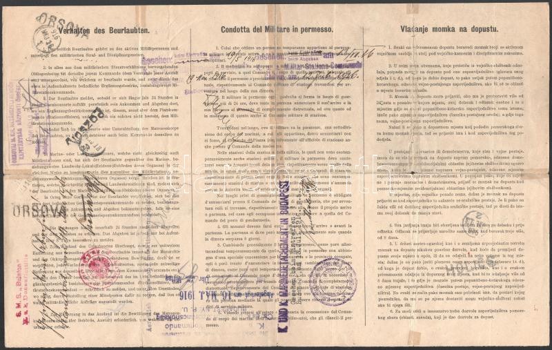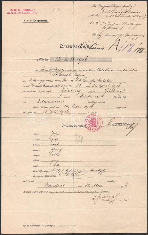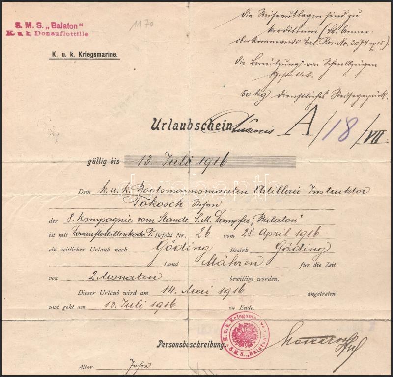 1916 Dunai Flottila.S.M. S. Balaton. Háromnyelvű utazási igazolás Tokos István matróznak, ritka hajópecsétekkel...