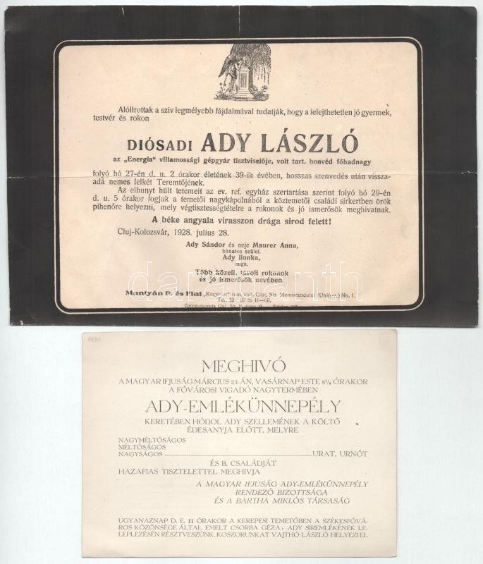 1928 dióasadi Ady László, Ady Endre testvérének halotti értesítője 24x14 cm + Meghívó Ady emlékünnepélyre...