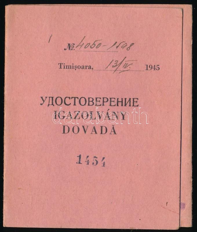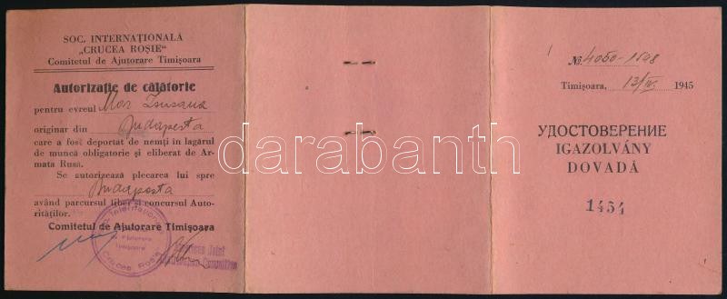 1945 Temesvár, Nemzetközi Vöröskereszt keretében működő temesvári Segítő Bizottság fényképes igazolvánbya Mór Zsuzsanna budapesti illetőségű zsidó személy részére, akit a németek kényszermunkára deportáltak és a Vörös Hadsereg felszabadított. A temesvári Segítő Bizottság pecsétjével, aláírással, magyar és orosz nyelven.