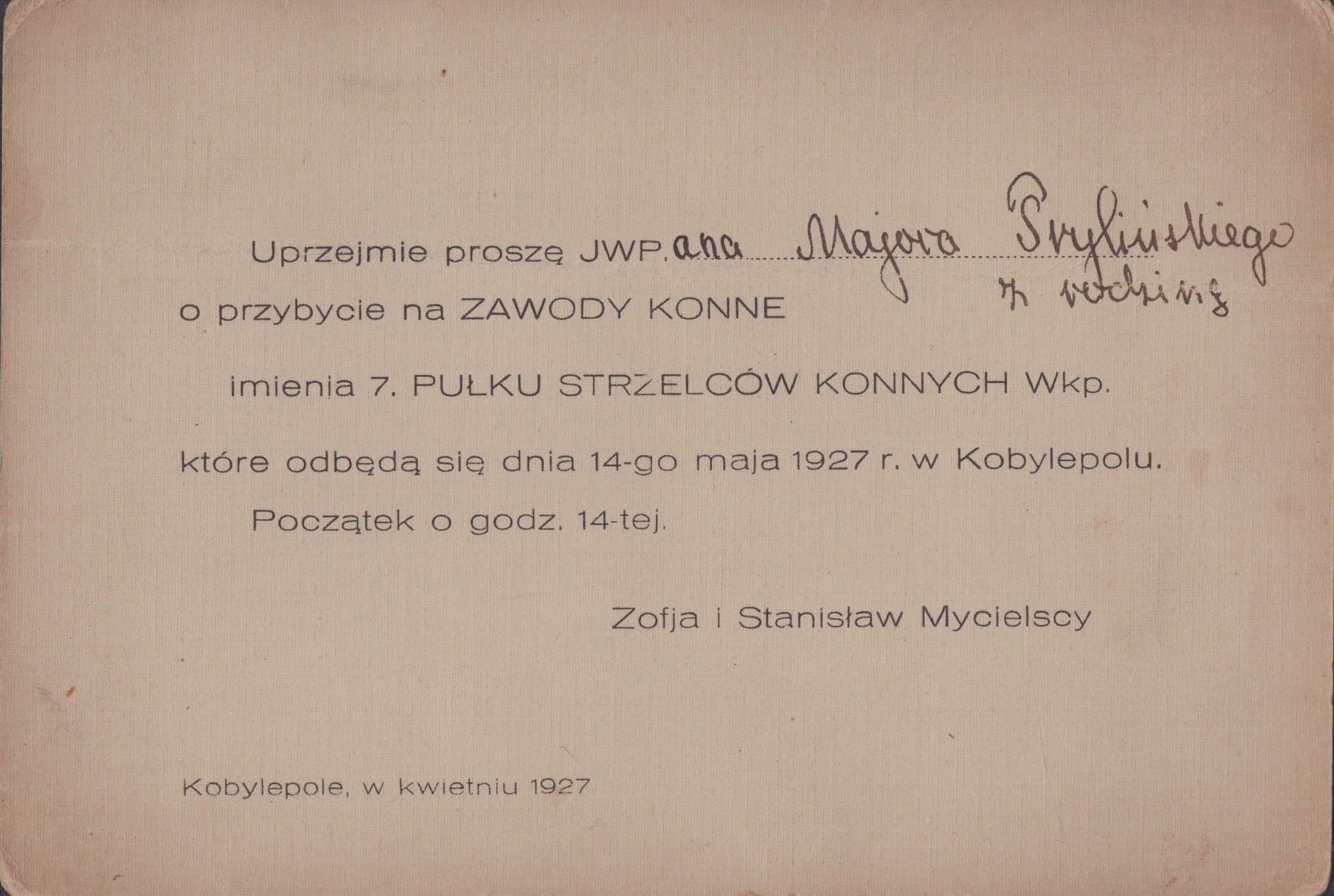 7. Pułk Strzelców Konnych Wkp.] Zaproszenie na Zawody Konne imienia 7. Pułku Strzelców Konnych Wkp. na 14 V 1927 w Kobylepolu