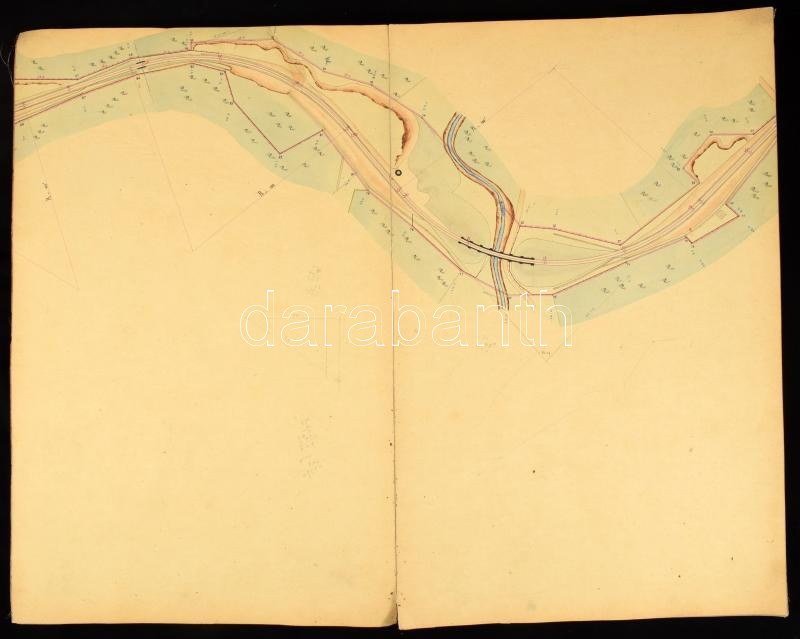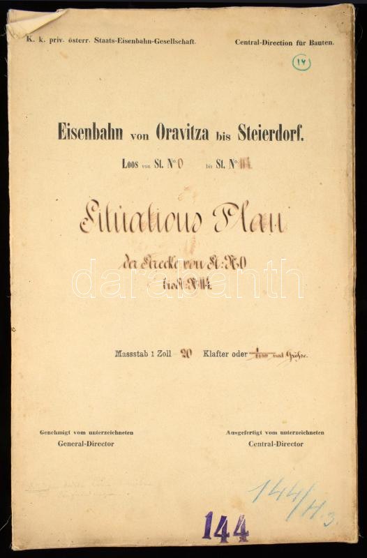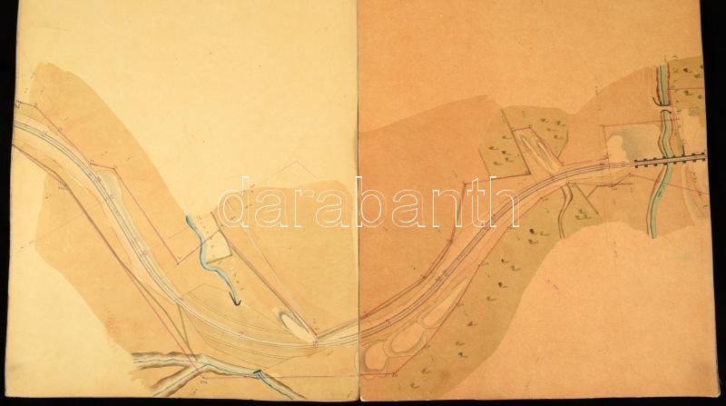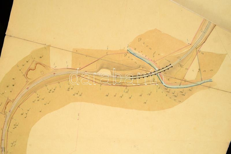 ca 1860 Oravicabánya - Stájerlak (Eisenbahn von Oravitza bis Steierdorf) vasútvonal kézzel rajzolt hosszelvénye. 450x38 cm Látványos, nagy méretű tervrajz. Egyedi ritkaság Európa egyik legszebb vonalvezetésű vasútvonaláról. Az Oravicabánya (Oraviţa) ? Stájerlak-Anina (Anina) vasútvonalat a történelme és vonalvezetése miatt teljes joggal hasonlítják Európa egyik legszebb hegyi vasútjához, az osztrák Semmering-vasúthoz. Építésük azonos korszakra tehető, a mérnökök köre és az építmények jellege is nagyjából megegyezik. Az aninai vasút azonban kimondottan teherszállítás céljára épült, ezért a vonalvezetése is sokkal vadregényesebb, az alacsony sebesség ellenére ? vagy inkább azért ? az utazás egy életre szóló élmény. / ca 1860 Hand-drawn longitudinal section of the Oravicabánya - Stájerlak (Eisenbahn von Oravitza bis Steierdorf) railway line. 450x38 cm Spectacular, large-scale plan. A unique rarity of one of the most beautiful railway lines in Europe. The Oravicabánya (Oraviţa) ? Stájerlak-Anina (Anina) railway line, due to its history and layout, is rightly compared to one of the most beautiful mountain railways in Europe, the Austrian Semmering Railway. Their construction can be dated to the same era, the range of engineers and the nature of the structures are also roughly the same. However, the Anina railway was built specifically for freight transport, so its layout is much more wildly novel, and despite the low speed ? or rather because of it ? the journey is an experience of a lifetime.