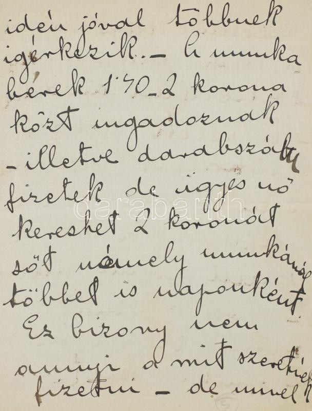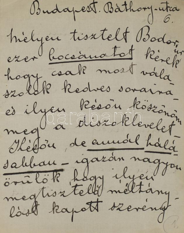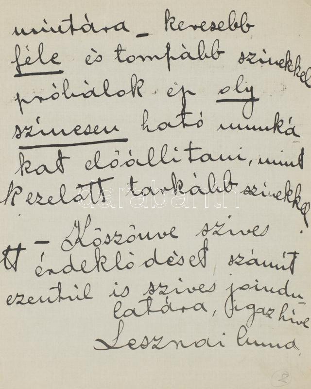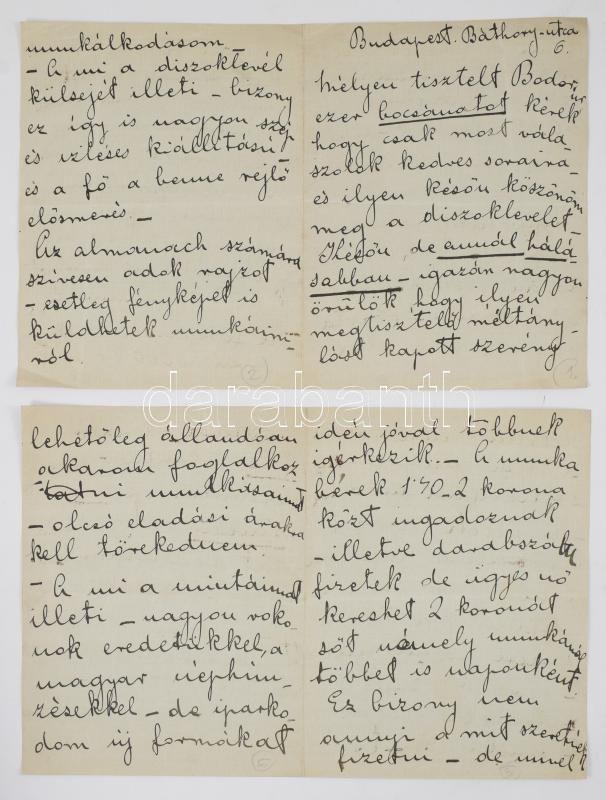 ca 1912 Lesznai Anna (1885-1966) költő, író, grafikus, iparművész, a Nyolcak vendégtagjának izgalmas autográf levele dr. Bodor Antal (1886-1954) szociográfus, falukutatónak. A levélben megköszöni a munkáinak kiállításáért kapott díszoklevelet és részletesen ír munkáinak készítéséről, a keze alá dolgozó körtvélyesi munkásnők fizetéséről, eladási lehetőségeiről "nincs még két éve, hogy a Nyolczak kiállításán először szerepeltek a dolgaim - s azóta bizony sokszor nehéz eladási viszonyok között elég bátran tartottuk magunkat," "... még Kairóba is kerülnek körtvélyesi munkák" Az alkalmazott díszítésmódról szinte ars poeticaként is felfoghatóan: "Ami mintáimat illeti - nagyon rokonok eredetiekkel, a magyar néphímzésekkel - de iparkodom új formákat kezelni ugyanazzal a régi hagyományos stilizálási móddal - a keleti jellegét megpró bálom megóvni a magyar stílusnak. Újabban a tarka színű holmi mellett - kevesebb színűt is varratok - stb..." 8 kézzel beírt oldal