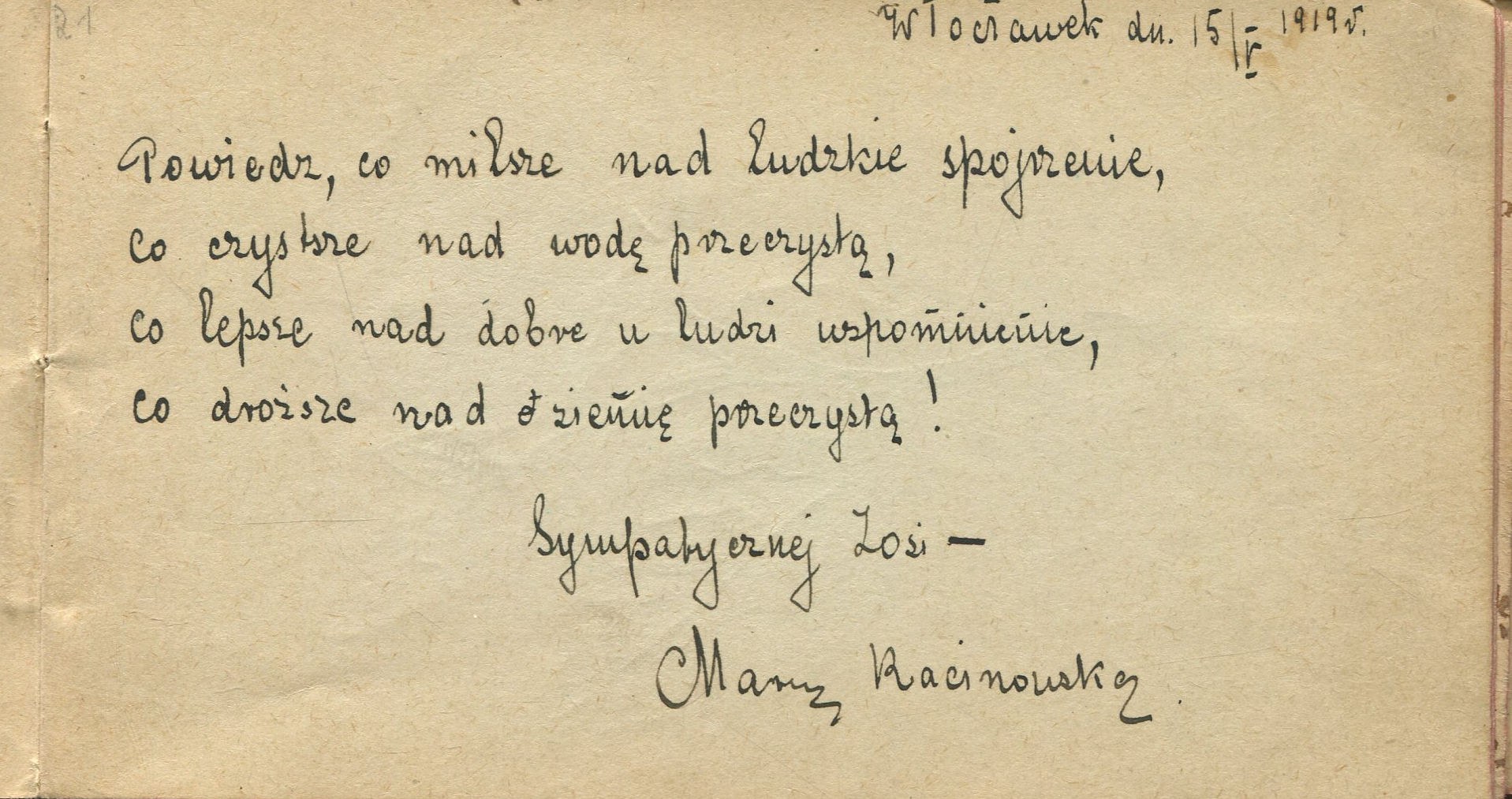 Pamiętnik zamieszkałej we Włocławku Zosi Nowickiej. Zawiera ponad trzydzieści wpisów z lat 1919-1921.