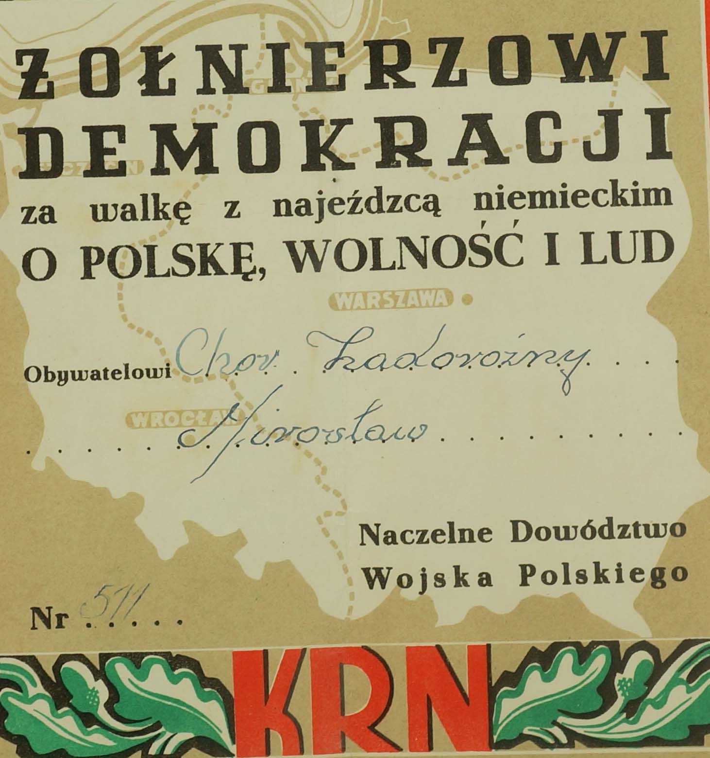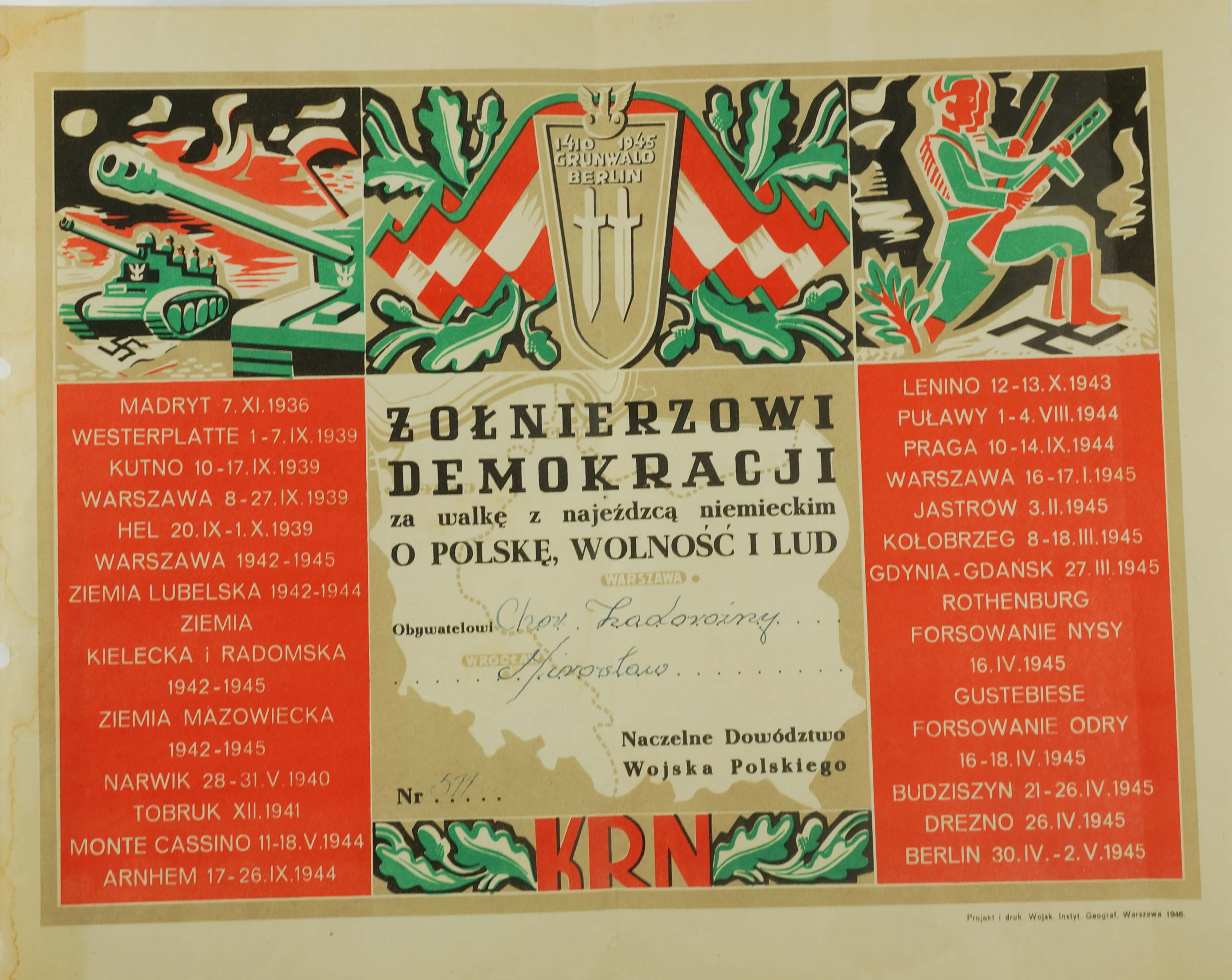Dyplom "Żołnierzowi demokracji za walkę z najeźdźcą niemieckim o Polskę, wolność i lud", litografia barwna, papier , przyznany chorążemu Mirosławowi Zadorożnemu [inne dokumenty po tym żołnierzu - na tej aukcji], projekt i druk Wojsk. Instyt. Geograf., Warszawa 1946, f. 35x28,5cm