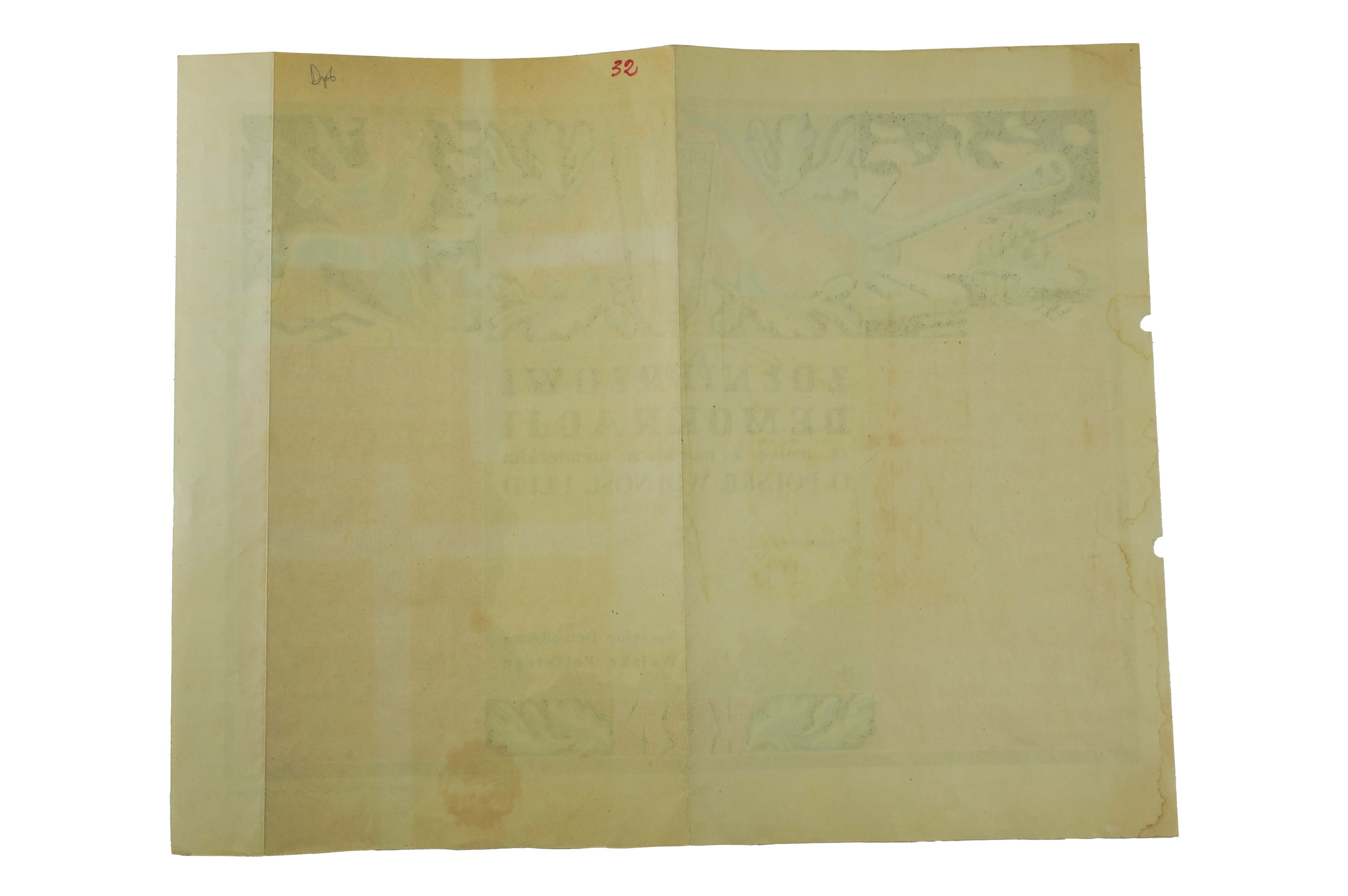 ubytki [po przedziurkowaniu] na lewym brzegu dyplomu, ślady zaplamienia na lewym brzegu, ślad składania, poza tym stan dobry