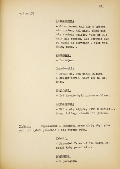 Maszynopis powiel. na 155 kartach form. 28,4x20,5 cm, opr. oryg. pł. Scenopis opracował Henryk Bielski dla Zespołu Filmowego "Iluzjon". Film został zrealizowany, premierę miał w III 1978. Reżyserował H. Bielski, w rolach głównych wystąpili: J. Paluszkiewicz, J. Kłosiński, A. Ferency, Z. Zapasiewicz, E. Ziętek. "Bohater filmu - rencista Sypniewski, staje pewnego dnia przed niecodziennym zadaniem - musi utopić małe koty. Zadanie to, które z rozmaitych powodów staje się dla starego człowieka niewykonalne, jest pretekstem do ukazania szerszego społecznego tła dzisiejszej stolicy, braku porozumienia między starszym a młodszym pokoleniem, a także do zarysowania obyczajów tak nowej Warszawy, jak i odchodzącej już w zapomnienie" (filmpolski.pl). Odbito w 40 egz. Grzbiet reperowany, podklejone naddarcie karty tyt.