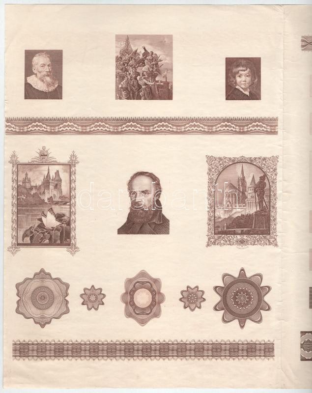 Horváth Endre (1896-1954) festőművész és grafikus különböző munkáinak rézmetszet tervei hajtott lapon, közte 1973. Táncsics Próba Forma, Vajdahunyad vár, Mátyás-templom (350x499mm) T:XF / Several copperplate designs on one sheet of Hungarian painter and graphic artist Endre Horváth (1896-1954), including reverse design of the 1940. 2 Pengő banknote, Vajdahunyad castle and Saint Emeric stamp design (350x499mm) C:XF