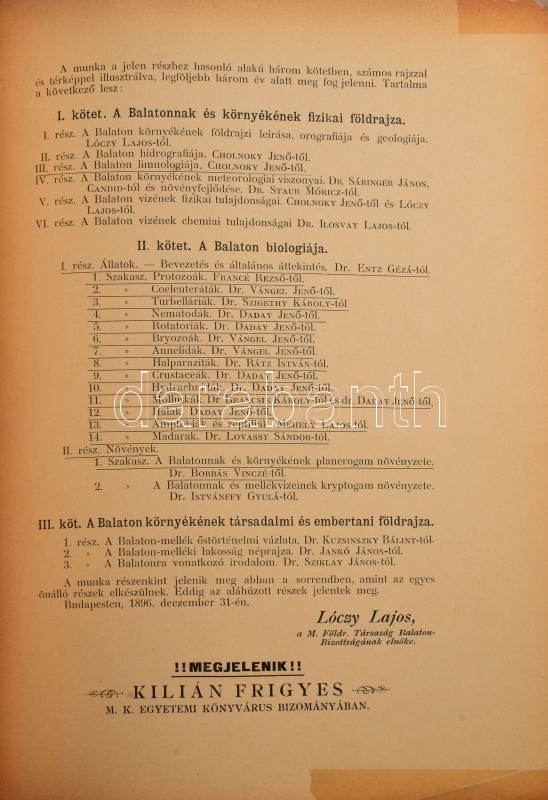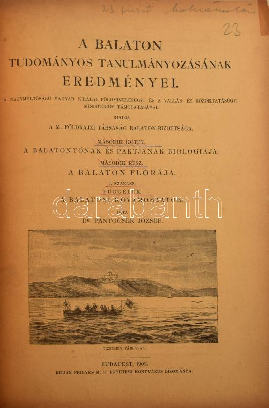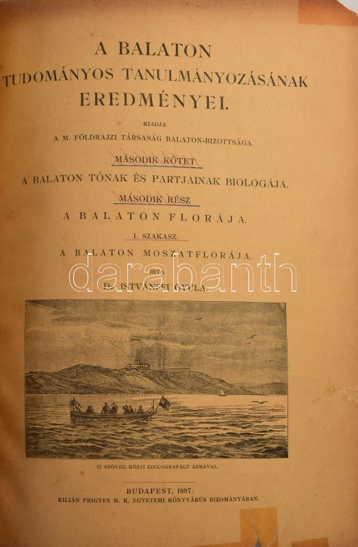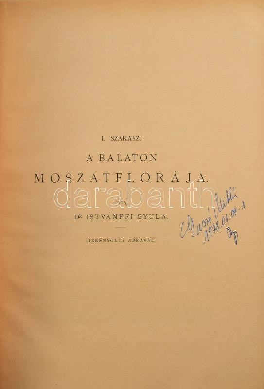 Istvánffi Gyula: A Balaton moszatflórája. Hozzákötve: Pantocsek József: A Balatoni kovamoszatok. Kiadja: Magyar Földrajzi Társaság Balaton-Bizottsága. A Balaton tudományos tanulmányozásának eredményei II. köt.: A Balaton-tónak és partjának biologiája. II. rész: A Balaton flórája. I. szakasz és I. szakasz Függelék.; Bp., 1897-1902, Kilián Frigyes, (Hornyánszky-ny.), 140+2;+142+2 p.+XVII (táblák előtt magyarázó lapokkal) t. Szövegközti fekete-fehér illusztrációkkal. Bekötött papírborítókkal, közte javított. Átkötött modern egészvászon-kötés, jó állapotban.